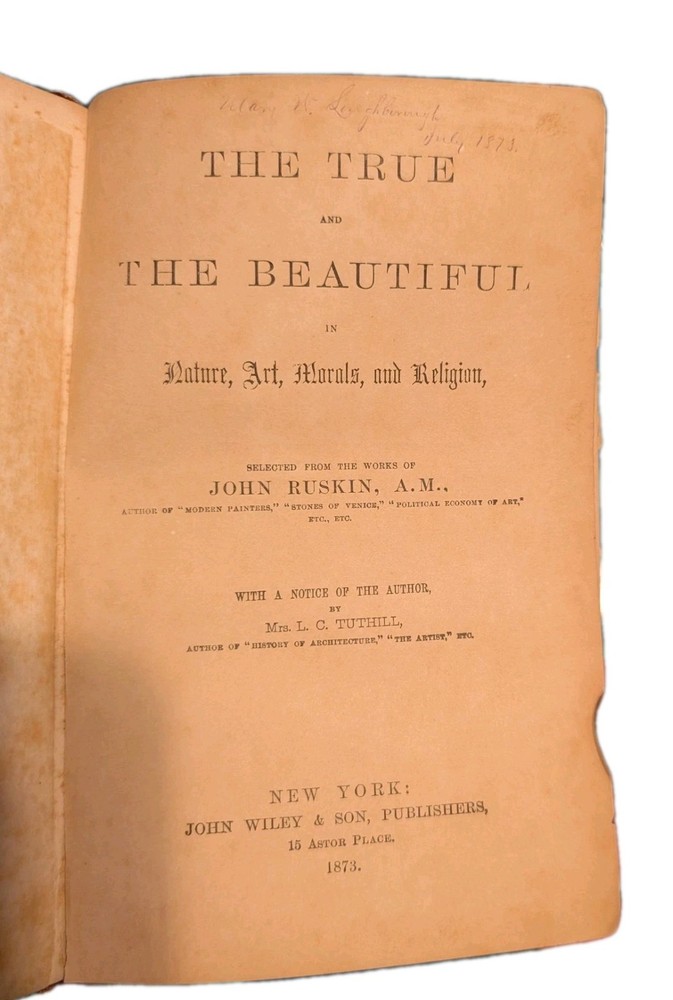 Up for auction is a rare and valuable copy of "The True And The Beautiful" by John Ruskin, published in 1858 by Wiley & Halstead in New York. This original edition is bound in beautiful leather and features gilded special attributes. The book is in excellent shape and is a great addition to any antique book collection. The book is written in English and is about the topic of religion. This item is a must-have for any serious collector and is sure to impress. It's a little worse for wear, but still fully intact.