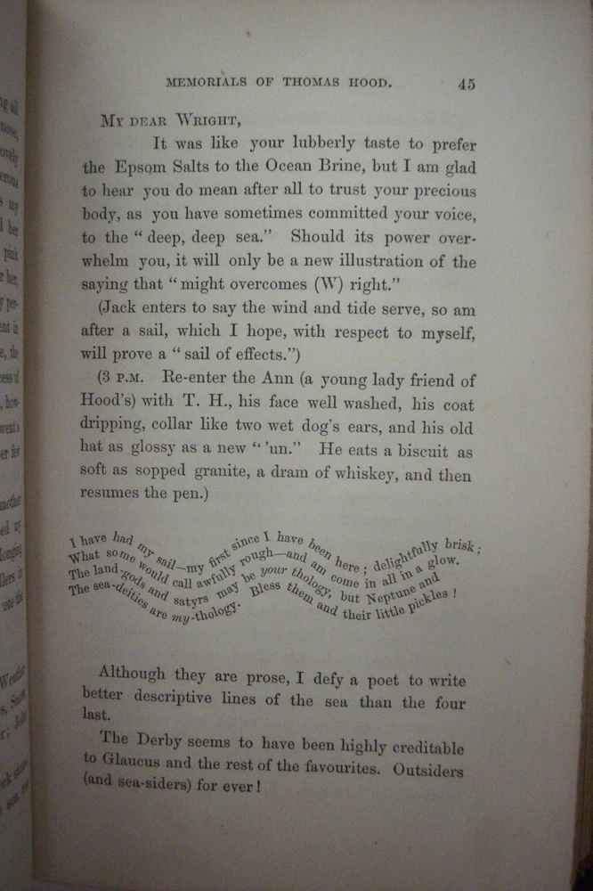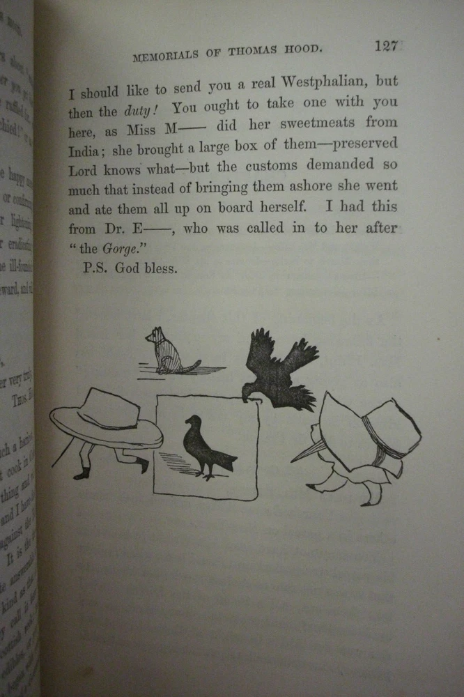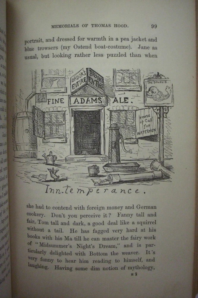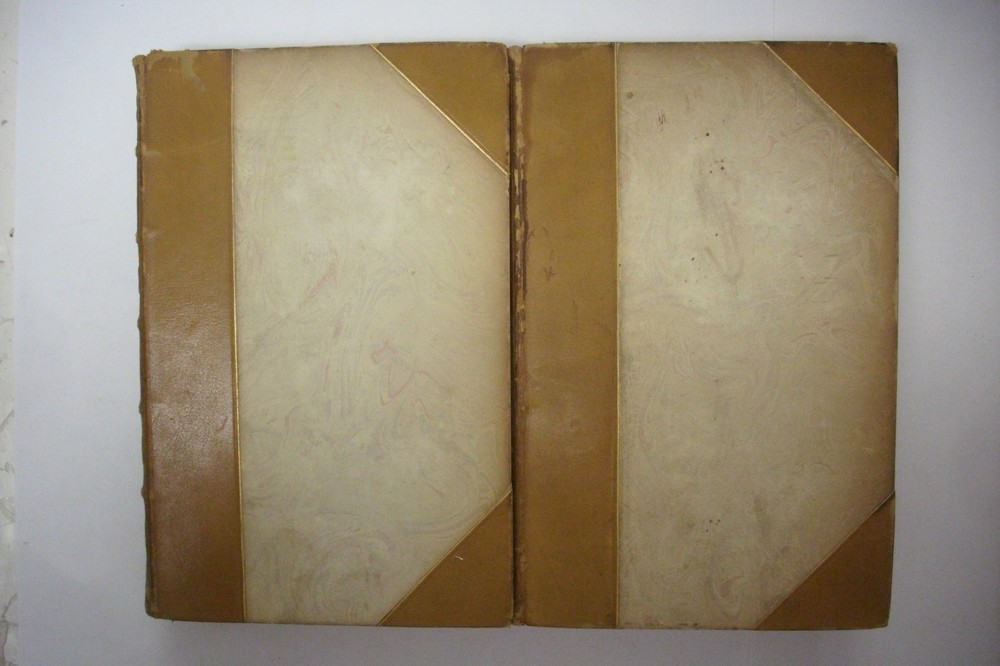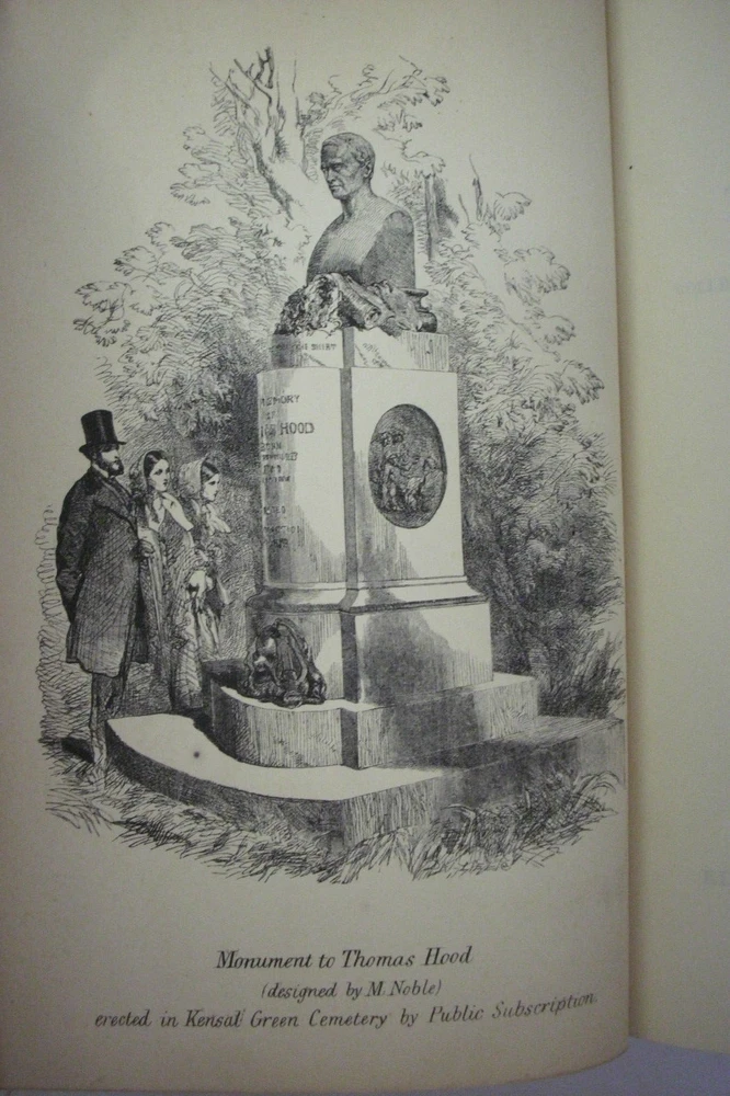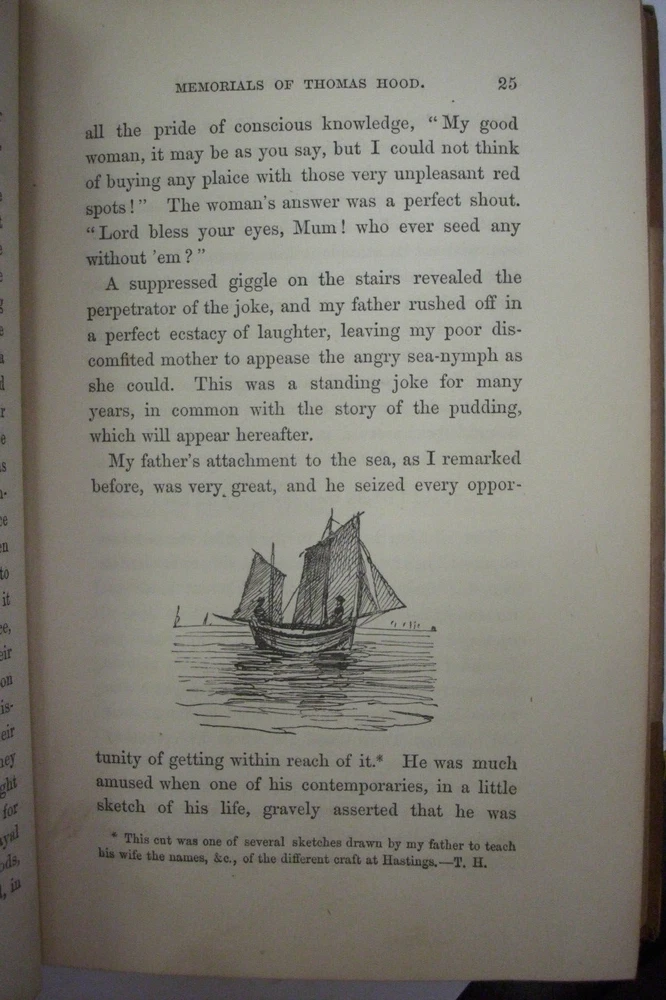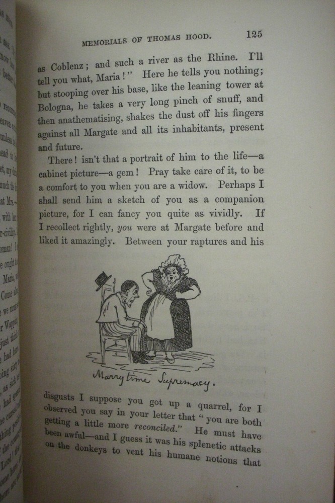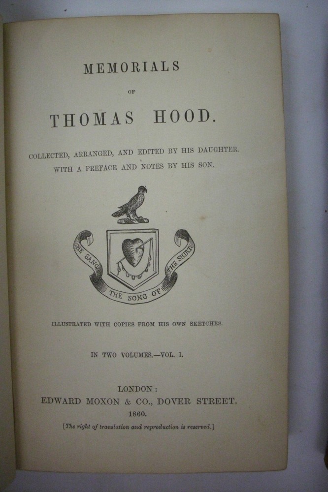 You are bidding on a rare set of antique hardcover books titled Memorials of Thomas Hood. Selected, Arranged and Edited by His Daughter, with a Preface and Notes by His Son. Illustrated with Copies From His Own Sketches. Published in London by Edward Moxon & Co., 1860. This is the scarce and collectible First Edition. The set is complete in two volumes and you are bidding on both volumes. It is a matching set. The first full-dress account of Hood, in the form of an autobiography fashioned out of his papers by his children, Thomas Hood Jr. and Frances Freeling Broderip. Included are many important letters, details of his publications, uncollected poems, etc., as well as information on his relationships with other writers of the period, including Dickens. With a frontispiece in each volume (one a folding facsimile plate). Books are quarter-bound in polished leather with leather tips. Covers firmly attached with no cracking or splitting of hinges. The spines have raised bands with gold lettering on red morocco labels. There are gold designs in the spine compartments. The volume numbers on the spines probably were once on leather labels. Pages are clean and tightly bound. Has decorative endpages. Top edge of pages has gilt edge. No writing in books and no signs of previous ownership. The set shows some corner/edge wear and some overall gentle wear and remains in very good condition. Great gift idea! (Inventory: Box 29-A) Track Page Views With Auctiva's FREE Counter