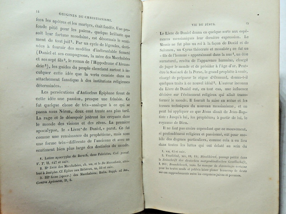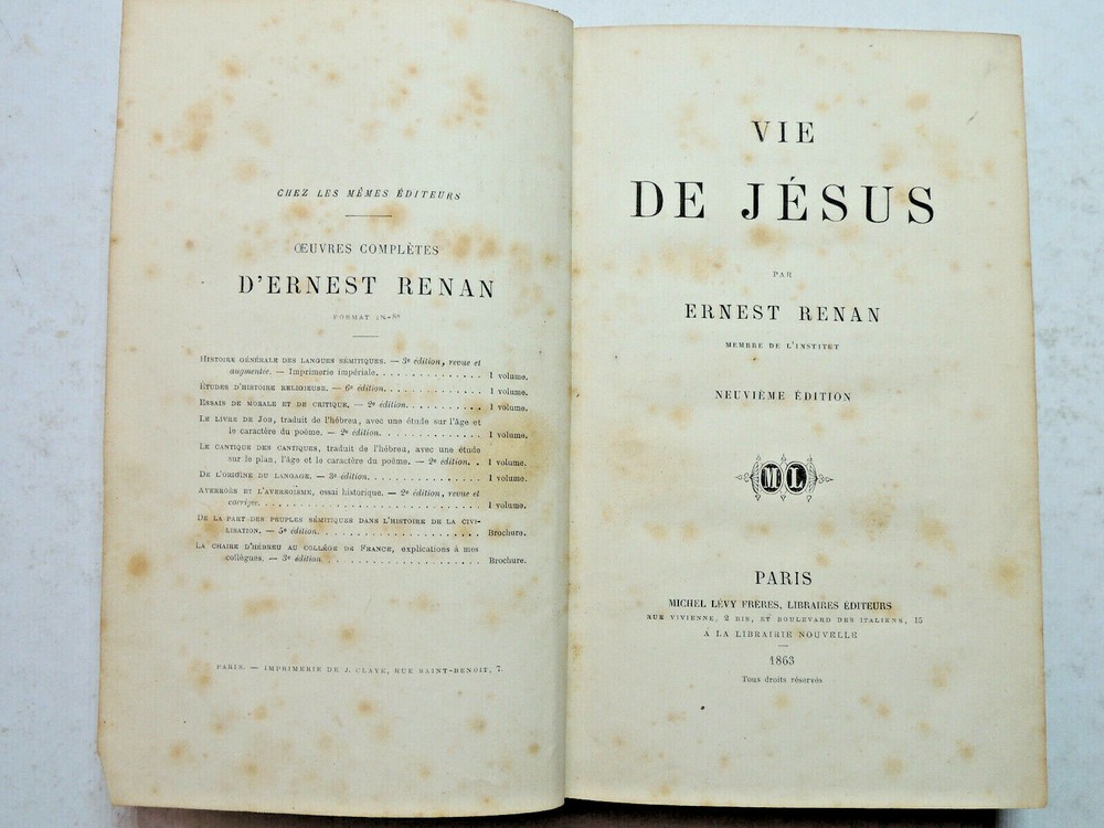 1863. Ernest Renan. The Life of Jesus. Original Edition. The description of this item has been automatically translated. If you have any questions, please feel free to contact us. Ernest Renan. The life of Jesus The life of Jesus is an essay by Ernest Renan, published in 1863. It is the first volume of a larger project, the history of the origins of Christianity (eight volumes published between 1863 and 1883). This European bestseller caused a scandal in France because the philologist and historian presents Jesus as a high legal personality, rejecting his divinity and any intervention of the supernatural. Edition published the year of the original. "Work of art and science, the life of Jesus raised storms in a country where biblical studies were late compared to the science of Tübingen and Heidelberg (.) This conception of a romantic Christ, philosopher Incomparable, had been reinforced by his stay in Lebanon and in Galilee where he had found in nature and people a fifth gospel filling the inadequacies of the historical documentation of Jesus. The imagination of the poet-writer made his book a work of art which survives the criticisms of more radical historians who followed him ”. Vicar VI, 1016 for the original edition. Inficated volume, 230x180, half-cooker, very beautiful interior condition, qq freckles, 462p. Paris, M. Lévy, 1863. Original Edition. Ref/224 The life of Jesus is an essay by Ernest Renan, published in 1863. It is the first volume of a larger project, the history of the origins of Christianity (eight volumes published between 1863 and 1883). This European bestseller caused a scandal in France because the philologist and historian presents Jesus as a high legal personality, rejecting his divinity and any intervention of the supernatural. Edition published the year of the original. "Work of art and science, the life of Jesus raised storms in a country where biblical studies were late compared to the science of Tübingen and Heidelberg (.) This conception of a romantic Christ, philosopher Incomparable, had been reinforced by his stay in Lebanon and in Galilee where he had found in nature and people a fifth gospel filling the inadequ Recommended products Provided by Parisian Life. Ernest Legouvé. Parisian Lectures 1872. First Edition View item Jerome and Jean THARAUD / The Rose of Saron Copy of the Original Edition View item Pierre Benoît. The Lunch of Sousceyrac. 1931. Original Edition View item Henry de Montherlant. The Dream. Year of the Original Edition. 1922 View item Georges Ohnet. The Right of the Child. "The Battles of Life" View item J. Vilbort. The Work of Bismarck 1863-1866. Sadowa & the Campaign of Seven Days View item Jean Giraudoux. The Adventures of Jérôme Bardini. Original Edition. 1930 View item Original Edition. André Maurois. The Silences of Colonel Bramble. 1918 View item Reliure Cuir Caractéristiques spéciales Édition originale Langue Français Époque XIXème Sujet Histoire
