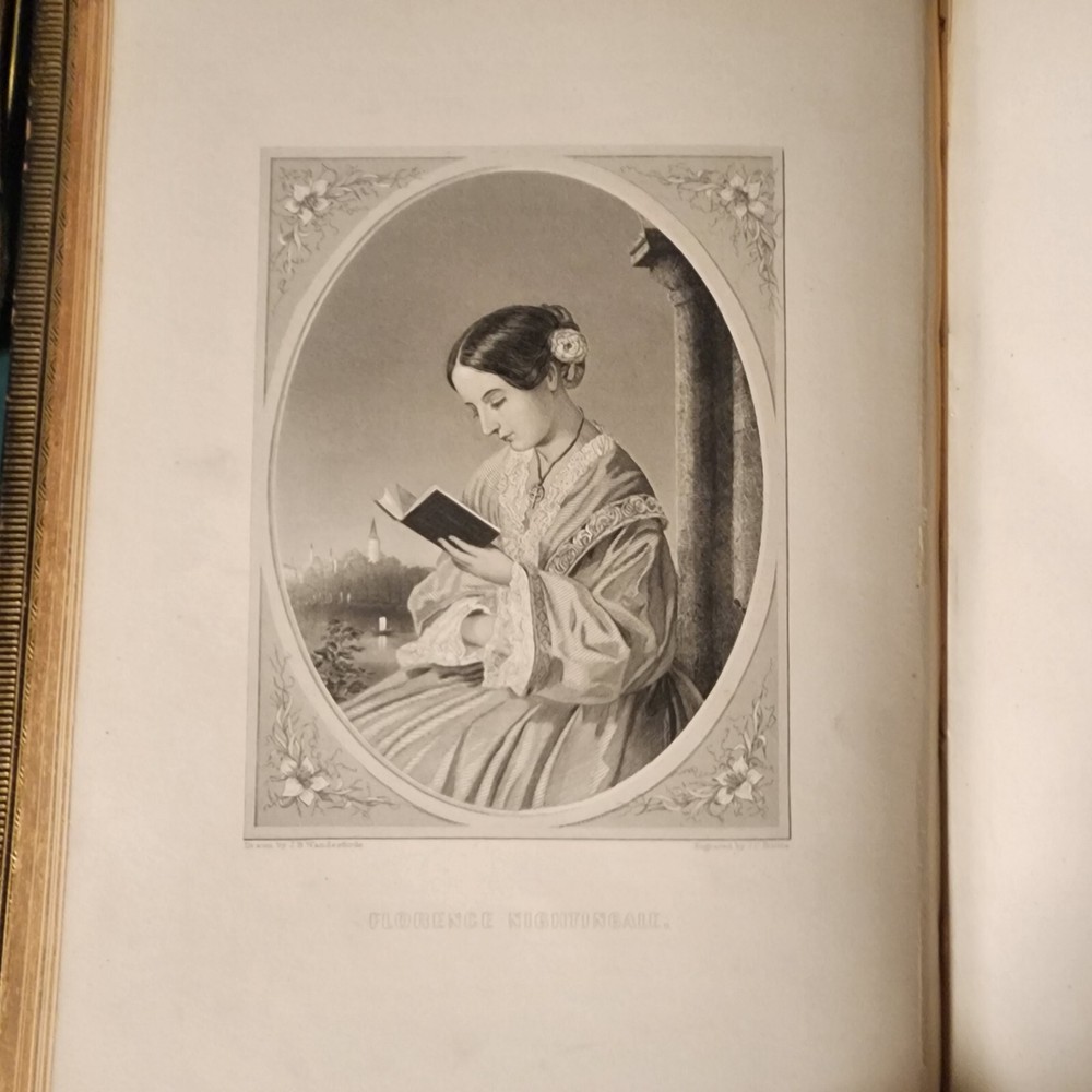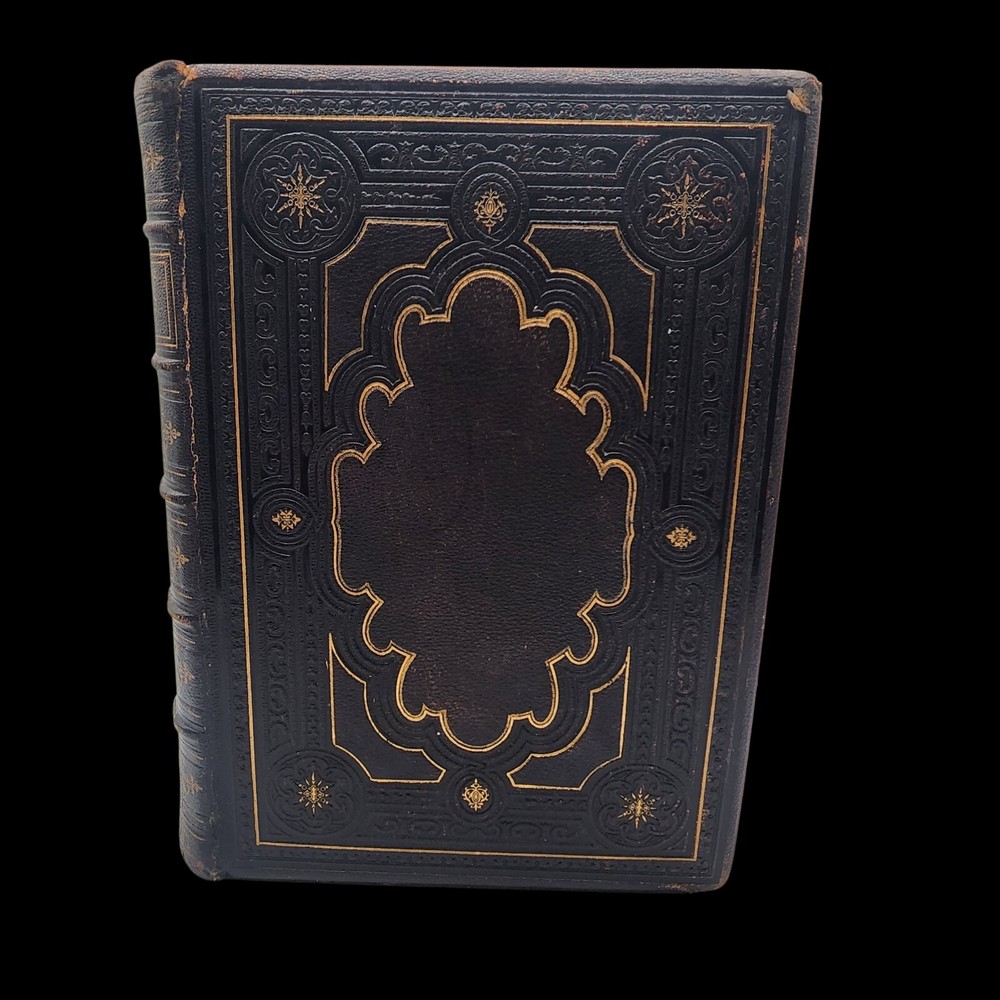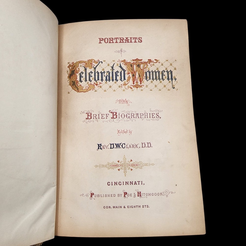 1863 Portraits Of Celebrated Woman W/Brief Biographies.Ornately Bound In leather. The book is bound and ornately embossed black leather, with guilt edges, five raised bands to the spine, guilt edges to the boards, marbled and papers, and guilt titles / decor. Inside our stories of 28 different women who have made an impact on the world throughout our history. Also included our 28 steel cut plates of each woman. There are stories of Marie antoinette, pocahontas, Martha washington, Florence nightingale, Mary Queen of scots, and many more. The book is in good condition with some minor shelf wear, bumped corners, a handful of small smudges in the first few pages, and some very minor Browning to the pages. Overall, a very nice copy.