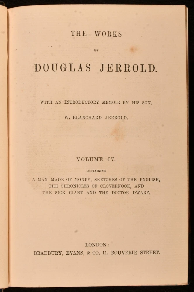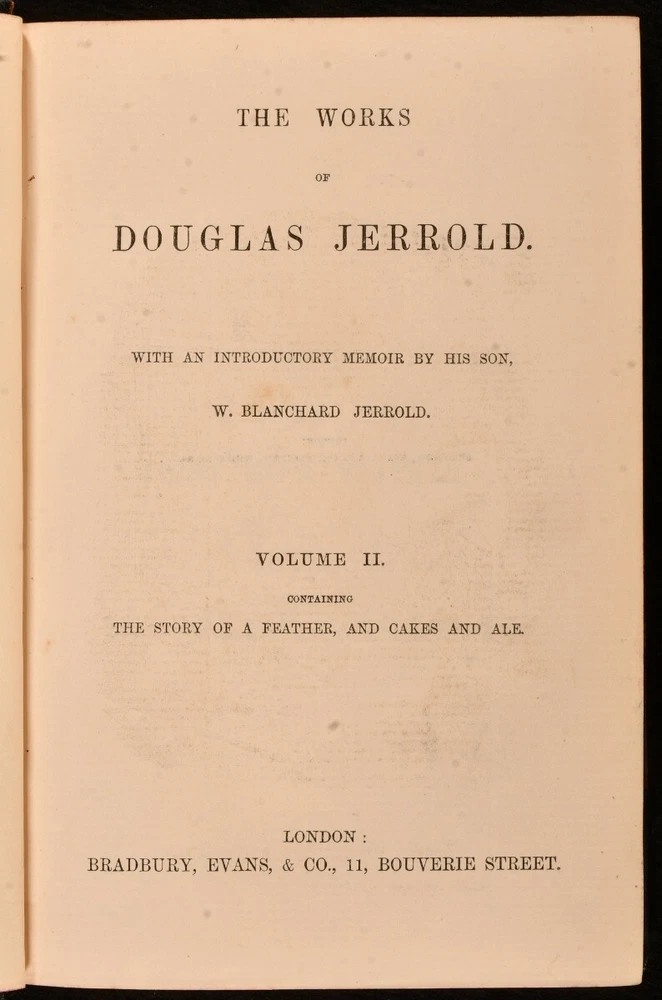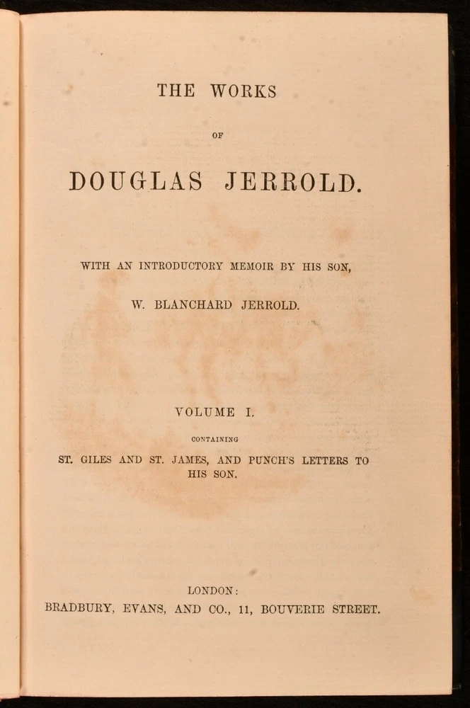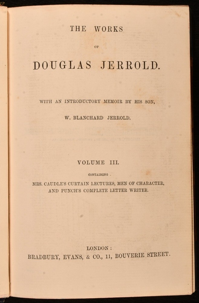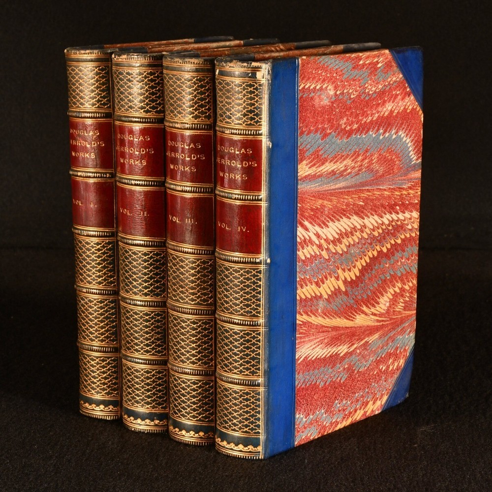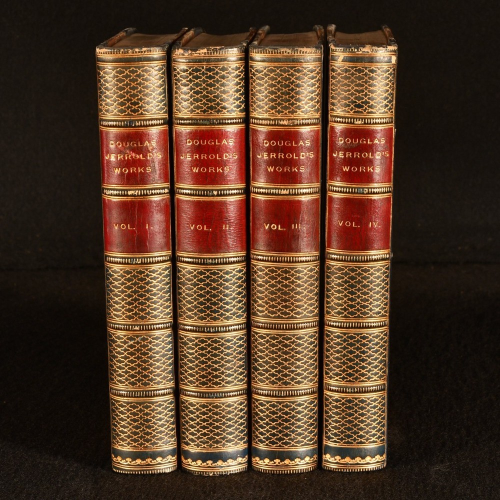 Click here to see our other books! The Works of Douglas Jerrold Douglas Jerrold; W. Blanchard Jerrold 1863-1864 Bradbury, Evans, and Co : London 8" by 5.5" 484; 554; 541; 491pp SUMMARY A beautifully bound four volume edition of the works of English dramatist and writer Douglas Jerrold, published within a decade of his death. Illustrated,Leather Binding Overall Condition: Very Good Indeed This book weighs 4 KG when packed UK Postage: £ 4.49 US Postage: £ 39.99 EU Postage : £ 26.99 European Postage: £ 36.99 Asia Postage: £ 65.99 Worldwide Postage: £ 99.99 DESCRIPTION Volumes I-IV of the works of Jerrold are present here. A fifth volume, which was published later, is not present here. In bright half calf bindings. Present here are such literary pieces as 'Punch's Letter to his Son', 'Men of Character', 'A Man Made of Money', and 'Sketches of the English'. Illustrated with a frontispiece to each volume. With a memoir of the author by his eldest son, William Blanchard Jerrold. From the library of W.A. Foyle of Beeleigh Abbey. William Foyle founded Foyles bookshop in 1903 alongside his brother. He purchased Beeleigh Abbey during the Second World War, an impressive twelfth century monastery in Essex. Beeleigh housed his library, one of the largest private libraries in England. CONDITION In half calf bindings, with gilt detailing to back strips. With marbled paper covered boards. Externally, excellent, with light rubbing to volume IV and II back strip heads. Internally, firmly bound. Light offsetting and spotting to title pages, with pages otherwise clean and bright. Overall Condition: Very Good Indeed GLOSSARY OF TERMS Overall Condition (Dustwrapper condition rating is shown after that for the book itself, where a dustwrapper is present) Fine - Very well preserved copy showing very little wear Very Good Indeed - Only one or two minor faults, really a very attractive copy Very Good - Quite a wide term meaning no major faults but probably several smaller ones often expected given the age of the book, but still a respectable copy Good - Meaning not very good. Some more serious faults as will be described in the condition report under 'condition' Good Only - Meaning one or more faults that could really do with repair Fair - As with good only above but with other faults leaving a compromised copy even after repair Poor - Really bad and possibly seriously incomplete. We only sell books in this condition where their rarity or value makes them attractive none the less. Major defects will be described. GUARANTEE We offer a full money back guarantee on our descriptions. Please ask for details and conditions. We prefer PAYPAL. If you pay via PAYPAL we will post the item off the same or the next working day with the postage you have selected. Please note we cannot accept USD cheques
