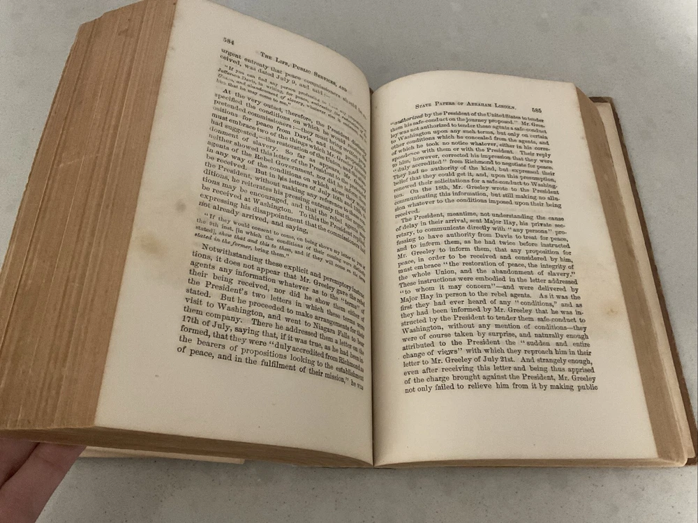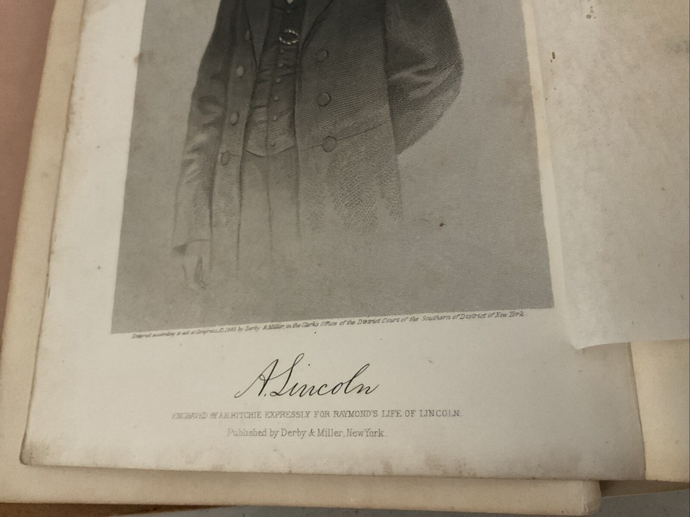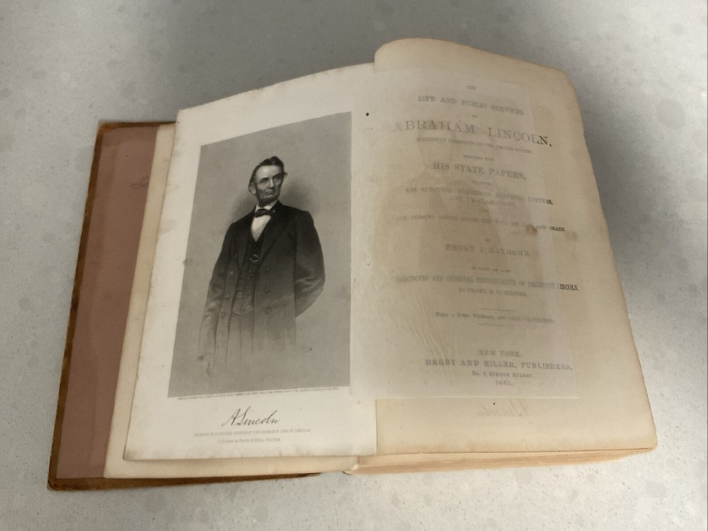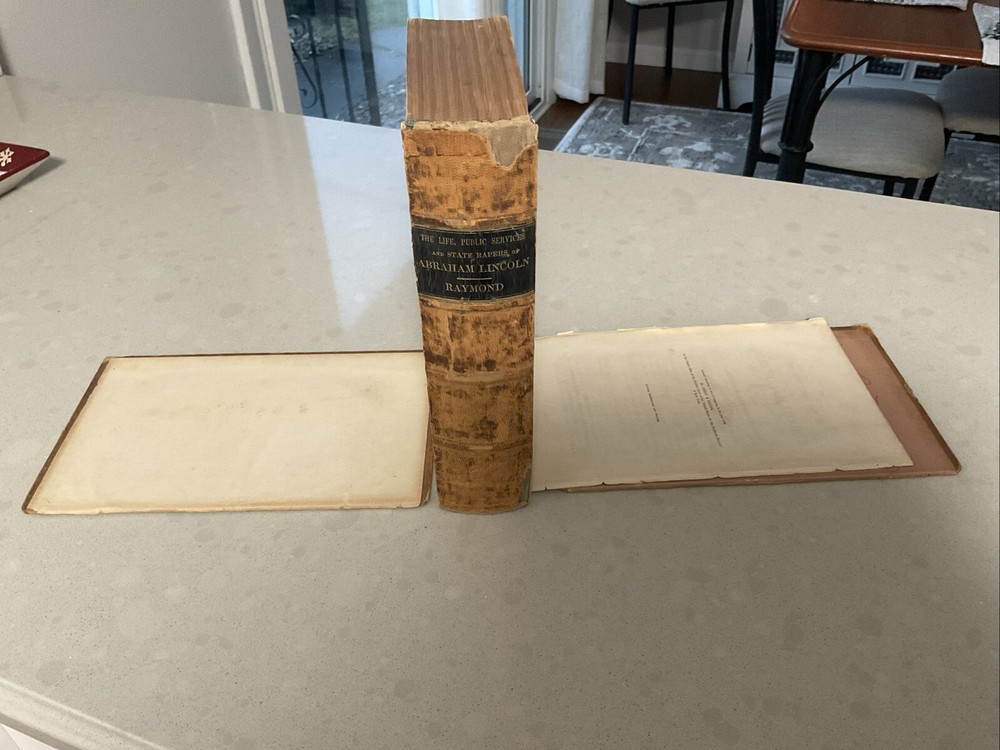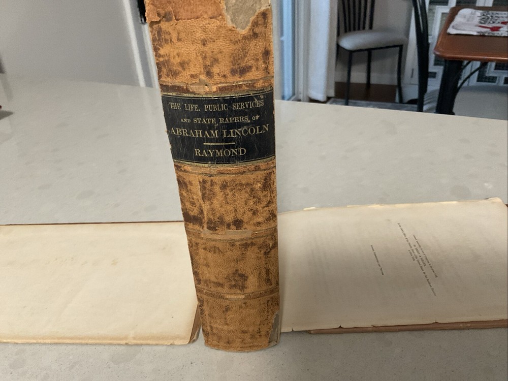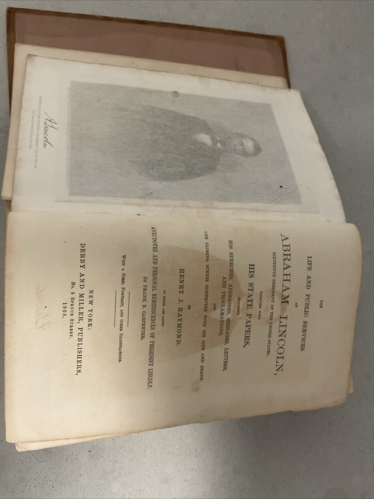 The product is a hardcover book published in 1865 titled "The Life And Public Services Of Abraham Lincoln" by author Henry J. Raymond. It is a leather-bound book with illustrations, written in English, focusing on the topic of the Civil War. This book provides a detailed account of the life and contributions of Abraham Lincoln during his time in public service, making it a valuable historical resource for those interested in American history and the impact of the Civil War. THE FRONT COVER AND BACK ARE DETACHED. PLEASE REVIEW PHOTOS.