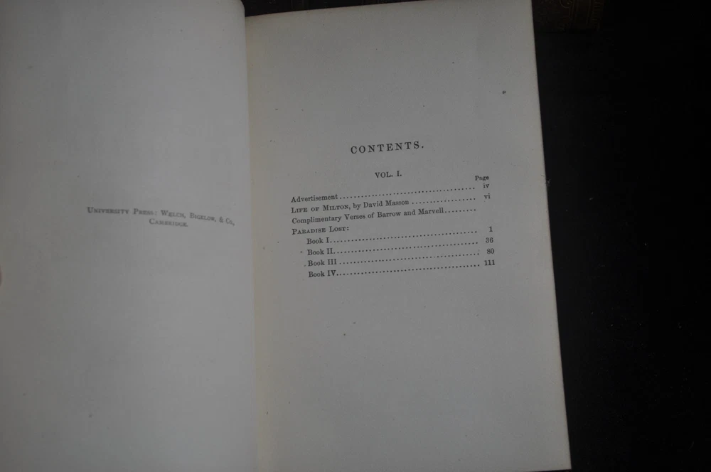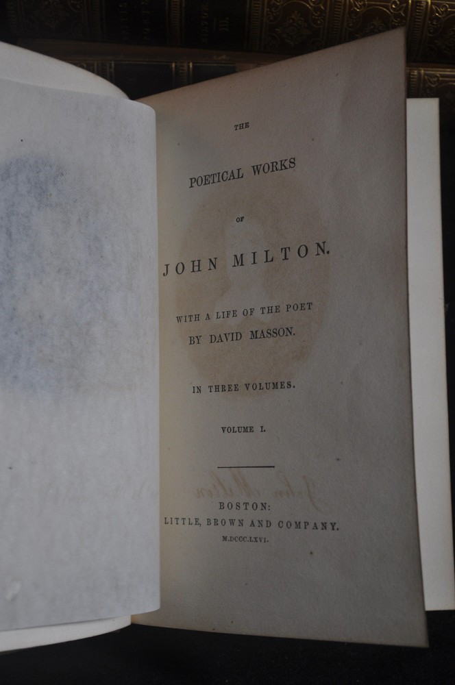 The Poetical Works of John Milton, with a Life of the Poet by David Masson Milton, John Published by Little, Brown and Company (1866) Six panel gilt spine - full leather 4 x 6 1/2 inches See photos for condition details. Shelf wear spine label brittle Due to high loss in shipping to certain countries, insurance is required for shipping to a location that does not provide tracking NOTE: If purchasing multiple items, please do so by using the Ebay Shopping Cart, then select "Request Total for Seller" for the corrected shipping on a new invoice. Do not pay for the items before receiving this corrected invoice.