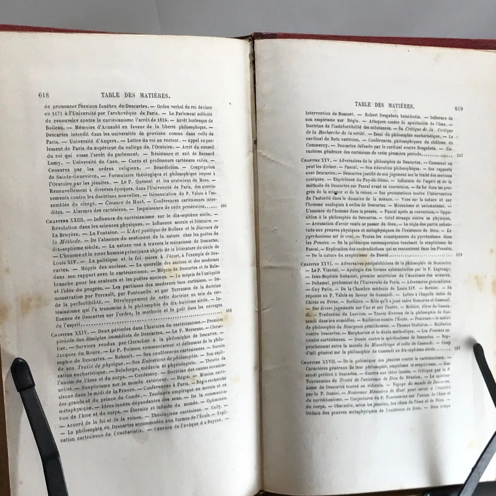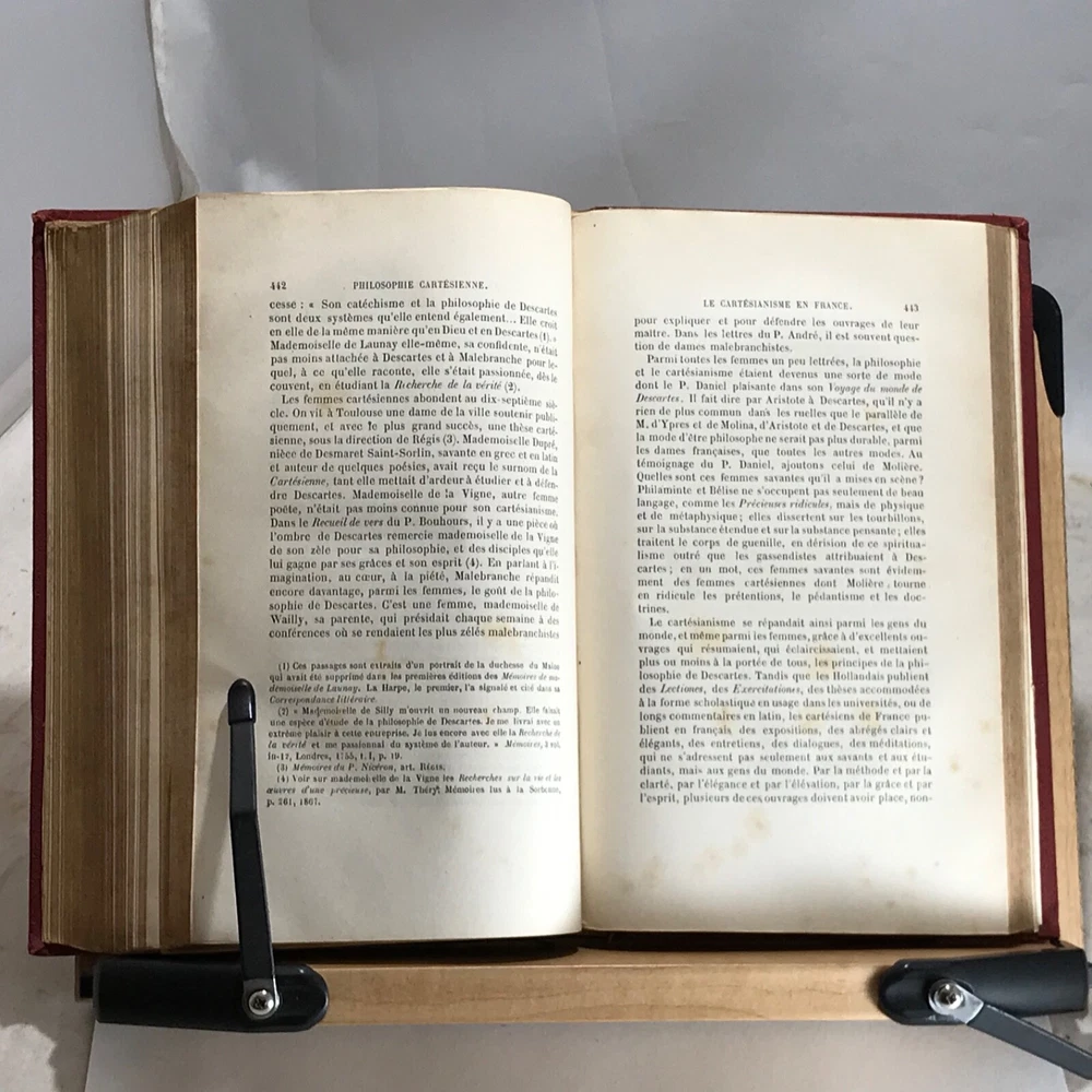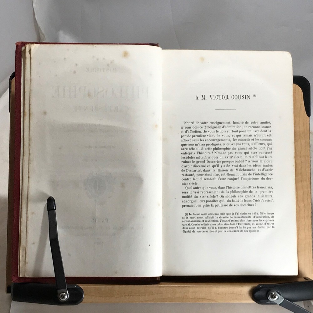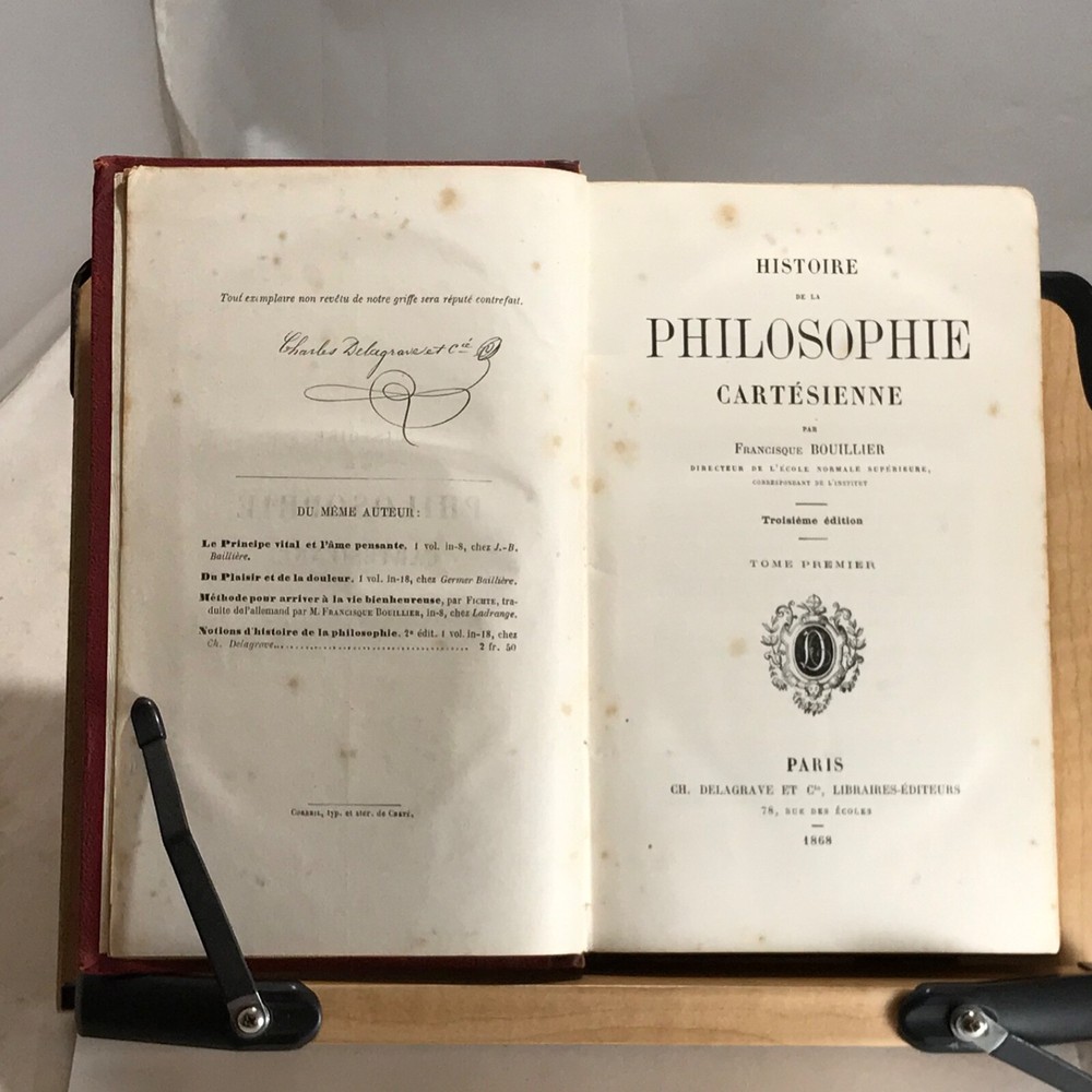 Histoire de la Philosophie Cartesienne, Francisque Bouillier, Troisieme Edition, Ch. Delagrave, Paris, 1868, two volumes, leather, 8vo. In good condition. Nicely bound. Boards show typical wear. Light surface dirt to boards. Spines are clean and gilt work is bright. Gilt fore edge is bright and clean. Gutters are shaken in both volumes. Front end papers are toned with foxing. Textblocks are bright and clean. Unmarked. Bindings are tight and intact. Please see photos. French biography of Descartes written by French philosopher Francisque Bouillier. He studied at the Ecole Normale Superieure, Paris and in 1839 was appointed professor of philosophy at the University of Lyons. He was dean of the faculty at Lyons and from 1867 to 1870 director of the Ecole Normal Superieure. COLH1868AIJA-variant