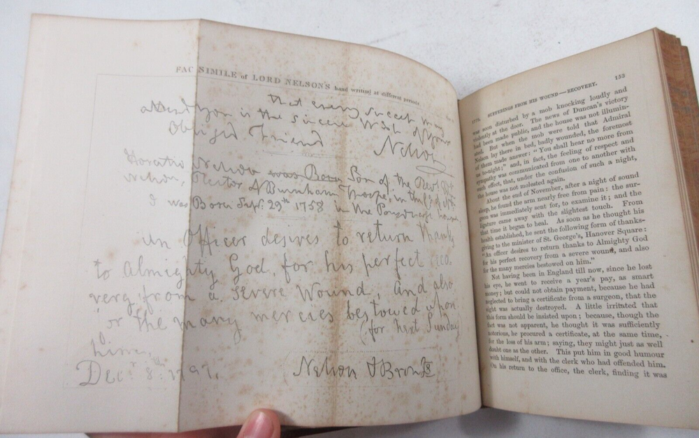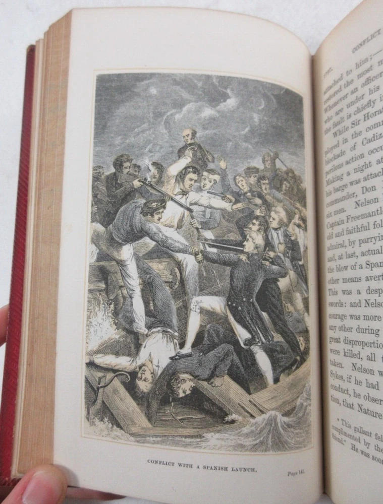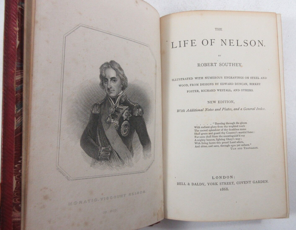 For sale is an excellent condition leather-bound edition of The Life of Horatio Viscount Nelson by Robert Southey. Illustrated with numerous engravings on steel and wood, from designs by Edward Duncan, Birket Foster, Richard Westall, and others. New edition, published in 1868 by Bell & Daldy in London. Binding is sound and pages are unmarked with the exception of occasional age toning as well as 2 bookplates on the front inside cover and front free endpaper. Leather cover boards are clean and square with minor shelf wear and scuffing to the corners and edges. Please see photos for condition detail. Shelf reference #L-1442