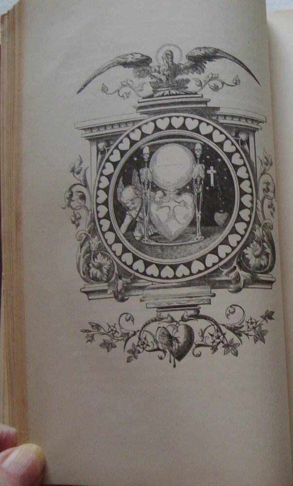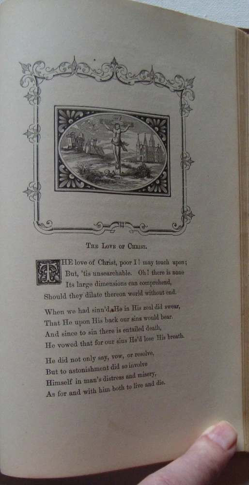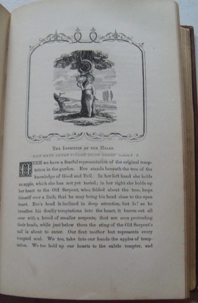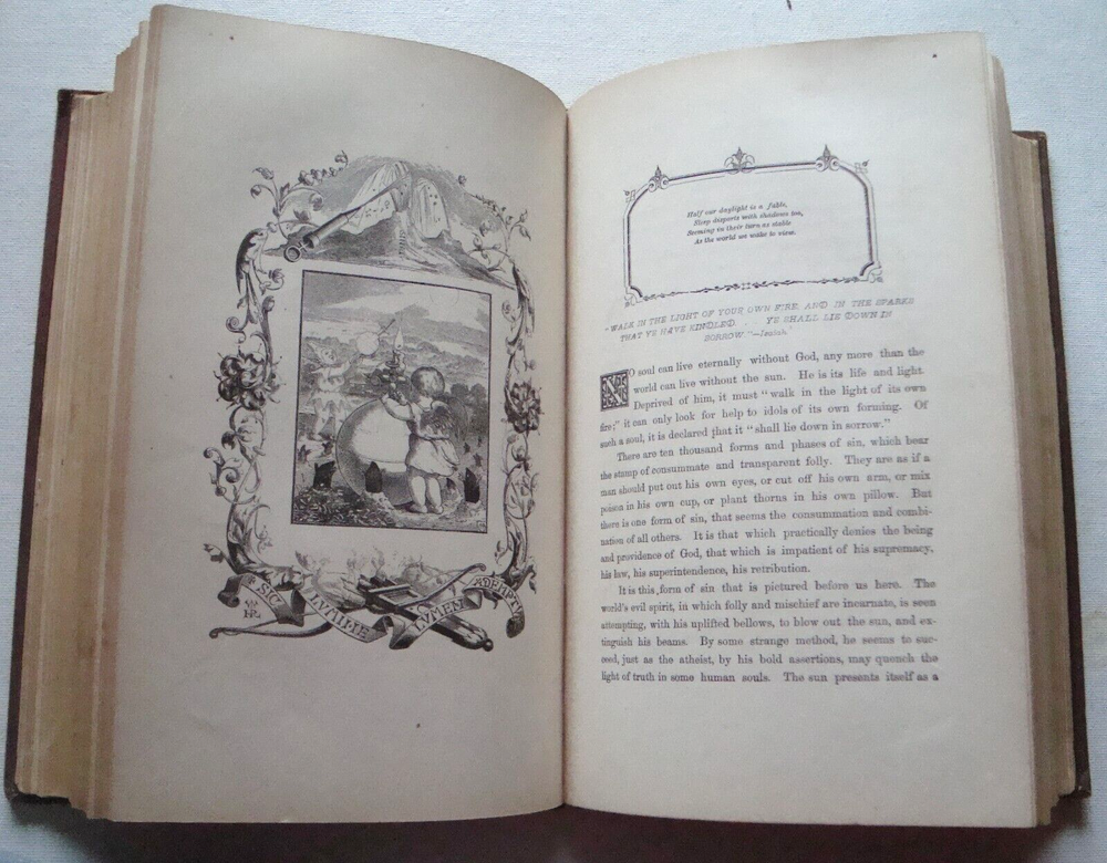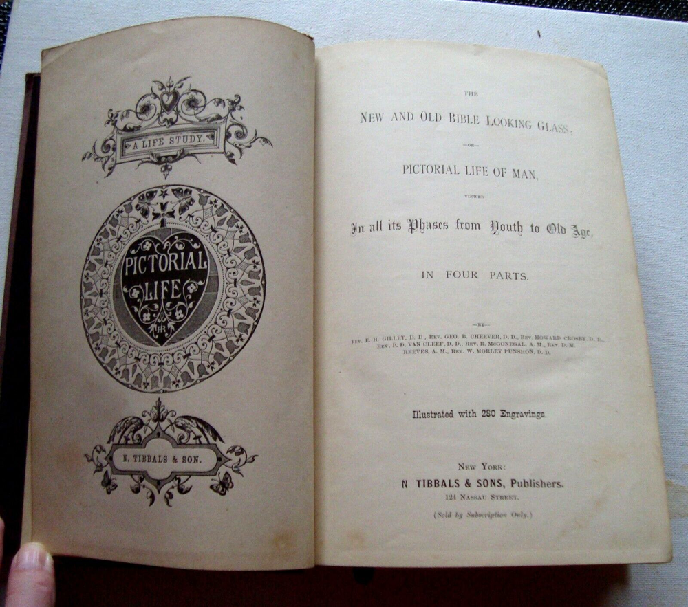 1870 The New and Old Bible Looking Glass or Pictorial Life of Man (inv656) Emblems pp 1-326 School of the Heart 4-52 The Candle of Life 6-36 Bunyan 1-8 Faith 9—15 The Sinner and the Spider 16-23 The Sun of Righteous 24-25 A Pennyloaf and rhe Bread of Life 29-30 Faith and Peace 29-30 The Beggar 31-33 Love, Trust, Hope 34-36 The Dawning 37-39 Satan and Blind Man’s Buff 40-42 The Love of Christ 45-46 The Vine and Vineyard 47-49 Satan Tempting Christ 50-52 The Sheaf 54-67 Etc… 3 of the 7 authors Ezra Hall Gillett (1823–1875) was an American clergyman and author, born at Colchester Connecticut He graduated in 1841 at Yale, and in 1844 at the Union Theological Seminary, and became pastor of a Presbyterian church in Harlem, N. Y. In 1868 he was appointed professor of political economy, ethics, and history in New York University. George Barrell Cheever, D.D., eminent in reform, philanthropy, and literature, born at Hallowell, Maine, April 17, 1807, and graduated at Bowdoin College, 1825. Dr. Cheever was a Congregational Pastor at Salem, Mass., 1833; New York, 1839; and the Church of the Puritans, N. Y., 1846-67. He has published several works, and one, Deacon Giles Distillery, procured him a month's imprisonment, in 1835. In 1831 he edited the American Common Place Book of Poetry, and in 1851 Christian Melodies. The latter contains 19 hymns by him. Howard Crosby (27 February 1826 – 1891) was an American Presbyterian preacher, scholar and professor, great-grandson of Judge Joseph Crosby of Massachusetts and of Gen. William Floyd of New York, a signer of the U.S. Declaration of Independence, and the father of Ernest Howard Crosby, and a relative of Fanny Crosby. 280 EngravingsTight binding, back cover shows spots as on picture, headbands damaged; corners worn. Published by N Tibbals & Sons. Tibbals and Sons was a New York City publishing firm which specialized in religious books. The firm which was begun in about 1848 by Nathan Tibbals added two sons, Nathan V. and John A.J. Tibbals in 1871. The firm sold to ministers internationally. The founder, Nathan Tibbals (1815-1897) was a methodist minister. Because of a poorly described "throat affliction" he retired from the ministry after a short fifteen year career. He subsequently embarked on his publishing career. Son John A. J. Tibbals (1849-1932) joined the firm as a young man. After the death of his father the firm was renamed N.D. Tibbals Book Company. He retired from the firm in 1917.