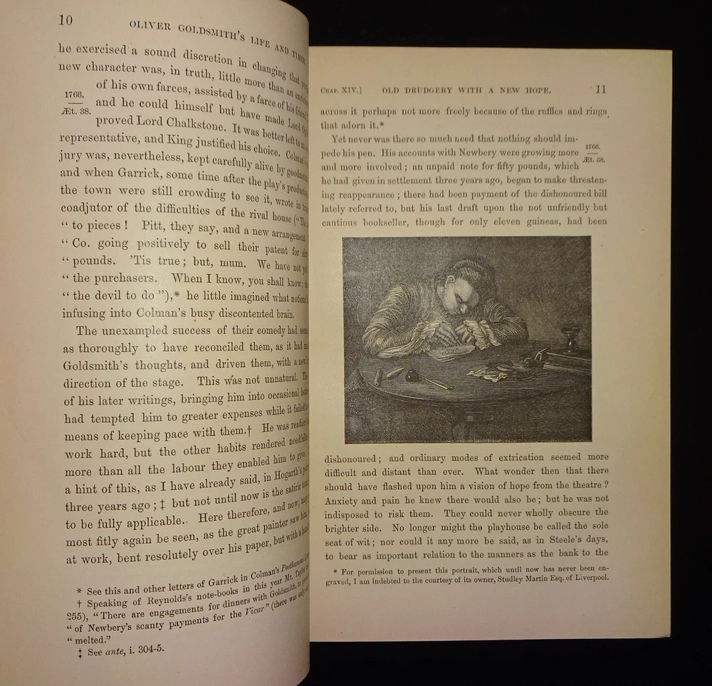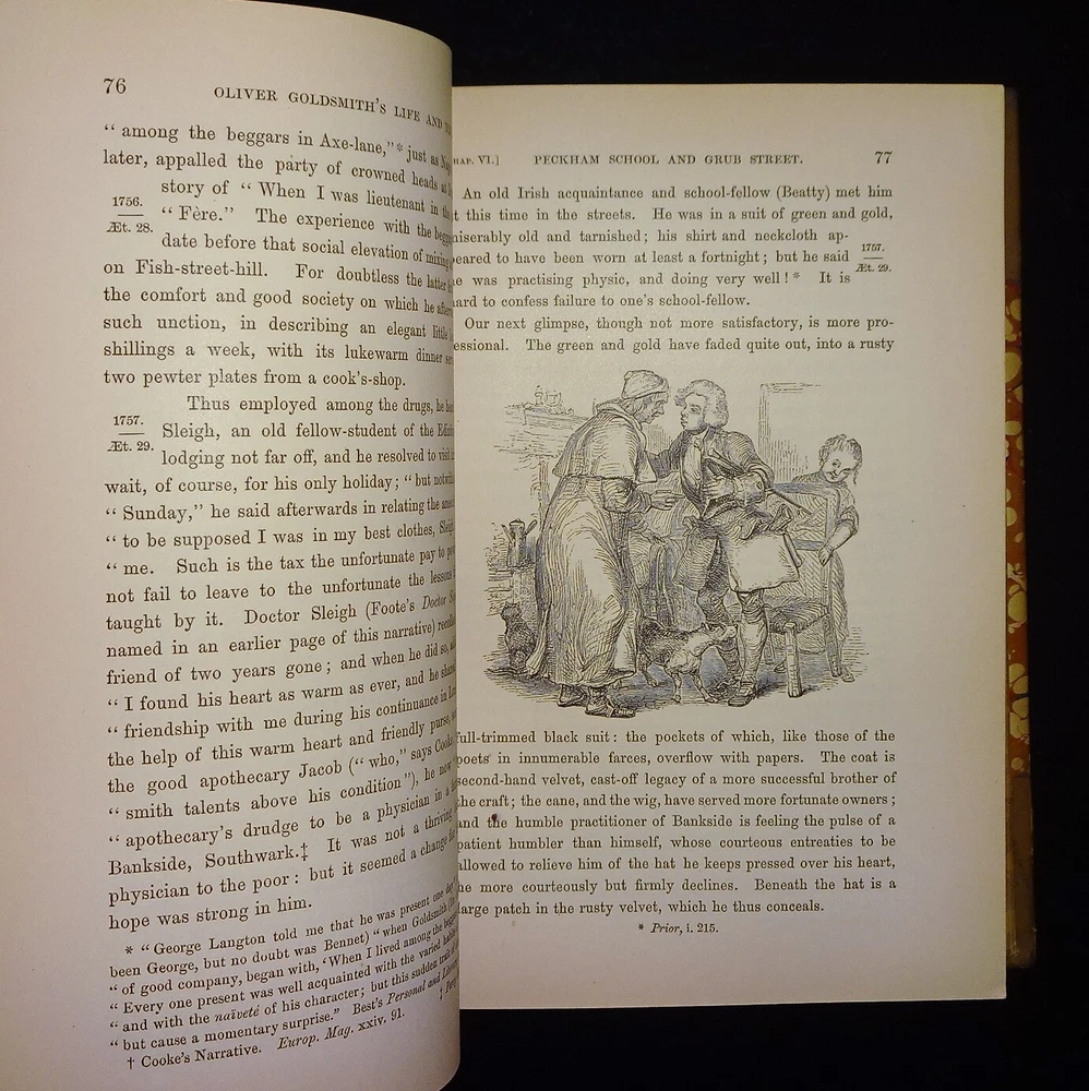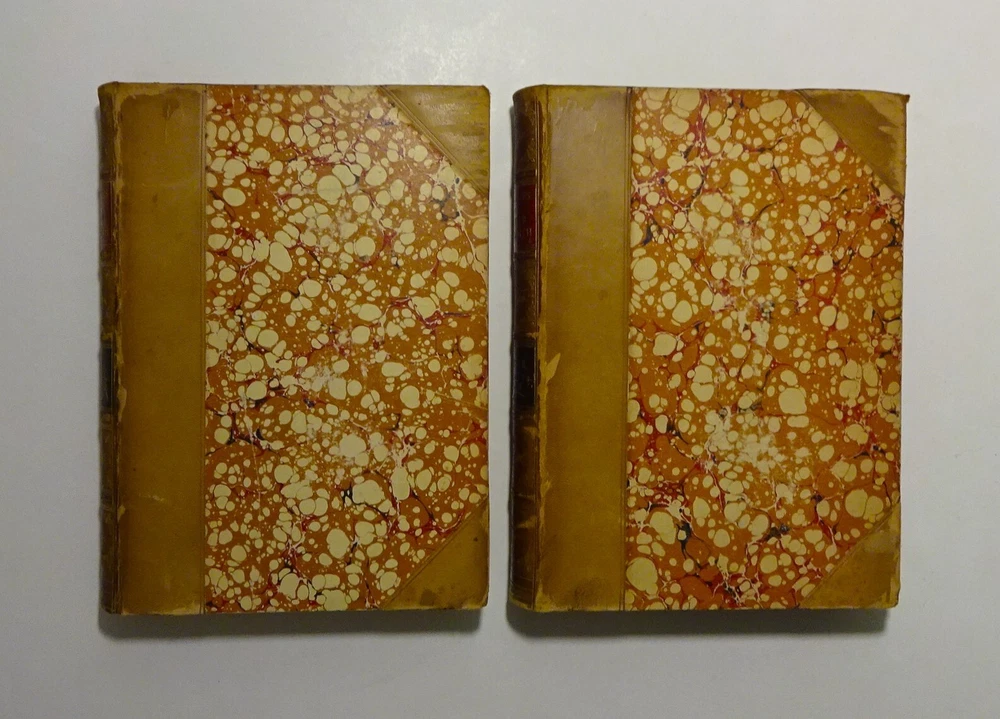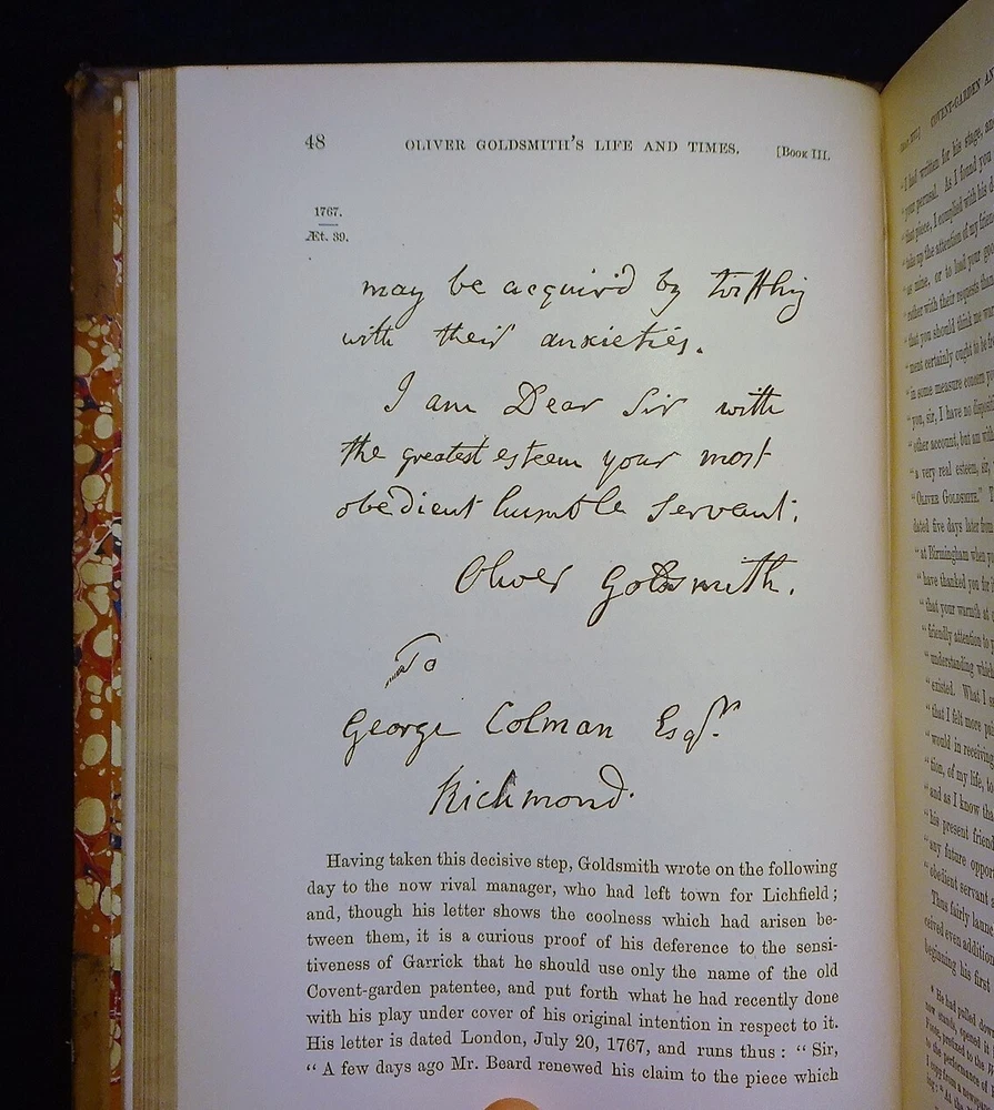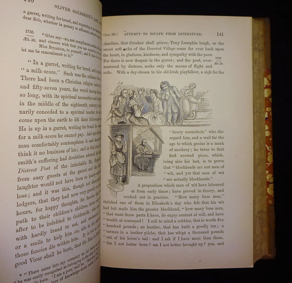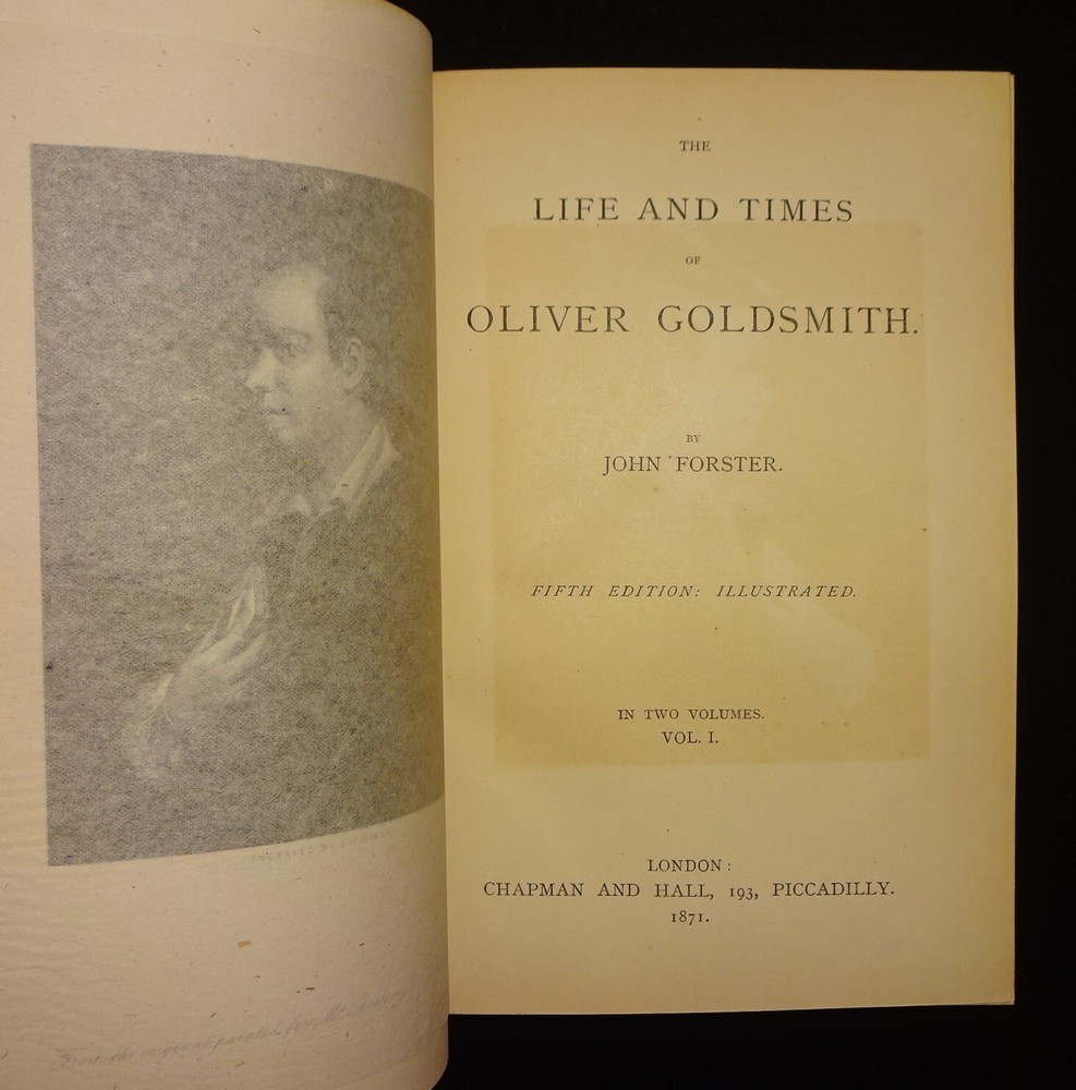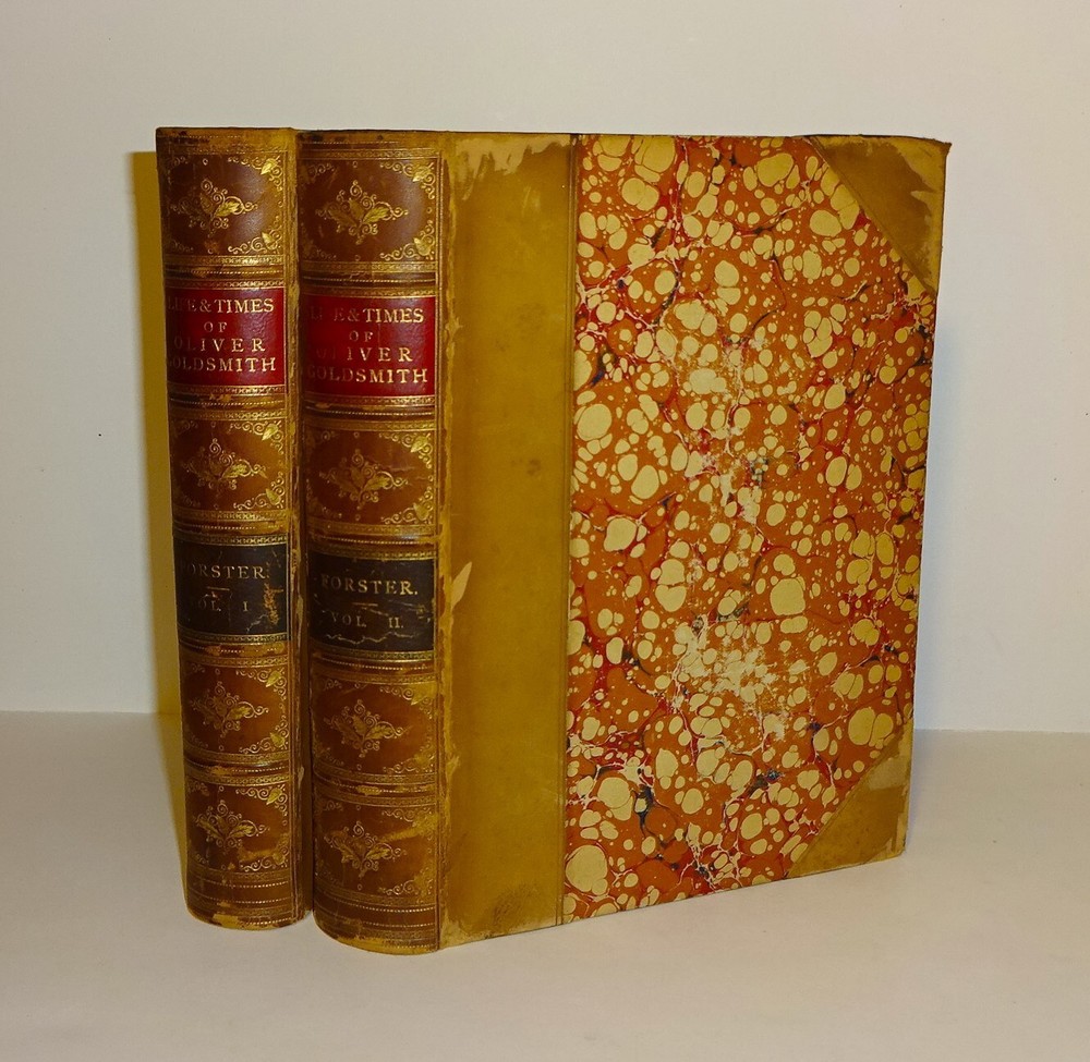 This is a handsome set of "The Life and Times of OLIVER GOLDSMITH" by John Forster. 1871 5th edition (stated); Chapman and Hall; London. Complete set in two volumes. Each volume contains an engraved frontispiece with tissue guards, as well as in-text illustrations and facsimile documents. Nicely bound in three-quarter leather with marbled boards, marbled end papers, marbled page edges on all sides, and spines with gilt decorations and five raised bands. Each volume contains an Appendix; there is an Index at the back of volume II.