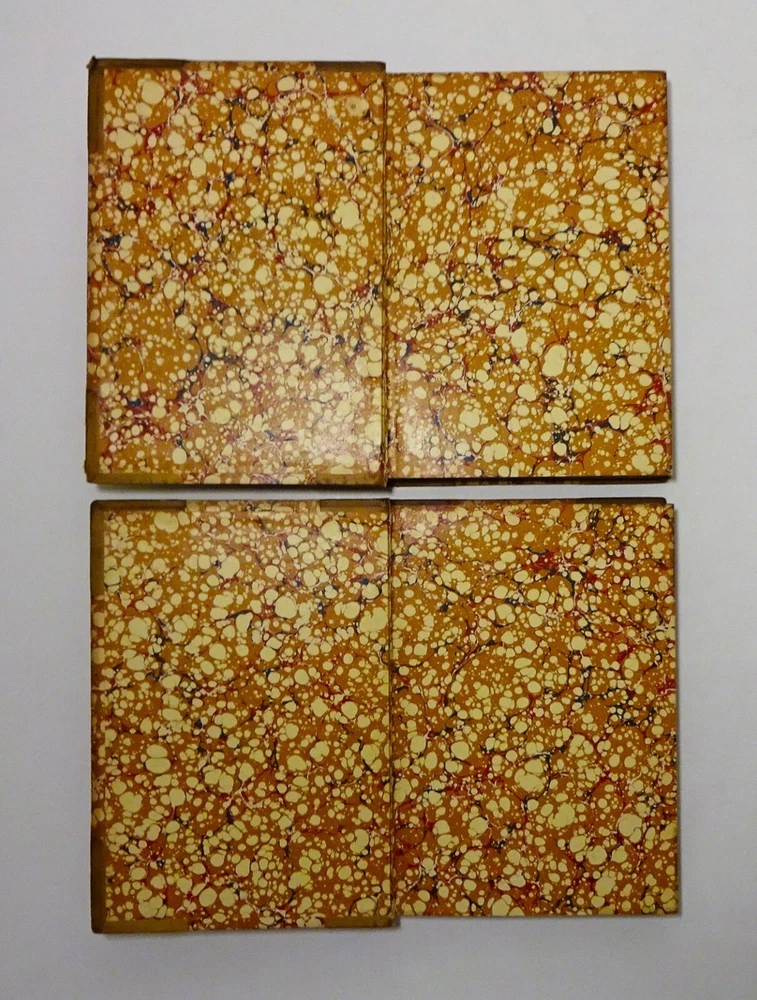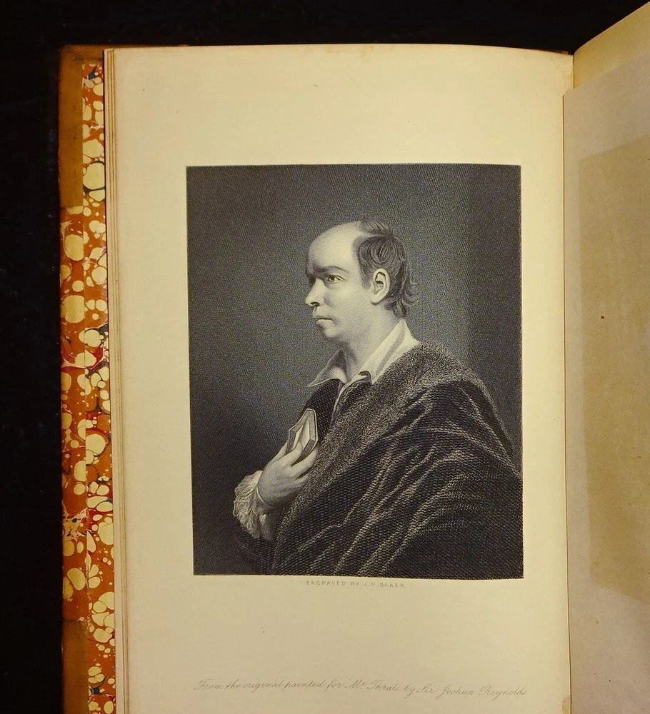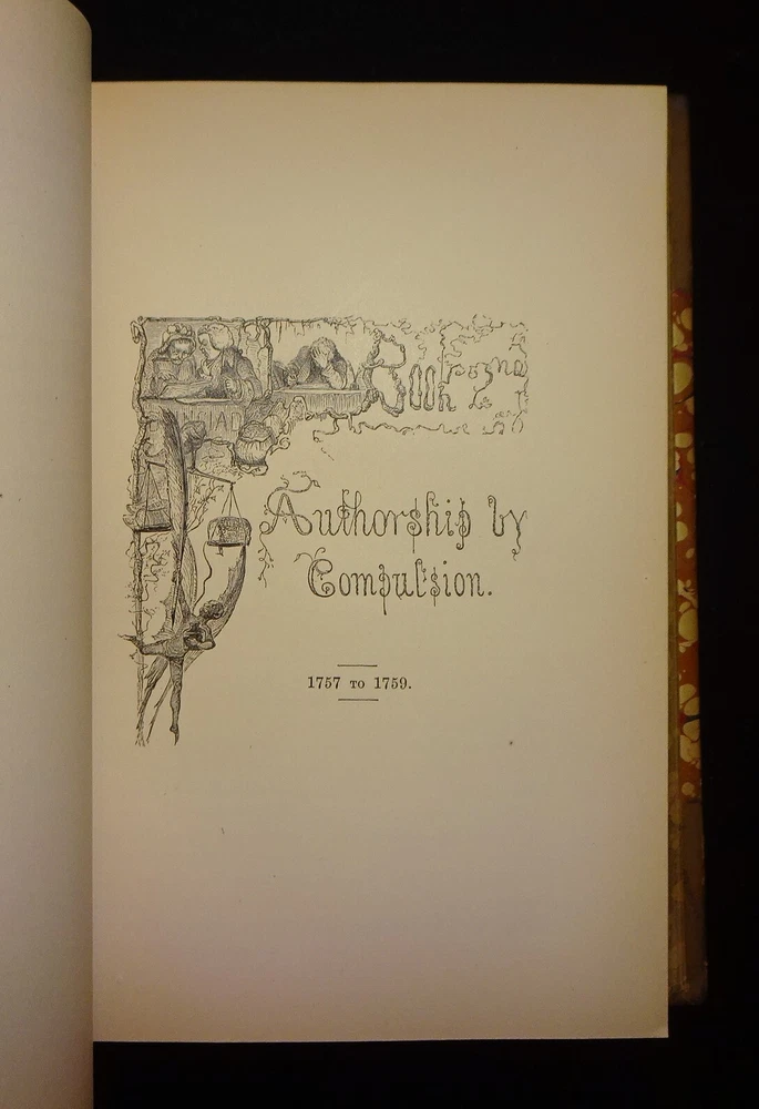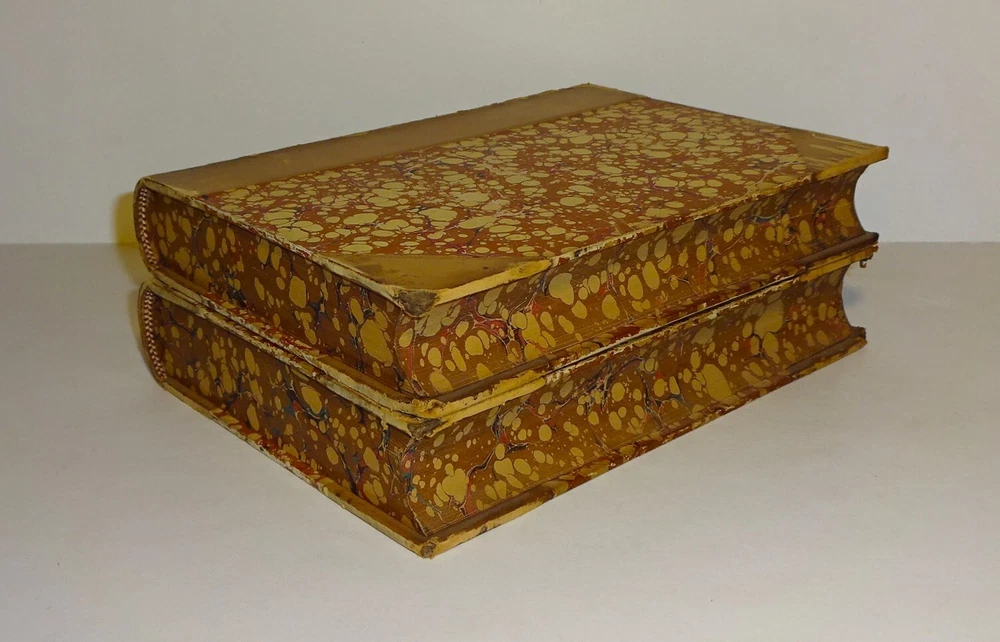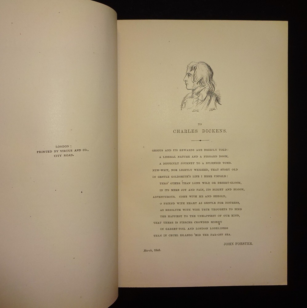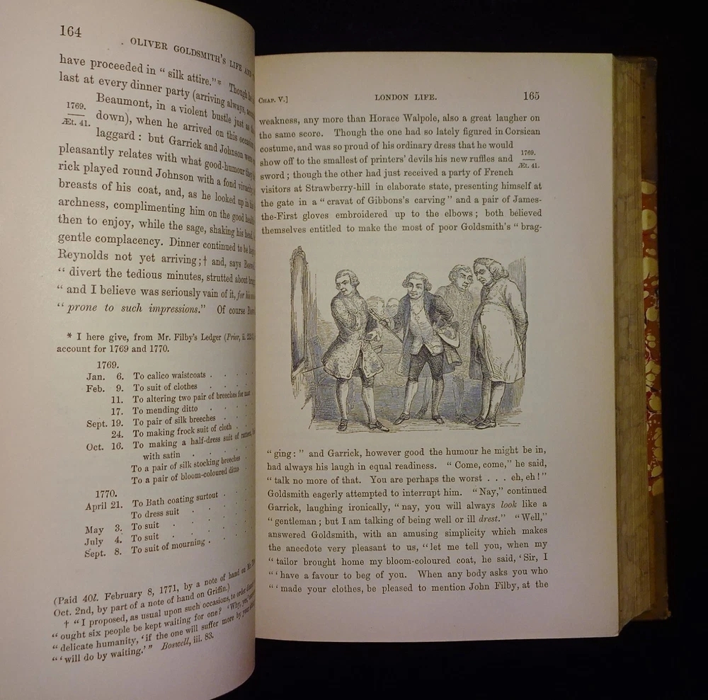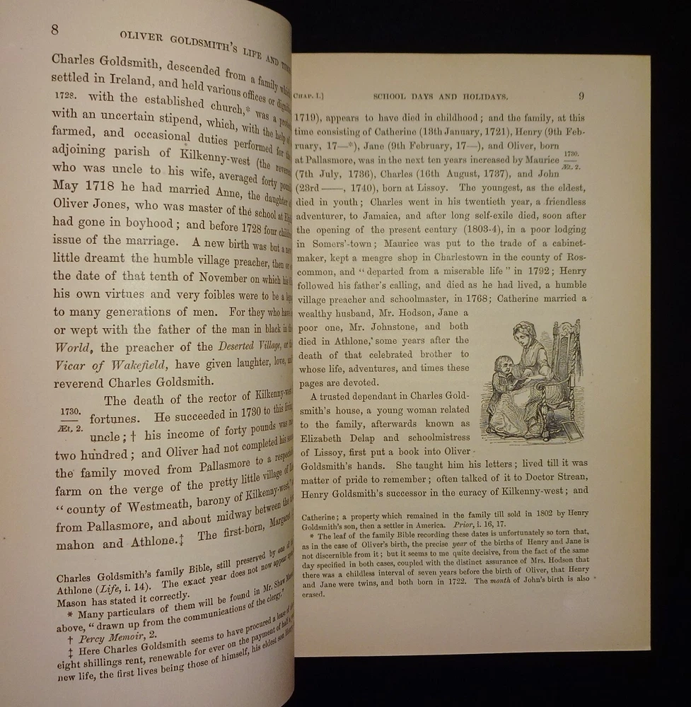 This is a handsome set of "The Life and Times of OLIVER GOLDSMITH" by John Forster. 1871 5th edition (stated); Chapman and Hall; London. Complete set in two volumes. Each volume contains an engraved frontispiece with tissue guards, as well as in-text illustrations and facsimile documents. Nicely bound in three-quarter leather with marbled boards, marbled end papers, marbled page edges on all sides, and spines with gilt decorations and five raised bands. Each volume contains an Appendix; there is an Index at the back of volume II.