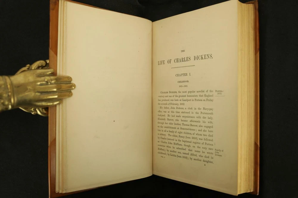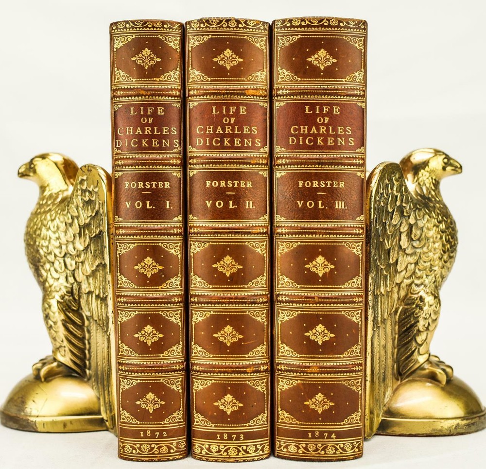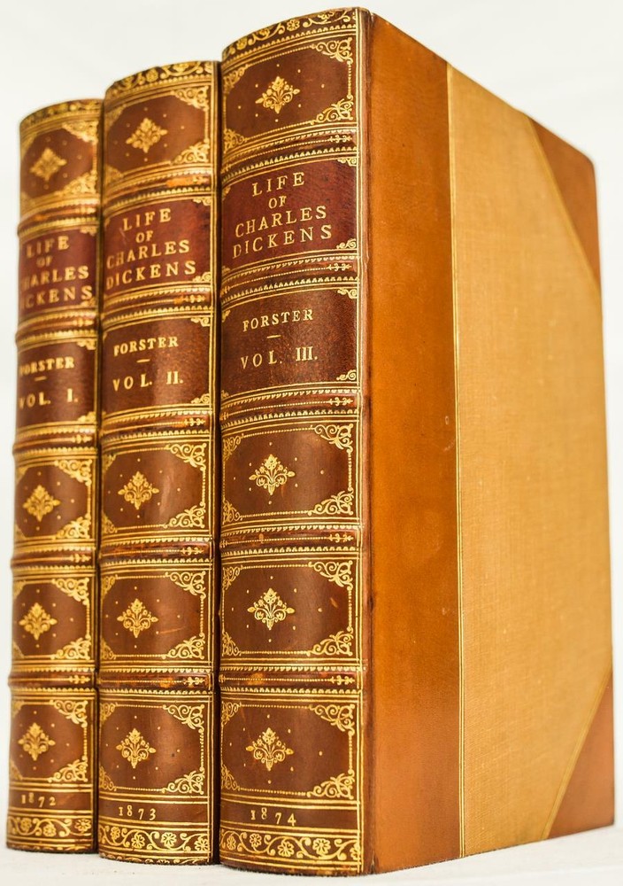 THIS COMPLETE THREE VOLUME SET IS IN VERY GOOD CONDITION BEAUTIFULLY BOUND BY ROOT & SON IN 3/4 LEATHER WITH BRIGHT GILT RULE TO BOARDS, SIX COMPARTMENTS AND FIVE RAISED BANDS TO SPINE WITH BRIGHT GILT DETAILS AND TITLE. BINDING AND HINGES ARE VERY GOOD, DECORATIVE END PAPERS AND PASTE DOWNS. NO LOOSE OR MISSING PAGES, PAGES ARE BRIGHT AND CLEAN, WITHOUT MARKS AND MINIMAL FOXING. PROFUSELY ILLUSTRATED, BOOKS MEASURE 8.5"x5.75". 148 YEARS OLD. AN ATTRACTIVE SET IN GREAT CONDITION. 1872 Life of Charles Dickens Bound by Root & Son Illustrated Leather 1872 Life of Charles Dickens Bound by Root & Son Illustrated Leather Description RARE!!! 1872 ATTRACTIVE LEATHER BINDINGS 148 YEARS OLD PROFUSELY ILLUSTRATED THIS COMPLETE THREE VOLUME SET IS IN VERY GOOD CONDITION BEAUTIFULLY BOUND BY ROOT & SON IN 3/4 LEATHER WITH BRIGHT GILT RULE TO BOARDS, SIX COMPARTMENTS AND FIVE RAISED BANDS TO SPINE WITH BRIGHT GILT DETAILS AND TITLE. BINDING AND HINGES ARE VERY GOOD, DECORATIVE END PAPERS AND PASTE DOWNS. NO LOOSE OR MISSING PAGES, PAGES ARE BRIGHT AND CLEAN, WITHOUT MARKS AND MINIMAL FOXING. PROFUSELY ILLUSTRATED, BOOKS MEASURE 8.5"x5.75". 148 YEARS OLD. AN ATTRACTIVE SET IN GREAT CONDITION. !!!CLICK HERE!!! Visit My eBay Store TO SEE ALL THE BOOKS WE HAVE FOR SALE!!! IF YOU LIKE WHAT YOU SEE THAN SAVE US TO YOUR FAVORITES BY CLICKING HERE. Add me to your Favorite Sellers RARE ANTIQUARIAN BOOKS CAN BE FRAGILE AND NEED TO BE HANDLED WITH CARE. About us: Reagan's Rare Books is a purveyor of Antiquarian books primarily from the 18th and 19th centuries. We love antique books! We search all over the country for the finest rare books, looking for those with beautiful bindings and in great condition so that we can offer you, the customer, a truly rare one of a kind collectible. Paypal Preferred. Please make payment arrangements within 48 hours of winning your auction. We reserve the right to re-list items not paid within 5 days. Shipping *To Insure That Your Package arrives without any Problems , Please Double Check to Make Sure That The Address You Have Selected in eBay Is Correct. All books are carefully bubble wrapped and packed in a box with adequate packing peanuts to prevent any damage during shipment. All books are shipped with delivery confirmation and tracking. Books over $75.00 are automatically insured. RETURNS 100% Satisfaction Guaranteed. Returns accepted for any reason within 30 days of receipt. PLEASE CHECK MY OTHER LISTINGS. POSTING NEW RARE BOOKS DAILY/WEEKLY. Images sell! Get Supersized Images & Free Image Hosting Create your brand with Auctiva's Customizable Templates. Attention Sellers - Get Templates Image Hosting, Scheduling at Auctiva.com. Track Page Views With Auctiva's FREE Counter