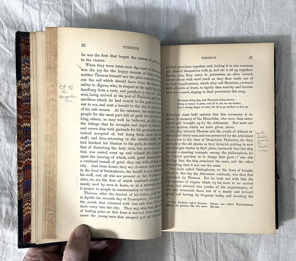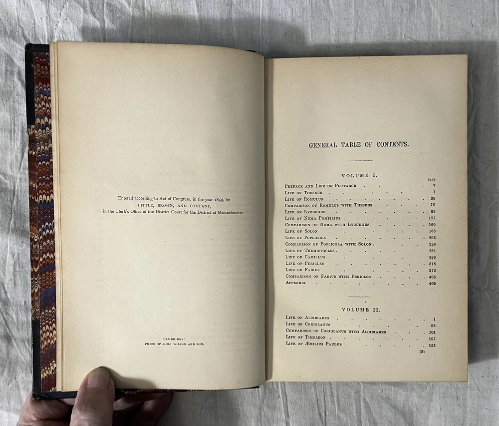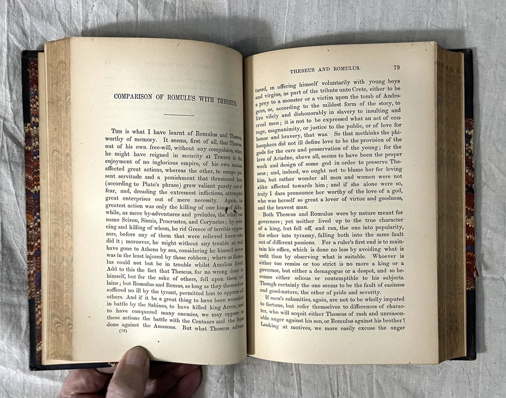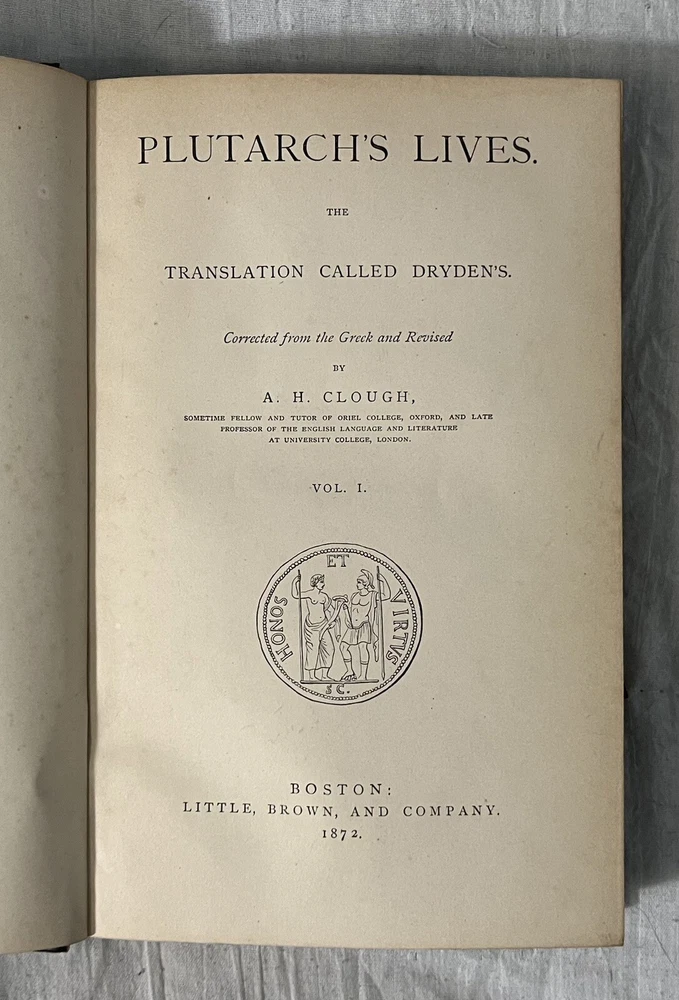 Very good condition hardcover book. This book is from the personal library of Lincoln MacVeagh, former US ambassador to Spain, Portugal, Greece, Yugoslavia, South Africa, and Iceland. He was also US Minister to Greece. Many of these appointments were during the sensitive times of WWII. Exterior: 3/4 leather binding is clean tight and square. Five raised bands on the spine. Leather spine and corners. Decorated paper on the boards. Gilt text and design on the spine. All page edges are marbled. Top page edges have dust soiling. Corner, bottom and free edge, and spine end wear. Some leather loss on the face of the top corners. About 8-3/4” tall. Interior: pages are clean with no tears or creasing. Pages have light margin toning. Lincoln and Margaret MacVeagh bookplate on front pastedown. Two blank pages after the front and back endpapers have very light foxing. Pencil handwriting top corner of the reverse of the front free endpaper. I counted nine pages in the Theseus chapter with pencil underlining and/or margin notes. No other handwriting found. 414 pages. This antique book is a true gem for any collector interested in ancient biographies and history. Published in 1872 by Little, Brown, and Company, this volume is the first part of Plutarch's Lives, featuring a leather binding and translated by John Dryden and revised by Arthur Hugh Clough in 1859. The book is written in English and has been well-preserved over the years, making it a great addition to any collection of antiquarian and collectible books. Its detailed illustrations and captivating narrative will transport readers back in time to the ancient world.