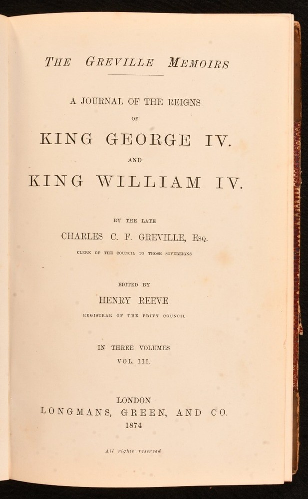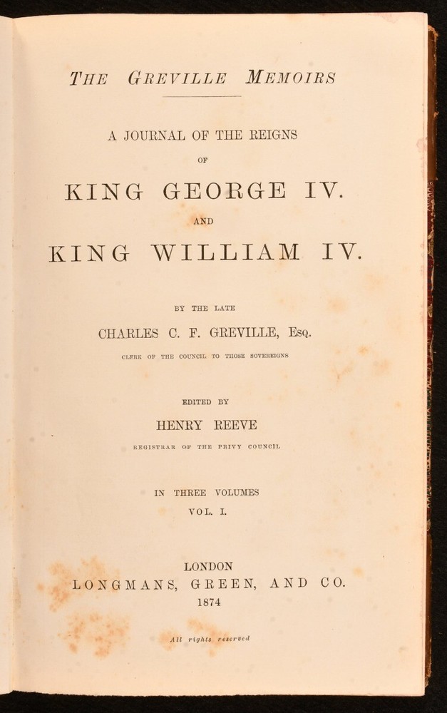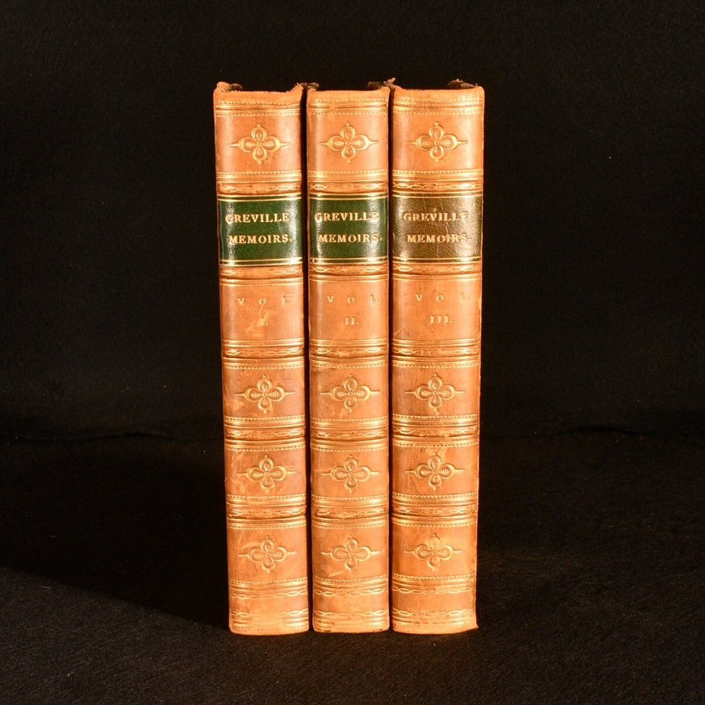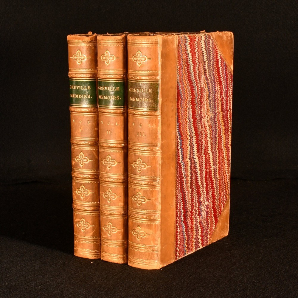 Click here to see our other books! The Greville Memoirs: A Journal of the Reigns of King George IV. and King William Iv. Charles Greville 1874 Longmans, Green, and Co. : London 9" by 5.5" xvii, 424; ix, 384; x, 432pp. SUMMARY The complete three volume, first edition set of the memoirs of Charles Greville, detailing the reigns of King George IV and King William IV and bound in half calf by Mudie. First Edition,Leather Binding,Original Binding,Signed Binding Overall Condition: Good This book weighs 2 KG when packed UK Postage: £ 3.99 US Postage: £ 29.99 EU Postage : £ 21.99 European Postage: £ 23.99 Asia Postage: £ 37.99 Worldwide Postage: £ 38.99 DESCRIPTION The first edition. Bound in half calf with marbled paper to the boards by Murie, with their binder's stamp to the verso of the front free endpapers. A three volume set, complete as published, with five further volumes published between 1875 and 1887. This set features a journal detailing the Reigns of King George IV and King William IV by the late Charles C. F. Greville and edited by Henry Reeve. Three fascinating volumes exploring the reigns of King George IV and King William IV. George IV was King of the United Kingdom until 1830 when King William IV took over until 1837 becoming the last king and penultimate monarch of Britain's House of Hanover. CONDITION Bound in half calf with marbled paper to the boards. Externally generally smart with fading to the spines , heaviest to volume III, rubbing to the joints and extremities, marks to the boards and slight bumping to the extremities of the boards. Lacking volume spine labels. Internally firmly bound with lightly age toned and generally clean pages with spotting to the front and the odd spot throughout. Overall Condition: Good GLOSSARY OF TERMS Overall Condition (Dustwrapper condition rating is shown after that for the book itself, where a dustwrapper is present) Fine - Very well preserved copy showing very little wear Very Good Indeed - Only one or two minor faults, really a very attractive copy Very Good - Quite a wide term meaning no major faults but probably several smaller ones often expected given the age of the book, but still a respectable copy Good - Meaning not very good. Some more serious faults as will be described in the condition report under 'condition' Good Only - Meaning one or more faults that could really do with repair Fair - As with good only above but with other faults leaving a compromised copy even after repair Poor - Really bad and possibly seriously incomplete. We only sell books in this condition where their rarity or value makes them attractive none the less. Major defects will be described. GUARANTEE We offer a full money back guarantee on our descriptions. Please ask for details and conditions. We prefer PAYPAL. If you pay via PAYPAL we will post the item off the same or the next working day with the postage you have selected. Please note we cannot accept USD cheques