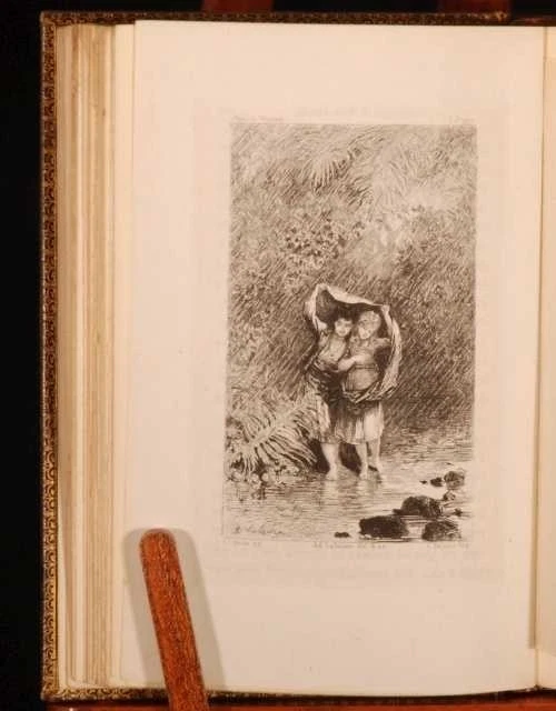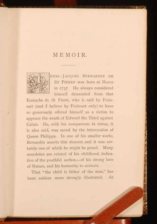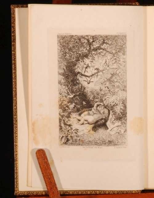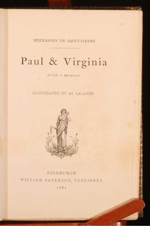 Click here to see our other books! Paul and Virginia: With a Memoir Bernardin de Saint Pierre 1881 William Paterson : Edinburgh 7.5" by 5.5" xxviii, 230pp plus plates SUMMARY A limited edition of this tragic love story set in French Mauritius on the eve of the French Revolution. Fine Binding,Leather Binding,Limited Edition Overall Condition: Very Good This book weighs 0.75 KG when packed UK Postage: £ 3.99 US Postage: £ 19.99 EU Postage : £ 15.99 European Postage: £ 16.99 Asia Postage: £ 21.99 Worldwide Postage: £ 25.99 DESCRIPTION Featuring a number of engraved plates by Ad Lalauze, including a frontispiece. There is a short biography of Saint Pierre to the front. 'Impression limited to four hundred and thirty-three copies... 190 copies with plates on China paper. Nos 15 to 240... No 184'. With 'Bound for Wm Paterson' stamped to the front pastedown. CONDITION In a full crushed morocco binding, with marbled endpapers. Externally very good indeed with just some shelfwear. Internally, generally firmly bound, although the front free-endpaper is working loose. Generally bright and clean, with just occasional foxing prominent to first and last few pages. Overall Condition: Very Good GLOSSARY OF TERMS Overall Condition (Dustwrapper condition rating is shown after that for the book itself, where a dustwrapper is present) Fine - Very well preserved copy showing very little wear Very Good Indeed - Only one or two minor faults, really a very attractive copy Very Good - Quite a wide term meaning no major faults but probably several smaller ones often expected given the age of the book, but still a respectable copy Good - Meaning not very good. Some more serious faults as will be described in the condition report under 'condition' Good Only - Meaning one or more faults that could really do with repair Fair - As with good only above but with other faults leaving a compromised copy even after repair Poor - Really bad and possibly seriously incomplete. We only sell books in this condition where their rarity or value makes them attractive none the less. Major defects will be described. GUARANTEE We offer a full money back guarantee on our descriptions. Please ask for details and conditions. We prefer PAYPAL. If you pay via PAYPAL we will post the item off the same or the next working day with the postage you have selected. Please note we cannot accept USD cheques