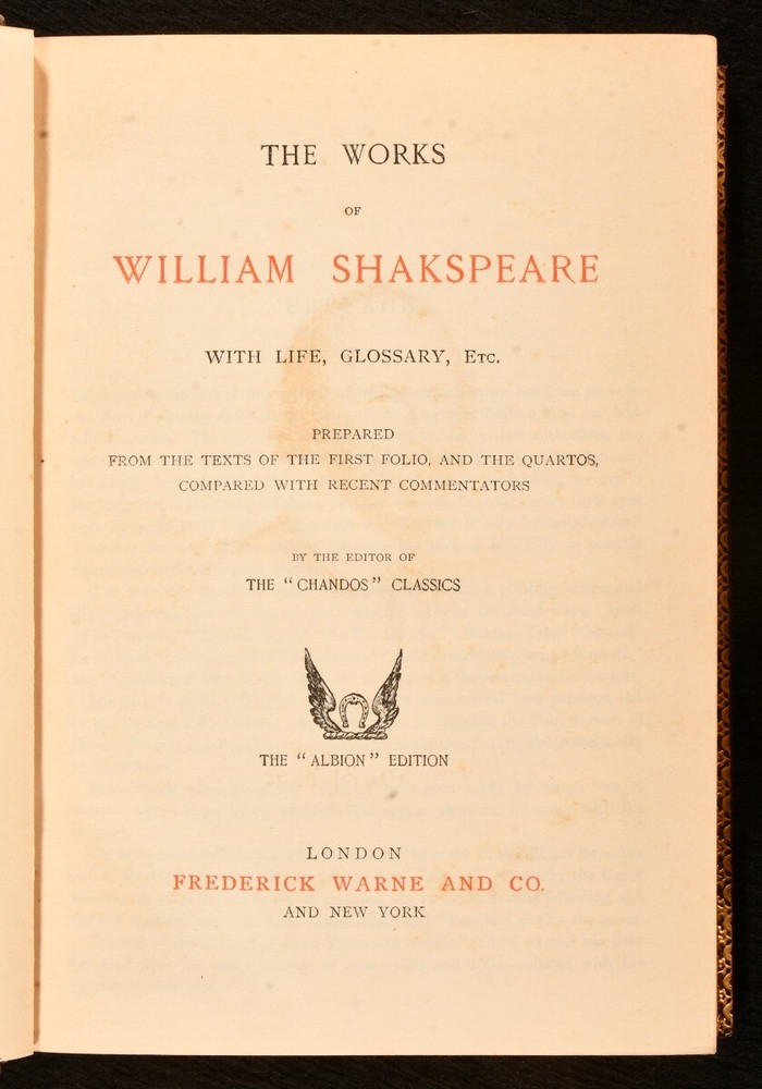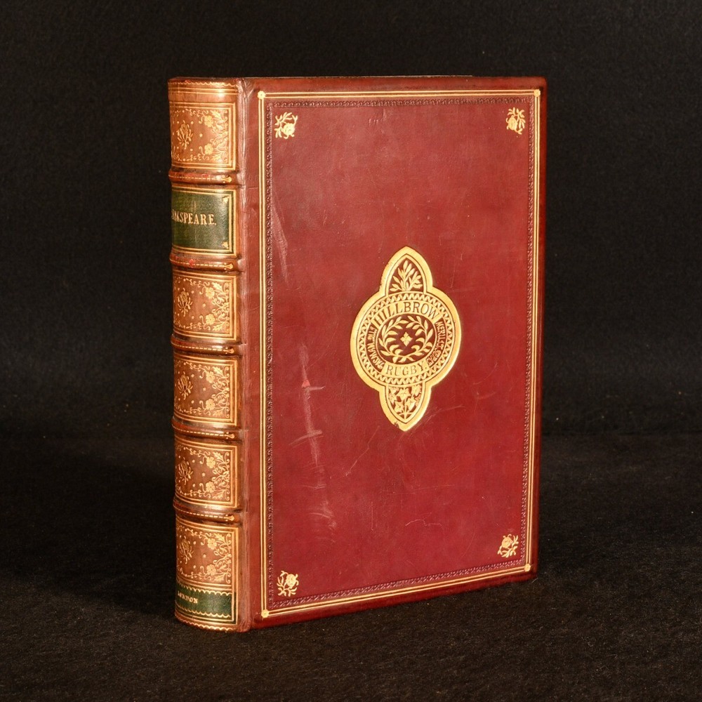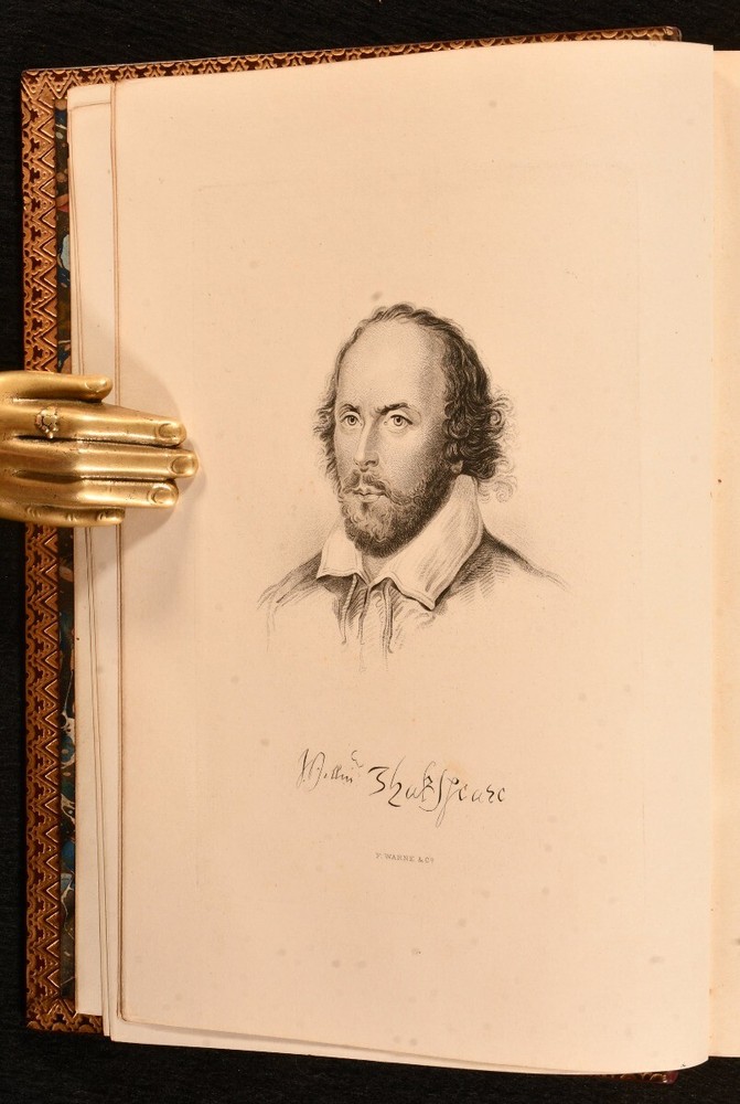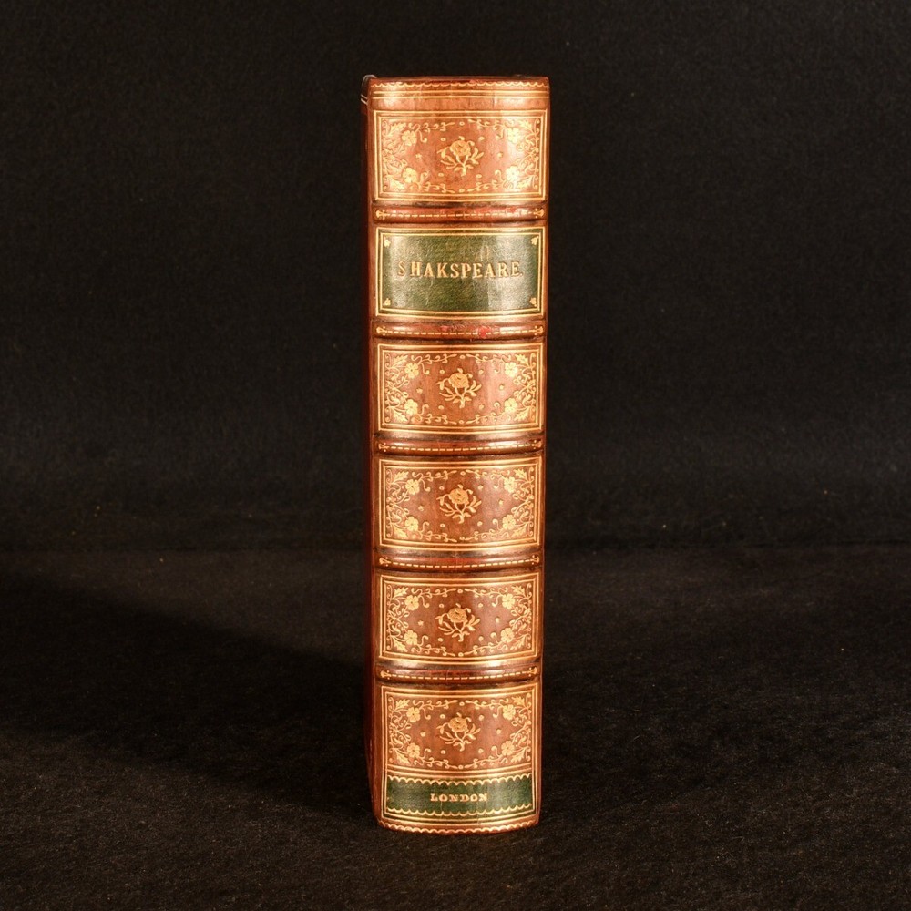 Click here to see our other books! The Works of Shakespeare: With Life, Glossary, etc William Shakespeare [1881] Frederick Warne and co : London 7.5" by 5.5" xvi, 1136pp. SUMMARY The Albion edition of the works of the legendary Shakespeare, in a full calf prize binding. Illustrated,Leather Binding,Original Binding,Prize Binding Overall Condition: Very Good This book weighs 0.75 KG when packed UK Postage: £ 3.99 US Postage: £ 19.99 EU Postage : £ 15.99 European Postage: £ 16.99 Asia Postage: £ 21.99 Worldwide Postage: £ 25.99 DESCRIPTION The 'Albion' edition. Illustrated with a monochrome frontispiece portrait of Shakespeare. Bound in a full calf prize binding for 'Hillbrow Rugby School' with their gilt crest to the front. This collection of Shakespeare's works was prepared from the texts of the first folio, and the quartos and compared with recent commentators by the editor of the 'Chandos' classics. The volume also includes a glossary and a biography on the legendary writer. Undated, dated by copies held institutionally. CONDITION Bound in a full calf prize binding for 'Hillbrow Rugby School' with their gilt crest to the front. Externally very smart with fading to the spine and slight marks to the boards. Internally firmly bound with very lightly age toned and clean pages with light spotting to the front, minimal offsetting to the title page and a past owner's signature to the front blank. Overall Condition: Very Good GLOSSARY OF TERMS Overall Condition (Dustwrapper condition rating is shown after that for the book itself, where a dustwrapper is present) Fine - Very well preserved copy showing very little wear Very Good Indeed - Only one or two minor faults, really a very attractive copy Very Good - Quite a wide term meaning no major faults but probably several smaller ones often expected given the age of the book, but still a respectable copy Good - Meaning not very good. Some more serious faults as will be described in the condition report under 'condition' Good Only - Meaning one or more faults that could really do with repair Fair - As with good only above but with other faults leaving a compromised copy even after repair Poor - Really bad and possibly seriously incomplete. We only sell books in this condition where their rarity or value makes them attractive none the less. Major defects will be described. GUARANTEE We offer a full money back guarantee on our descriptions. Please ask for details and conditions. We prefer PAYPAL. If you pay via PAYPAL we will post the item off the same or the next working day with the postage you have selected. Please note we cannot accept USD cheques