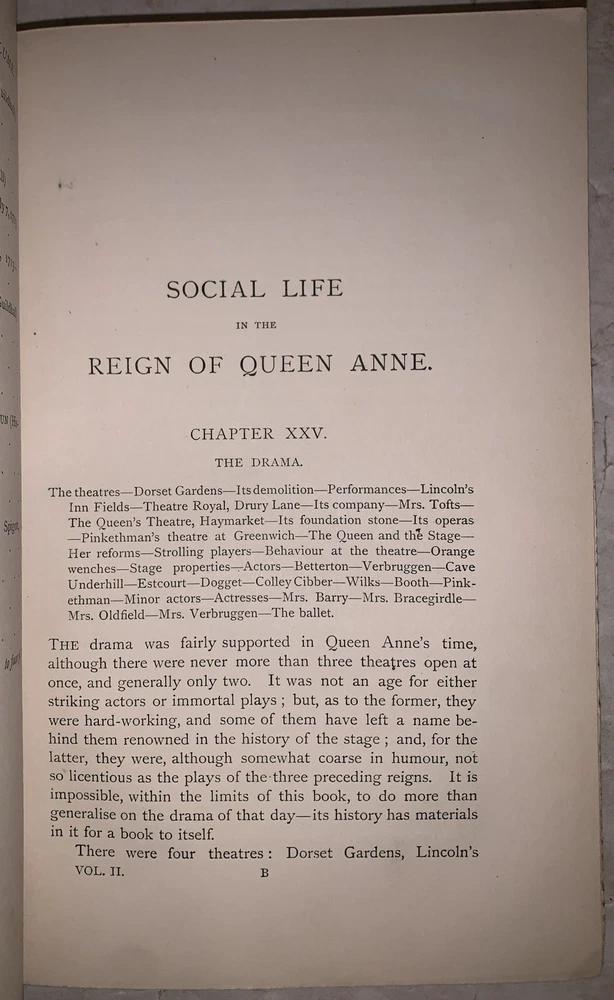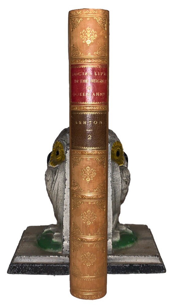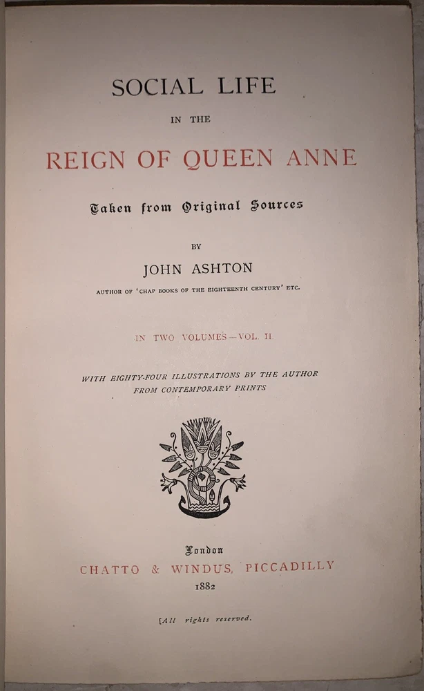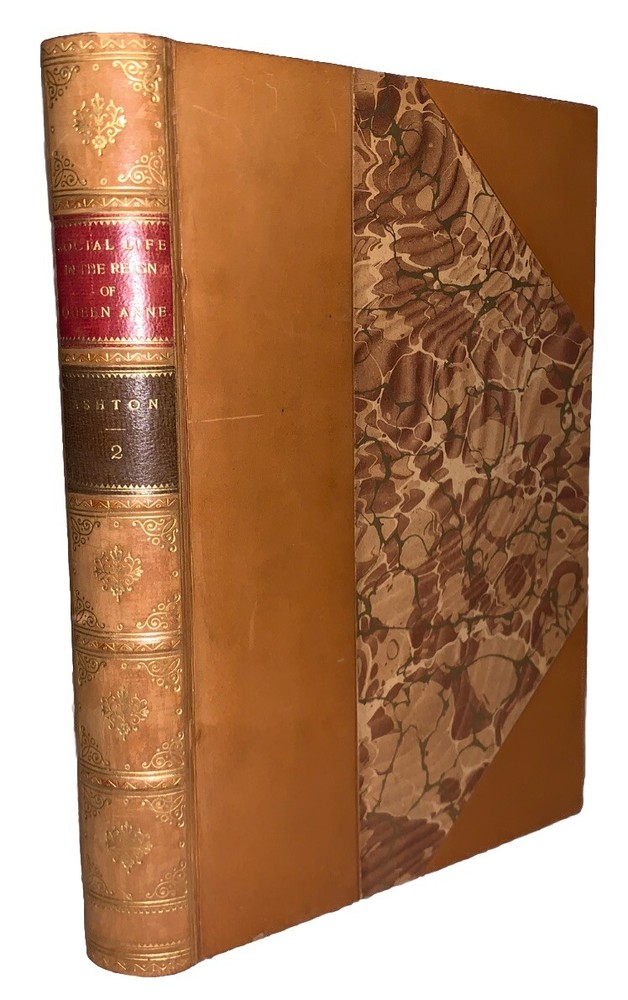 Social Life In The Reign Of Queen Anne, Taken from Original Sources by John Ashton In Two Volumes (Vol. II Only With Eighty-Four Illustrations by the Author from Contemporary Prints London: Chatto & Windus 1882 First Edition Octavo, xii, 272 pages, bound in period three quarther leather over mabrled boards. Spine with small raised bands, gilt lettering and decoration. Top edge gilt. Marbled endpapers. Illustrated in black and white including fold out in the rear. Some minimal rubbing, else in very good condition. If you have any questions, feel free to ask, and don't forget to check out my other listings.