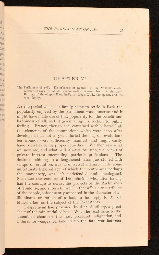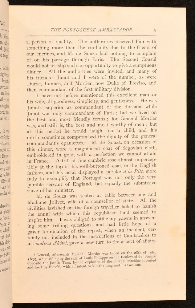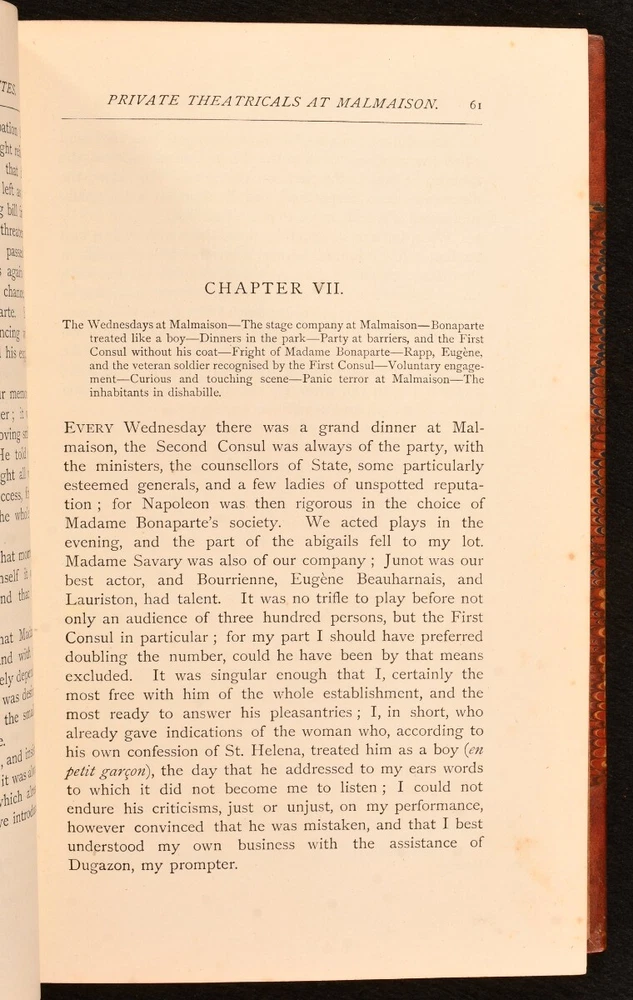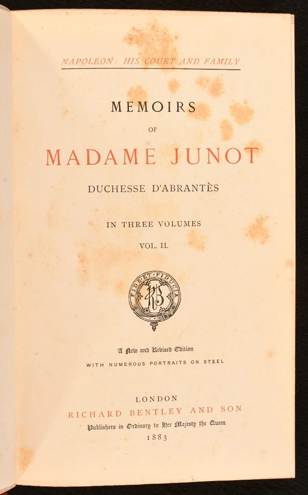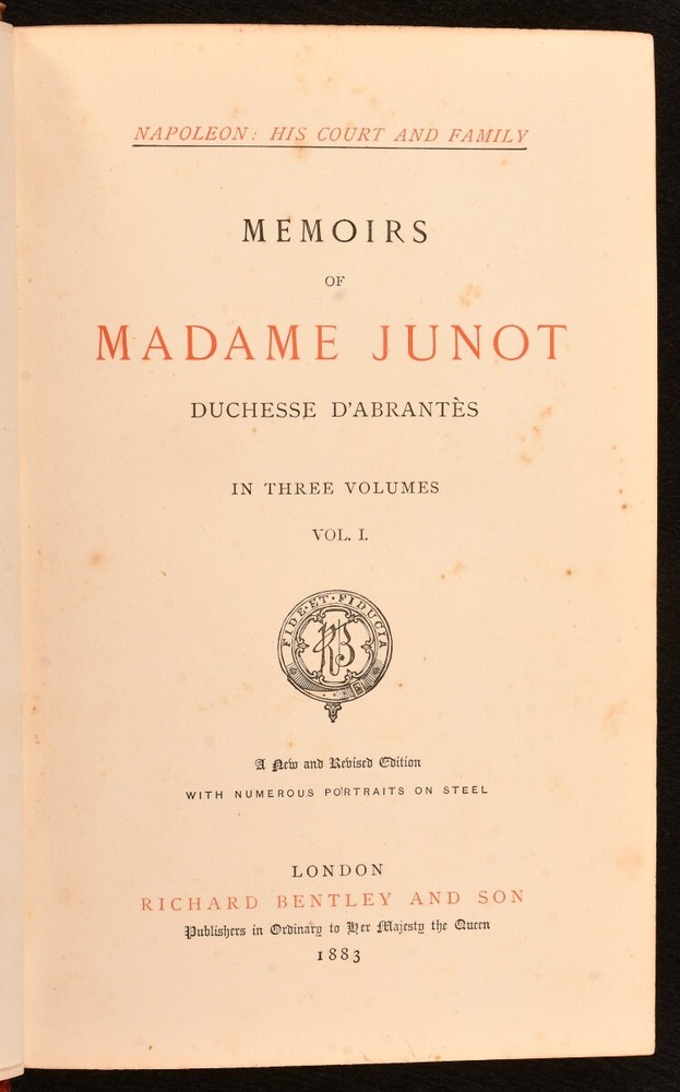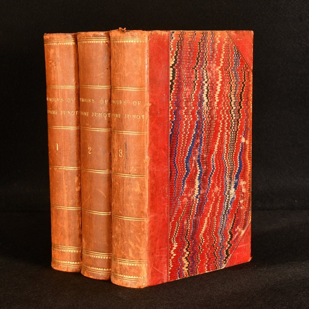 Click here to see our other books! Memoirs of Madame Junot Duchesse D'Abrantes Madame Junot 1883 Richard Bentley and Son : London 8.5" by 5.5" xxvi, 506; xvi, 522; xvi, 524pp. SUMMARY A new and revised edition of the memoirs of French writer, Madame Junot. Illustrated,Leather Binding,Original Binding,Publishers' Original Binding Overall Condition: Good This book weighs 2 KG when packed UK Postage: £ 3.99 US Postage: £ 29.99 EU Postage : £ 21.99 European Postage: £ 23.99 Asia Postage: £ 37.99 Worldwide Postage: £ 38.99 DESCRIPTION Complete in three volumes. New and revised edition. Volume one is illustrated with a frontispiece and six plates. Volume two is illustrated with a frontispiece and six plates. Volume three is illustrated with a frontispiece and five plates. Collated complete. The life of Laure Junot, Duchess of Abrantès, a French writer and the spouse of French general Jean-Andoche Junot. During the widowhood of her mother, the young Napoleon Bonaparte made an offer of marriage. Although he never did marry her mother, Bonaparte is noted to have frequented their house a good deal after the downfall of the Jacobin party. CONDITION Bound in half red calf with patterned boards. Externally, smart with rubbing to the extremities. Fading to the spine and the odd mark to the boards. Cracking to the joints with minor loss to the head of the spine of volume three. Front hinges starting but firm. Internally, firmly bound. Pages are very bright with light scattered spotting, predominantly to the first and last few pages. Overall Condition: Good GLOSSARY OF TERMS Overall Condition (Dustwrapper condition rating is shown after that for the book itself, where a dustwrapper is present) Fine - Very well preserved copy showing very little wear Very Good Indeed - Only one or two minor faults, really a very attractive copy Very Good - Quite a wide term meaning no major faults but probably several smaller ones often expected given the age of the book, but still a respectable copy Good - Meaning not very good. Some more serious faults as will be described in the condition report under 'condition' Good Only - Meaning one or more faults that could really do with repair Fair - As with good only above but with other faults leaving a compromised copy even after repair Poor - Really bad and possibly seriously incomplete. We only sell books in this condition where their rarity or value makes them attractive none the less. Major defects will be described. GUARANTEE We offer a full money back guarantee on our descriptions. Please ask for details and conditions. We prefer PAYPAL. If you pay via PAYPAL we will post the item off the same or the next working day with the postage you have selected. Please note we cannot accept USD cheques