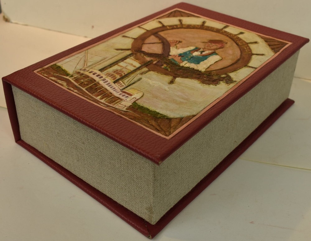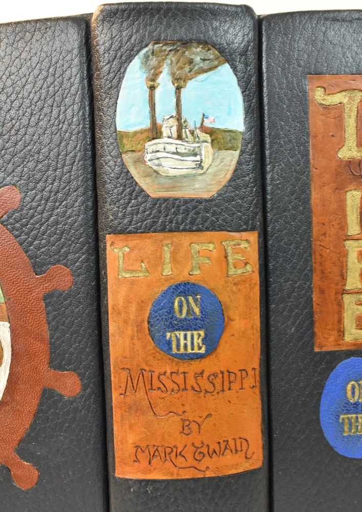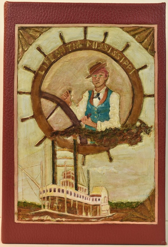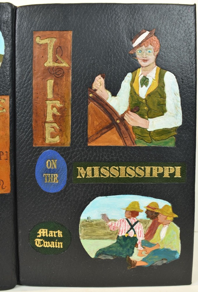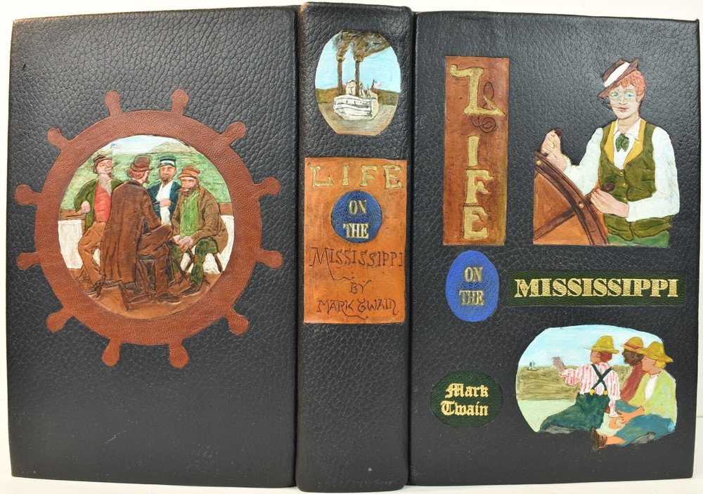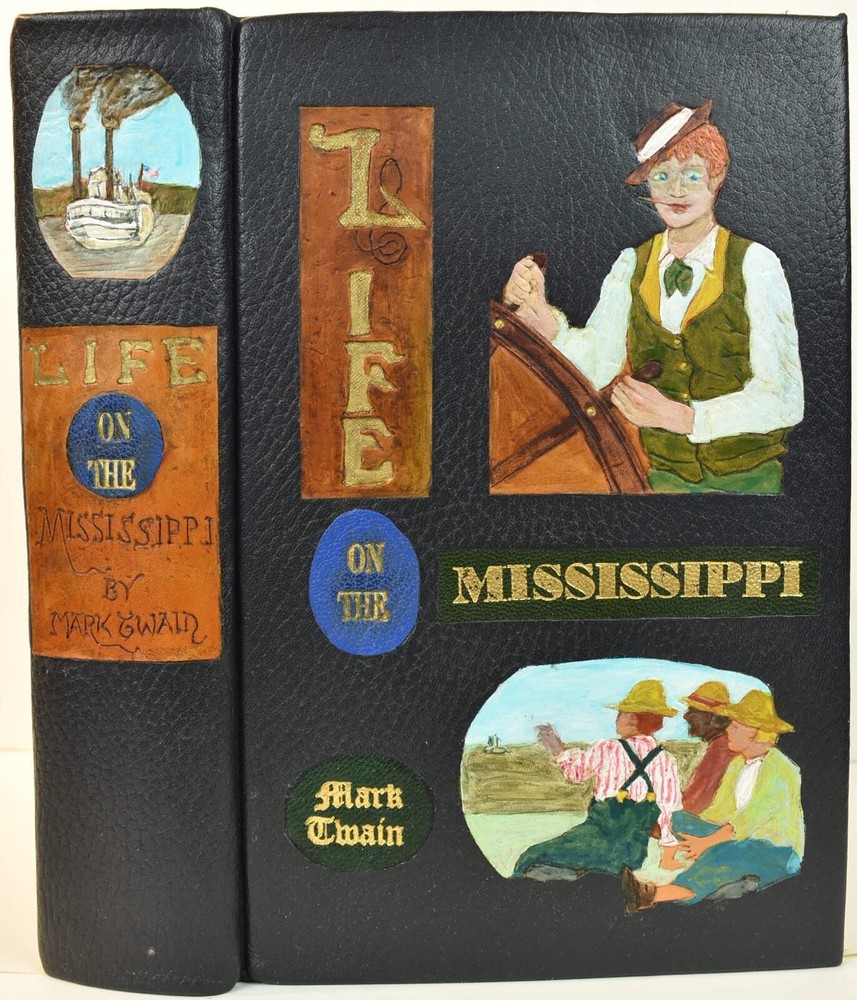 LIFE ON THE MISSISSIPPI Written by Mark Twain and published by James R. Osgood and Company, Boston; copyright 1883. This is the first edition; second state with 1883 on the title page and without “Twain in flames” (this image disturbed Twain’s wife Olivia) on page 441, and with St. Louis Hotel corrected to St. Charles Hotel on page 443. Like most of Twain’s book’s published in the 19th century, this book is profusely illustrated with 316 illustrations. The illustrations comprise an integral part of the book’s humor. This book has been rebound into a new leather binding that features hand-carved and colored inlay. It also comes in a similar leather clamshell box. All leather carving and coloring was done by me. Designs were taken from the original artwork in the book which were done many years ago by E. H. Garrett, Frank Merrill and John J. Harley LIFE ON THE MISSISSIPPI is a memoir by Mark Twain, of his days as a steamboat pilot on the Mississippi River before the American Civil War, and also a travel book, recounting his trip along the Mississippi many years after the Civil War. Twain once remarked that he considered this book his masterpiece, and that it would outlive his other works and endure as a classic. The book begins with a brief history of the river from its discovery by Hernando de Soto in 1542. It continues with anecdotes of Twain's training as a steamboat pilot, as the 'cub' of an experienced pilot. He describes, with great affection, the science of navigating the ever-changing Mississippi River in a section that was first published in 1876, entitled "Old Times on the Mississippi". In the second half, Twain narrates his trip many years later on a steamboat from St. Louis to New Orleans. He describes the competition from railroads, and the new, large cities, and adds his observations on greed, gullibility, tragedy, and bad architecture. He also tells some stories that are most likely tall tales. Simultaneously published in 1883 in the United States and Great Britain, it is said to be the first book submitted to a publisher as a typewritten manuscript. DESCRIPTION: 624 pages 8 3/4 x 6 inches unique artist designed leather bound hardcover with original 1883 First Edition Mark Twain text block CONDITION: This hard-cover book is in fine condition with a custom slip-case. The book has been rebound in full navy cowhide that has leather inlays that are hand-carved, dyed, tooled and colored by me—Bookpa. The interior is completely original with all pages and illustrations present. The book has been bound with new marbled paper (made by me) endpapers. The book is very old but is in remarkable condition considering that it is 130+ years old. The paper shows age toning but is clean overall. The paper shows age toning—as is the case with nearly all examples of this book because early pulp paper was used. This book may have been in a library at one time, although there are no stamps, numbers, pockets, etc., the margins have been cut down about 1/4” in length and width which was a common practice with library books. The interior is otherwise mostly clean with no foxing, major grubbiness or staining. There are a few smudges or finger-marks. I have pictures of the worst. There is a name and date (1887) written on the first blank endpaper. Binding and hinges are excellent as the book was rebound using traditional methods and non-acidic materials. The book is capable of being read using proper care if you so desire. The box is hand-made with heavy red leather with a hand-carved and stamped, colored leather inlay on the front or top panel. The interior of the box is covered with linen. BECAUSE MEDIA RATE SHIPPING IS FREE ON THE BOOKS I SELL, COMBINE THIS WITH OTHER ITEMS FROM MY EBAY STORE. I AM AN EXPERIENCED EBAY SELLER (23+ YEARS) AND SHIPPER WITH 100% (always!--since 1997!) FEEDBACK RATING. ALL ITEMS ARE CAREFULLY AND SECURELY PACKED TO REDUCE OR ELIMINATE DANGER OF CRUSHING AND OR WATER/MOISTURE DAMAGE. ALL BOOKS ARE SHIPPED IN STURDY BOXES WITH TRACKING AND DELIVERY CONFIRMATION INCLUDED. I PERSONALLY GUARANTEE ALL OF THE BOOKS, AUTOGRAPHS AND SIGNATURES ON BOOKS I SELL.