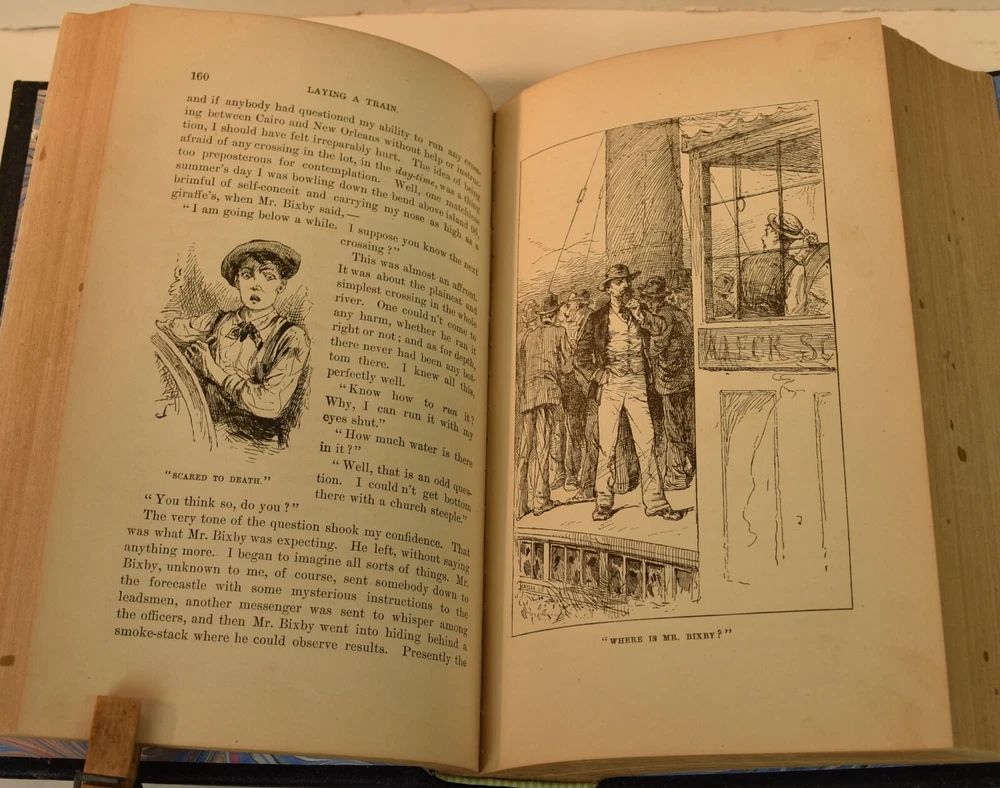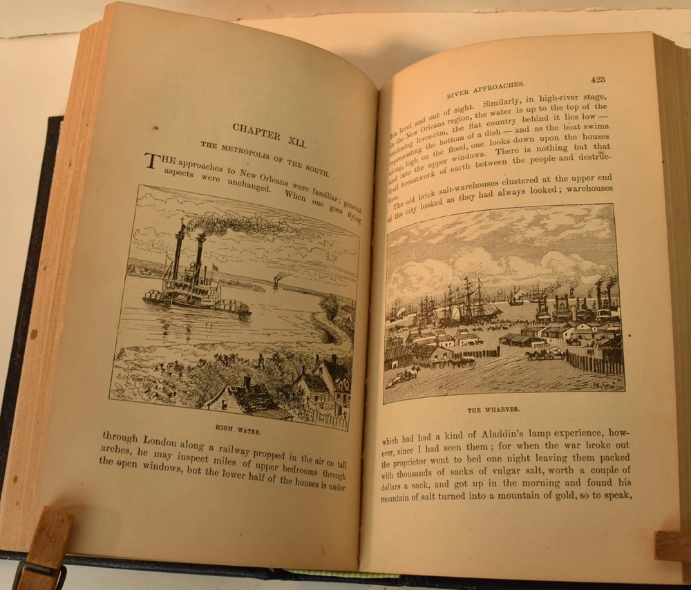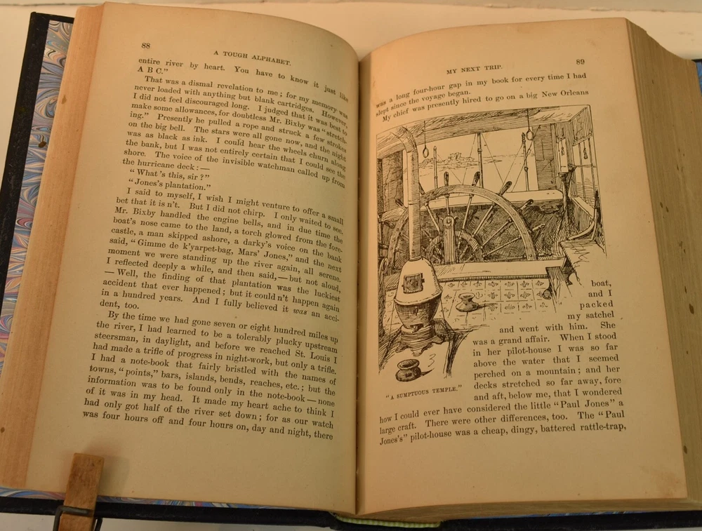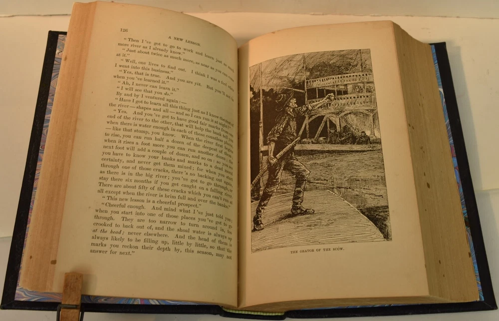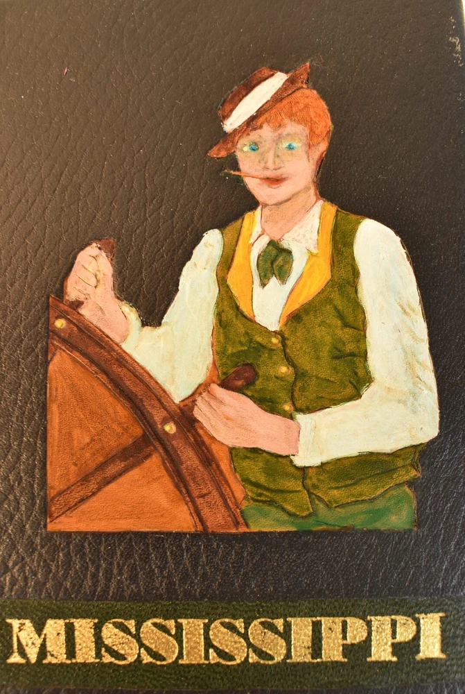 LIFE ON THE MISSISSIPPI Written by Mark Twain and published by James R. Osgood and Company, Boston; copyright 1883. This is the first edition; second state with 1883 on the title page and without “Twain in flames” (this image disturbed Twain’s wife Olivia) on page 441, and with St. Louis Hotel corrected to St. Charles Hotel on page 443. Like most of Twain’s book’s published in the 19th century, this book is profusely illustrated with 316 illustrations. The illustrations comprise an integral part of the book’s humor. This book has been rebound into a new leather binding that features hand-carved and colored inlay. It also comes in a similar leather clamshell box. All leather carving and coloring was done by me. Designs were taken from the original artwork in the book which were done many years ago by E. H. Garrett, Frank Merrill and John J. Harley LIFE ON THE MISSISSIPPI is a memoir by Mark Twain, of his days as a steamboat pilot on the Mississippi River before the American Civil War, and also a travel book, recounting his trip along the Mississippi many years after the Civil War. Twain once remarked that he considered this book his masterpiece, and that it would outlive his other works and endure as a classic. The book begins with a brief history of the river from its discovery by Hernando de Soto in 1542. It continues with anecdotes of Twain's training as a steamboat pilot, as the 'cub' of an experienced pilot. He describes, with great affection, the science of navigating the ever-changing Mississippi River in a section that was first published in 1876, entitled "Old Times on the Mississippi". In the second half, Twain narrates his trip many years later on a steamboat from St. Louis to New Orleans. He describes the competition from railroads, and the new, large cities, and adds his observations on greed, gullibility, tragedy, and bad architecture. He also tells some stories that are most likely tall tales. Simultaneously published in 1883 in the United States and Great Britain, it is said to be the first book submitted to a publisher as a typewritten manuscript. DESCRIPTION: 624 pages 8 3/4 x 6 inches unique artist designed leather bound hardcover with original 1883 First Edition Mark Twain text block CONDITION: This hard-cover book is in fine condition with a custom slip-case. The book has been rebound in full navy cowhide that has leather inlays that are hand-carved, dyed, tooled and colored by me—Bookpa. The interior is completely original with all pages and illustrations present. The book has been bound with new marbled paper (made by me) endpapers. The book is very old but is in remarkable condition considering that it is 130+ years old. The paper shows age toning but is clean overall. The paper shows age toning—as is the case with nearly all examples of this book because early pulp paper was used. This book may have been in a library at one time, although there are no stamps, numbers, pockets, etc., the margins have been cut down about 1/4” in length and width which was a common practice with library books. The interior is otherwise mostly clean with no foxing, major grubbiness or staining. There are a few smudges or finger-marks. I have pictures of the worst. There is a name and date (1887) written on the first blank endpaper. Binding and hinges are excellent as the book was rebound using traditional methods and non-acidic materials. The book is capable of being read using proper care if you so desire. The box is hand-made with heavy red leather with a hand-carved and stamped, colored leather inlay on the front or top panel. The interior of the box is covered with linen. BECAUSE MEDIA RATE SHIPPING IS FREE ON THE BOOKS I SELL, COMBINE THIS WITH OTHER ITEMS FROM MY EBAY STORE. I AM AN EXPERIENCED EBAY SELLER (23+ YEARS) AND SHIPPER WITH 100% (always!--since 1997!) FEEDBACK RATING. ALL ITEMS ARE CAREFULLY AND SECURELY PACKED TO REDUCE OR ELIMINATE DANGER OF CRUSHING AND OR WATER/MOISTURE DAMAGE. ALL BOOKS ARE SHIPPED IN STURDY BOXES WITH TRACKING AND DELIVERY CONFIRMATION INCLUDED. I PERSONALLY GUARANTEE ALL OF THE BOOKS, AUTOGRAPHS AND SIGNATURES ON BOOKS I SELL.