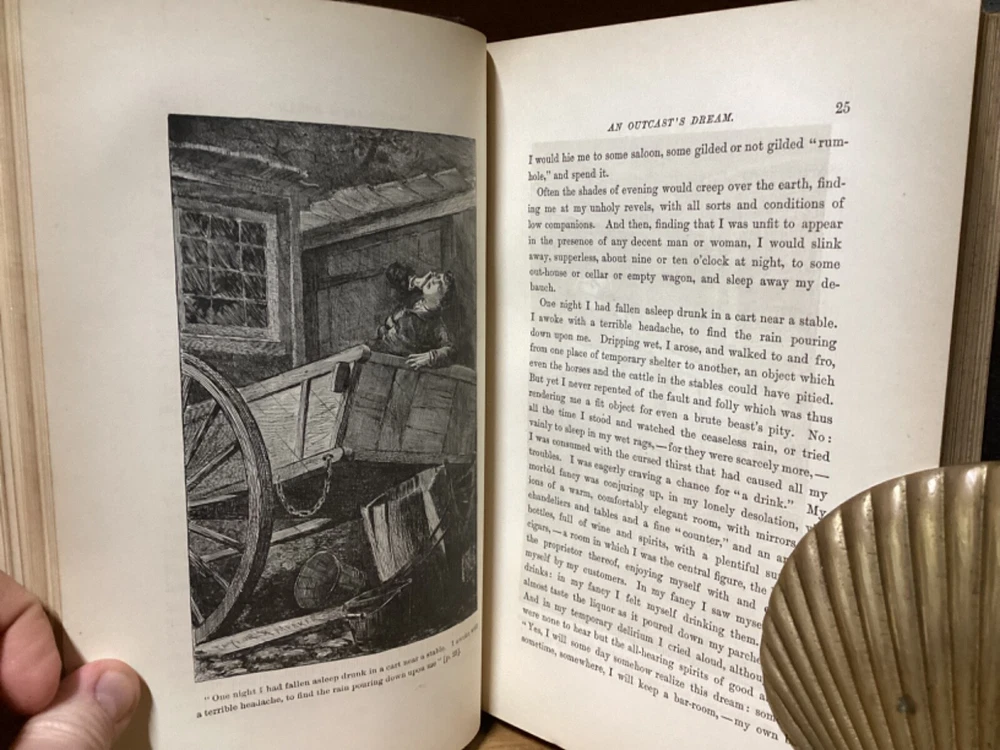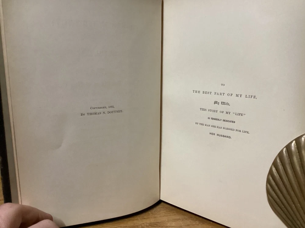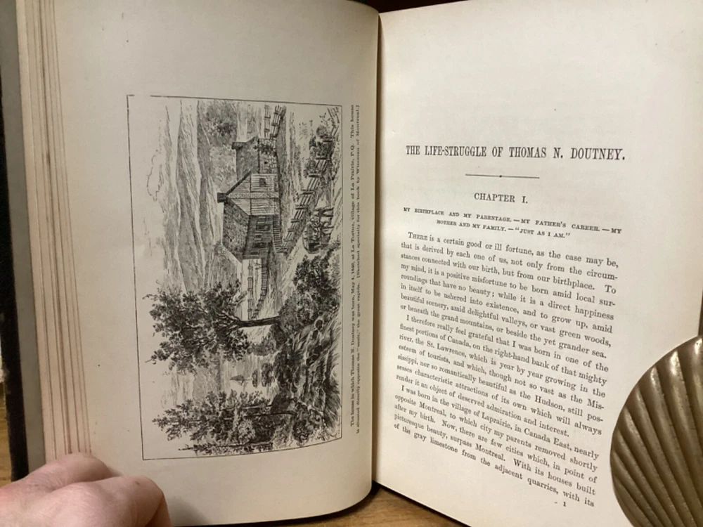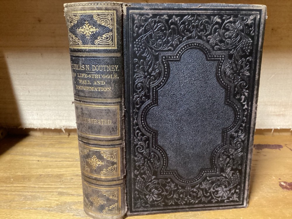 Thomas N. Doutney: HIs Life-Struggle, Fall, and Reformation. Also a Vivid Pen-Picture of New York. Together with a History of the Work he has Accomplished as a Temperance Reformer. Written by Himself. Printed in Boston by the Franklin Press. 1883. [14] + 544 + [12]. 8vo. Hardcover decorative full leather. Overall good, with superficial rubbing and wear to exterior, primarily along edges and corners of board and spine. Some cracking to front hinge. Text block remains in good condition with light wear. Includes frontispiece portraits of Thomas and Helen Doutney at front. Illustrated throughout with numerous black-and-white sketches. General age-related toning to pages, along with periodic foxing and wear. Please see photographs and ask any questions prior to purchasing. A scarce piece on the life of Thomas N. Doutney, a 19th Century temperance reformer. An early edition, with reprints being published into the early 20th Century. COLU1883ABFX