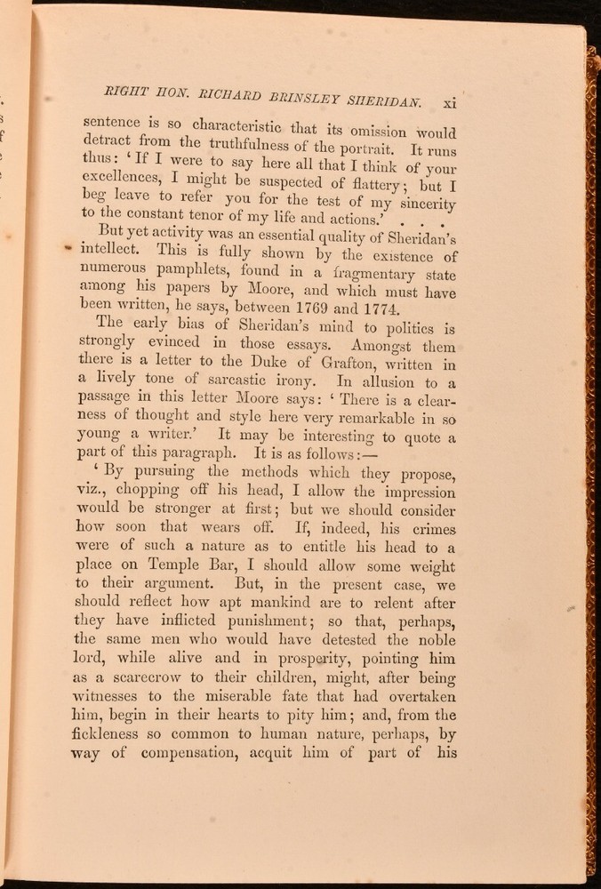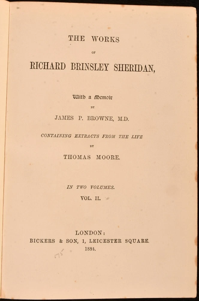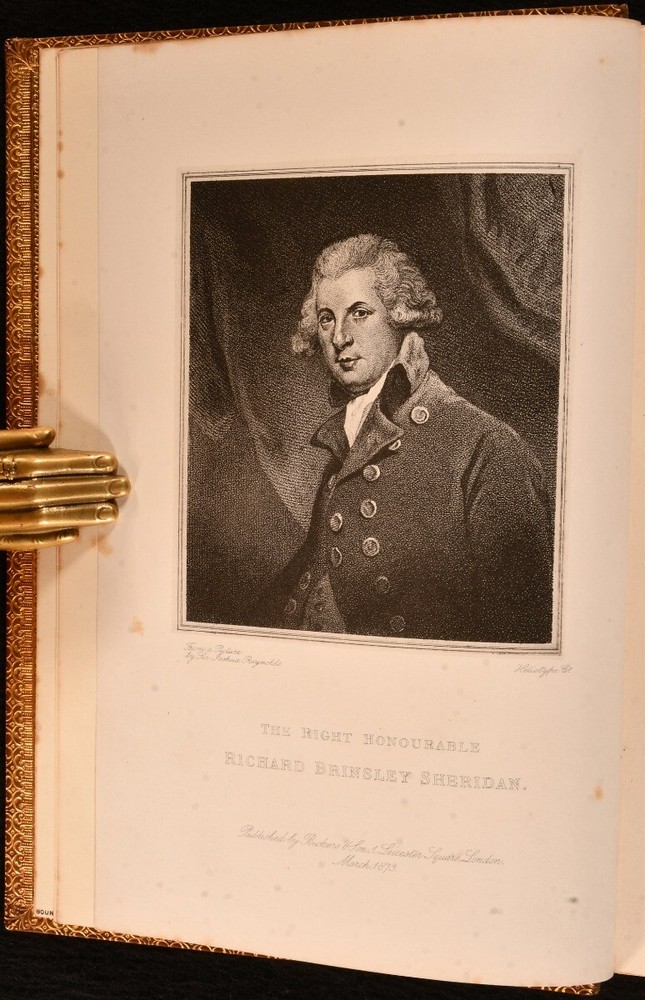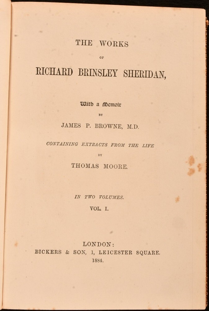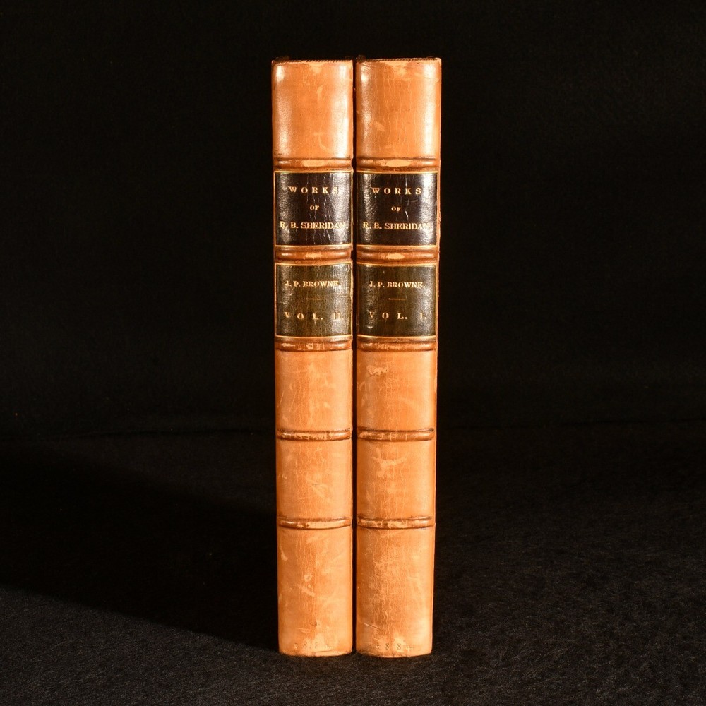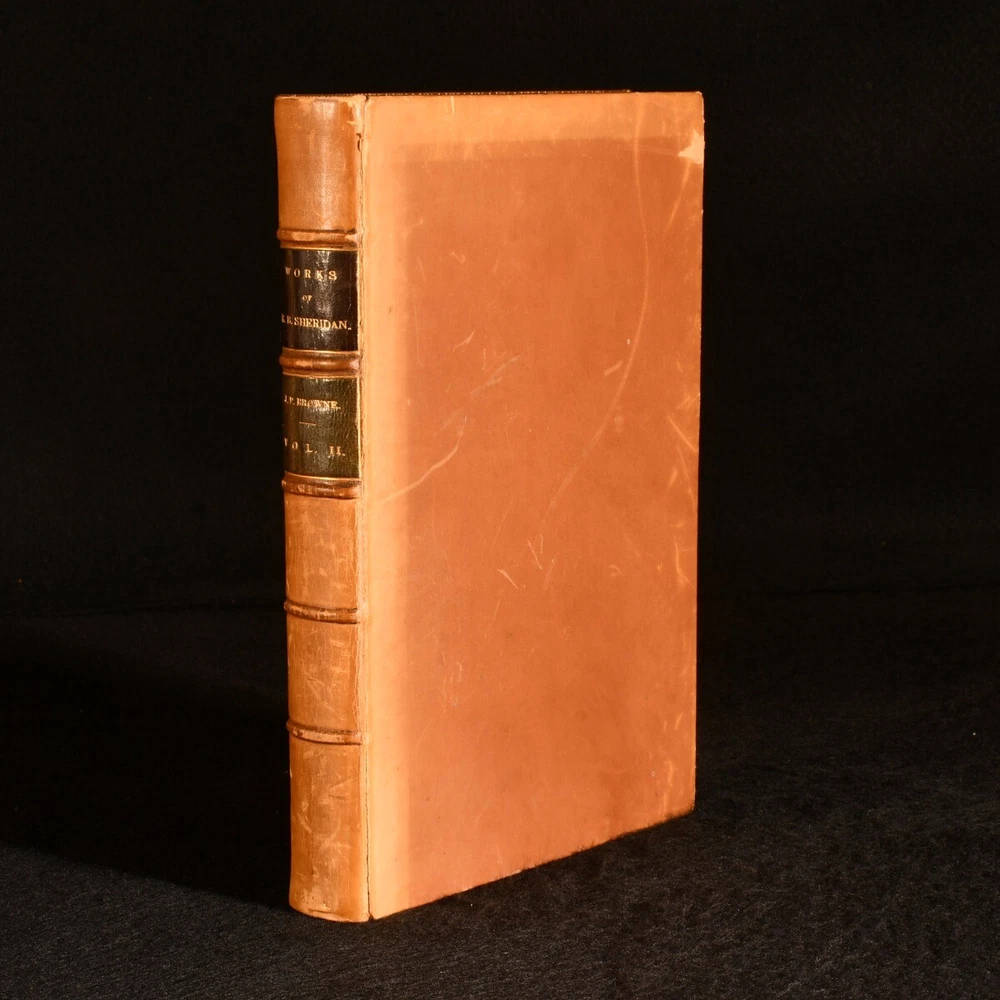 Click here to see our other books! The Works of Richard Brinsley Sheridan, With a Memoir by James P. Browne, M. D. Containing Extracts from the Life by Thomas Moore Richard Brinsley Sheridan; James P. Browne; Thomas Moore 1884 Bickers and Son : London 9" by 6" li, 292; [6], 316pp SUMMARY A leather bound two-volume set containing the works of Sheridan, together with a memoir by James P. Browne. Leather Binding,Signed Binding Overall Condition: Very Good This book weighs 1.5 KG when packed UK Postage: £ 3.99 US Postage: £ 23.99 EU Postage : £ 18.99 European Postage: £ 19.99 Asia Postage: £ 31.99 Worldwide Postage: £ 32.99 DESCRIPTION A set of works from Irish-born playwright impresario and Whig politician, Richard Brinsley Sheridan. Complete in two volumes. Bound in signed full calf by Zaehnsdorf, with gilt dentelles. Includes his notorious plays such as 'The Rivals', 'The Duenna' and 'The School for Scandal', with a memoir to the beginning of Volume I by James P. Browne. Browne uses extracts from Thomas Moore's biographical work on the playwright, 'Memoirs of the Life of Richard Brinsley Sheridan' originally published in 1825. With a monochrome frontispiece to Volume I. CONDITION In full signed calf binding by Zaehnsdorf. Externally, smart. With sunning to the spines and part of Vol. II front board. Slight rubbing to the extremities, heaviest to the spines. Internally, firmly bound with bright and clean pages. Overall Condition: Very Good GLOSSARY OF TERMS Overall Condition (Dustwrapper condition rating is shown after that for the book itself, where a dustwrapper is present) Fine - Very well preserved copy showing very little wear Very Good Indeed - Only one or two minor faults, really a very attractive copy Very Good - Quite a wide term meaning no major faults but probably several smaller ones often expected given the age of the book, but still a respectable copy Good - Meaning not very good. Some more serious faults as will be described in the condition report under 'condition' Good Only - Meaning one or more faults that could really do with repair Fair - As with good only above but with other faults leaving a compromised copy even after repair Poor - Really bad and possibly seriously incomplete. We only sell books in this condition where their rarity or value makes them attractive none the less. Major defects will be described. GUARANTEE We offer a full money back guarantee on our descriptions. Please ask for details and conditions. We prefer PAYPAL. If you pay via PAYPAL we will post the item off the same or the next working day with the postage you have selected. Please note we cannot accept USD cheques