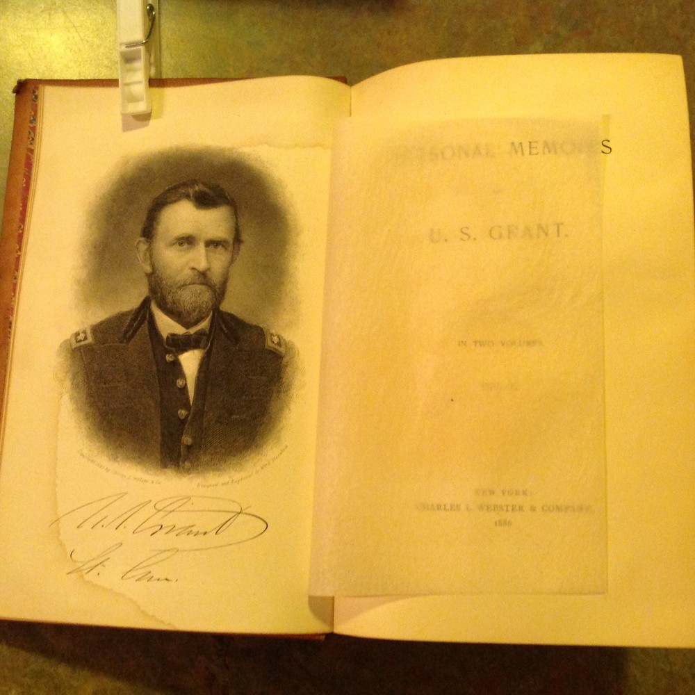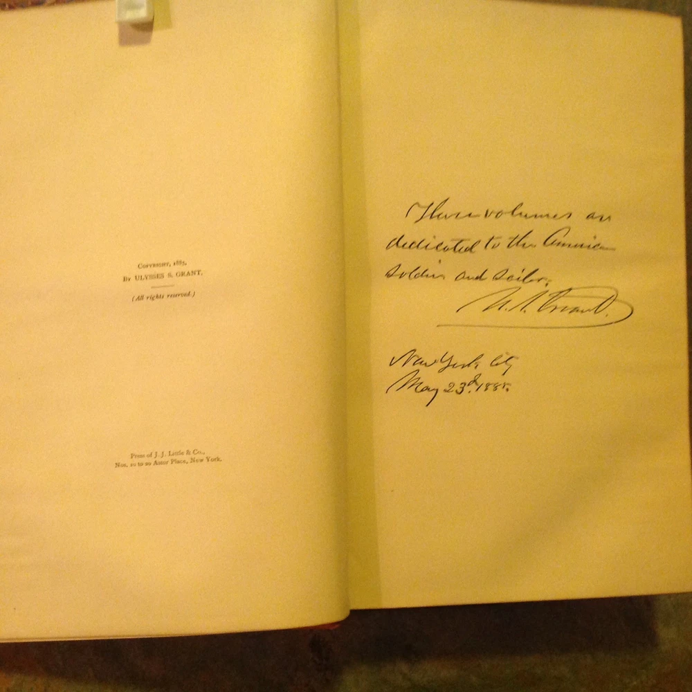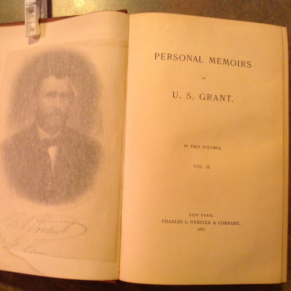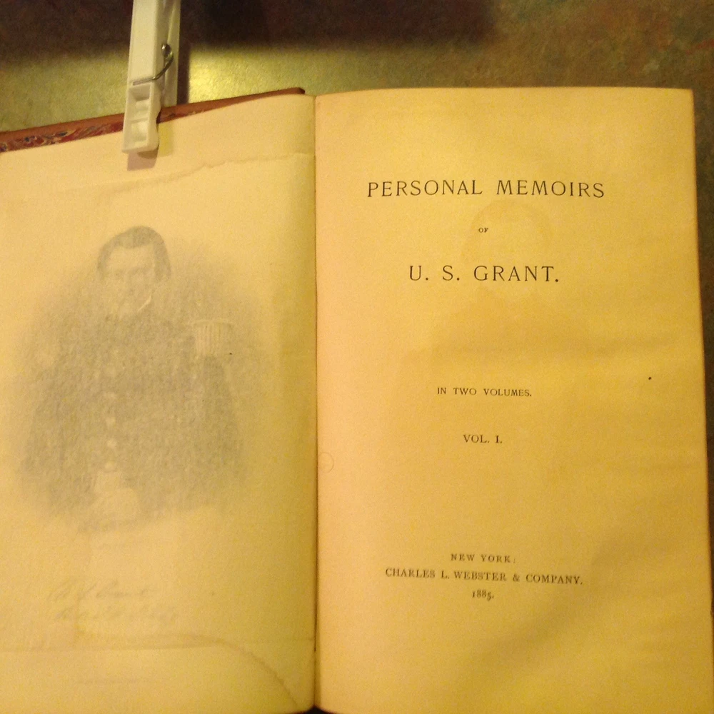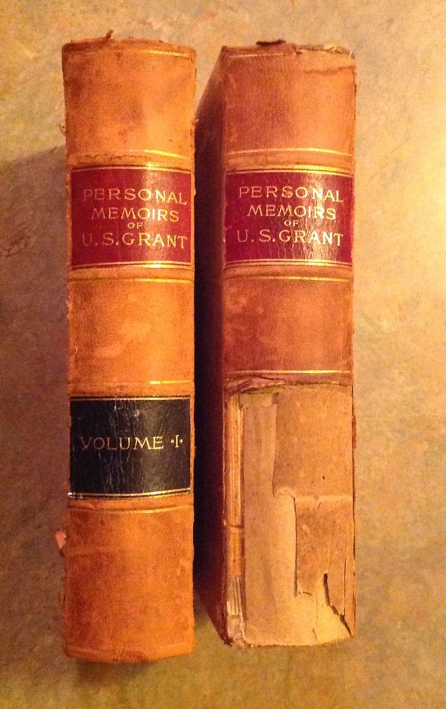 Up for sale is this great 1885 Leather Personal Memoirs of U S Grant in 2 volumes. This autobiography was written by Mark Twain and completed as Grant was dying of cancer in 1885. This book was published shortly after his death. (Wikipedia) These 2 books are in good condition for their 134 year age. There is a part of the binding on the second edition that is missing and some water staining from long ago. All of the pages and images are clear. There is damage to the fold out letters but it looks like the pieces are still in the first volume. These books measure 6.25" by 9.25" with 584 and 647 pages. Thanks for looking!