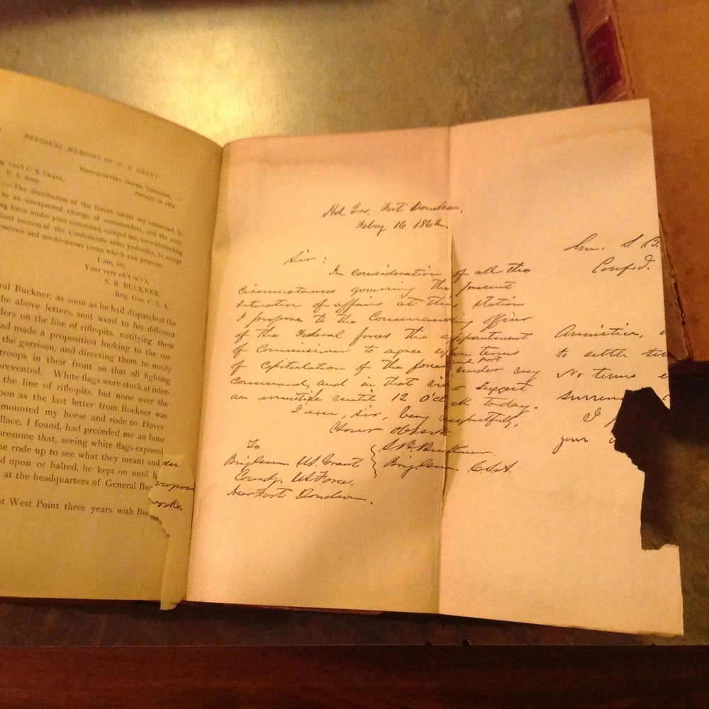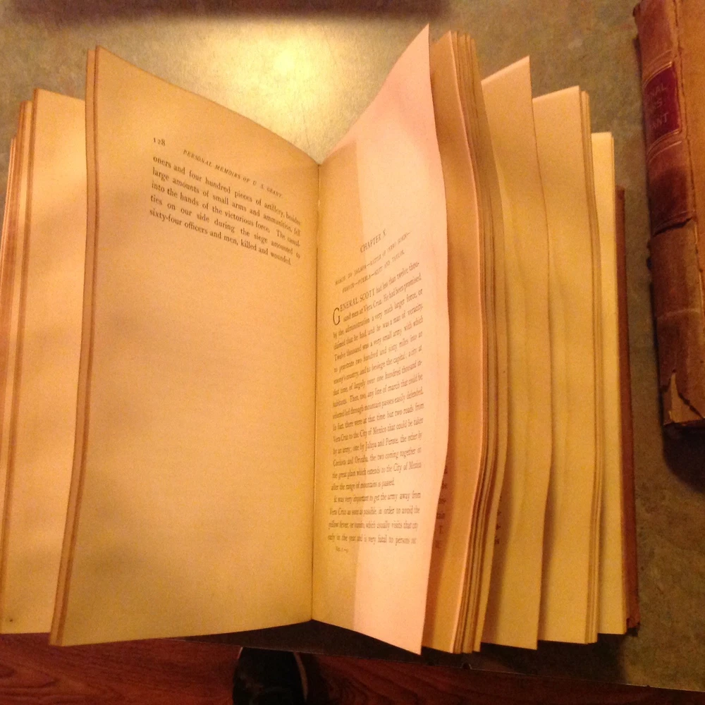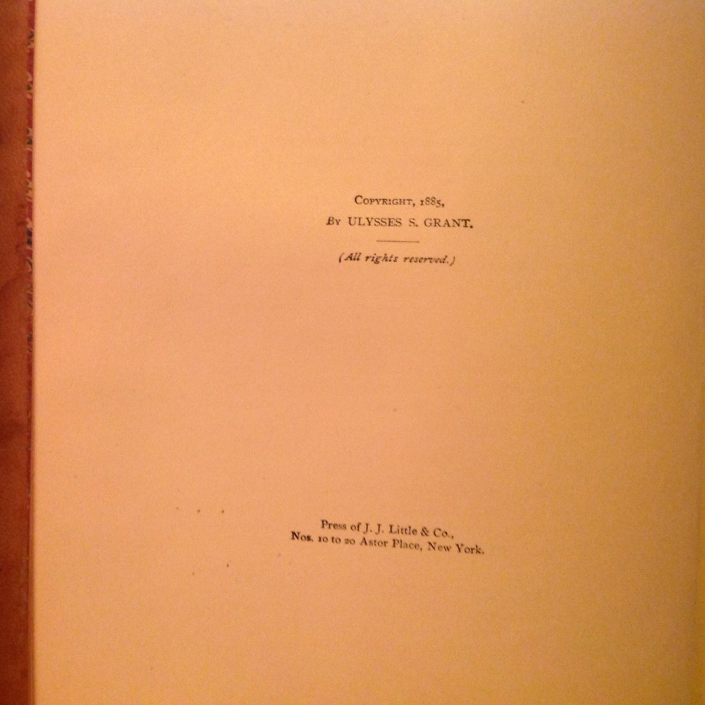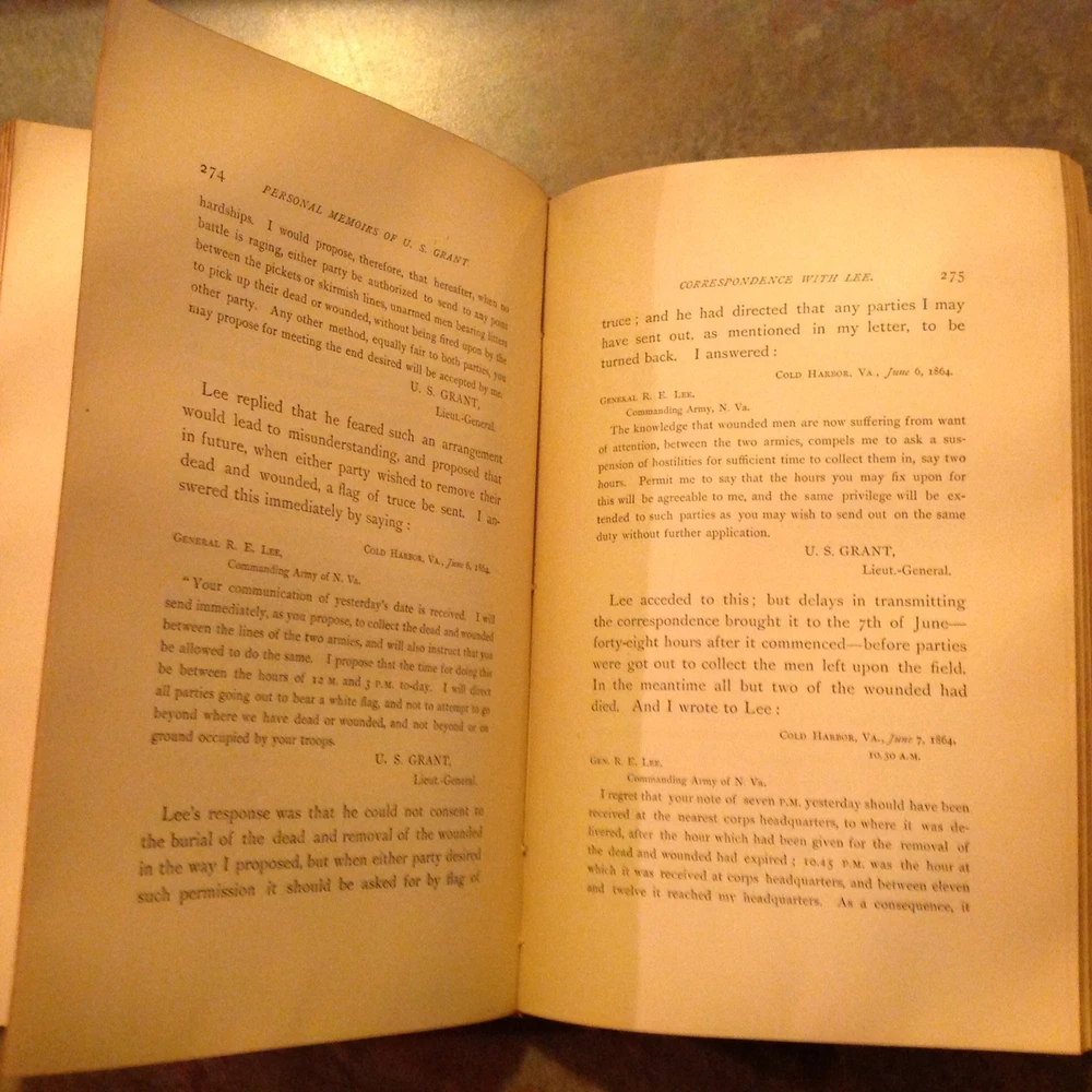 Up for sale is this great 1885 Leather Personal Memoirs of U S Grant in 2 volumes. This autobiography was written by Mark Twain and completed as Grant was dying of cancer in 1885. This book was published shortly after his death. (Wikipedia) These 2 books are in good condition for their 134 year age. There is a part of the binding on the second edition that is missing and some water staining from long ago. All of the pages and images are clear. There is damage to the fold out letters but it looks like the pieces are still in the first volume. These books measure 6.25" by 9.25" with 584 and 647 pages. Thanks for looking!