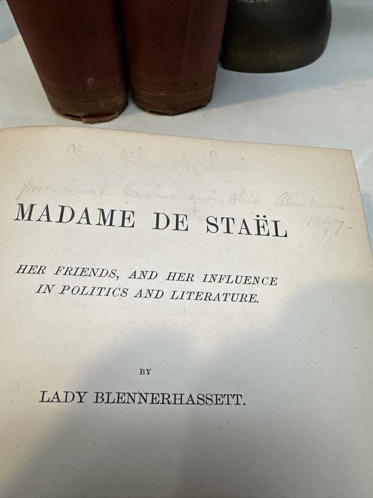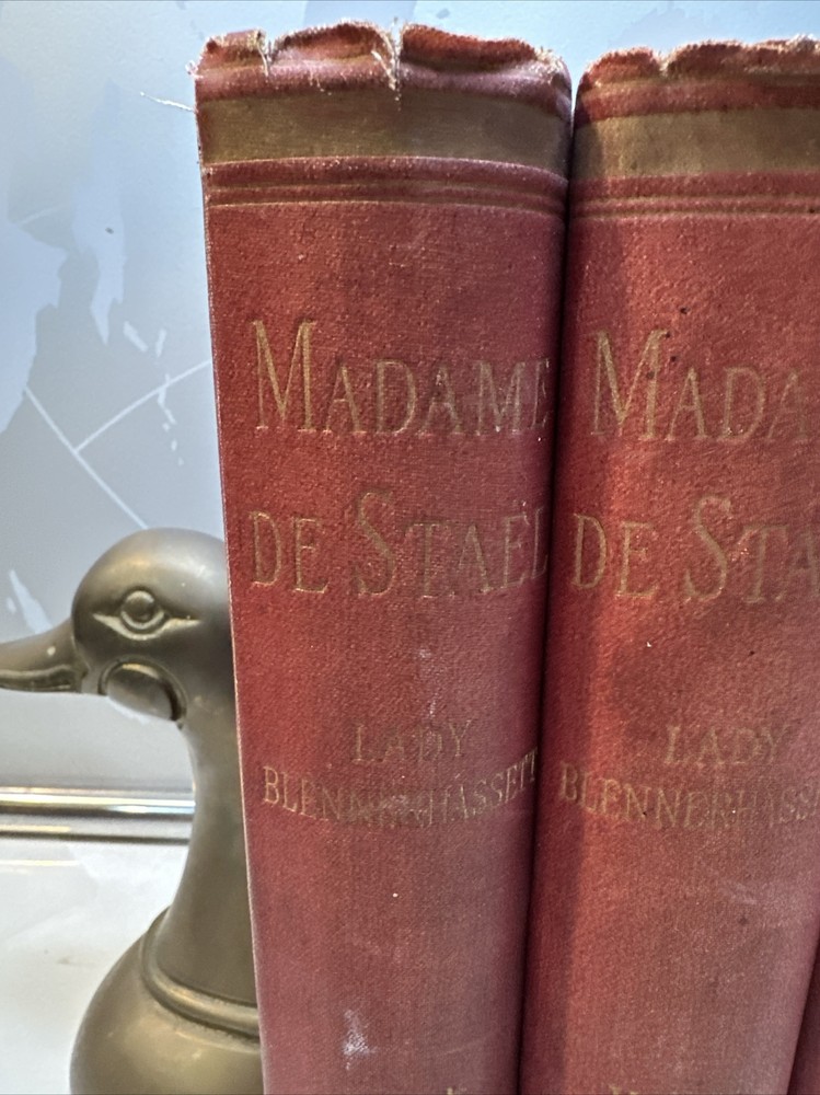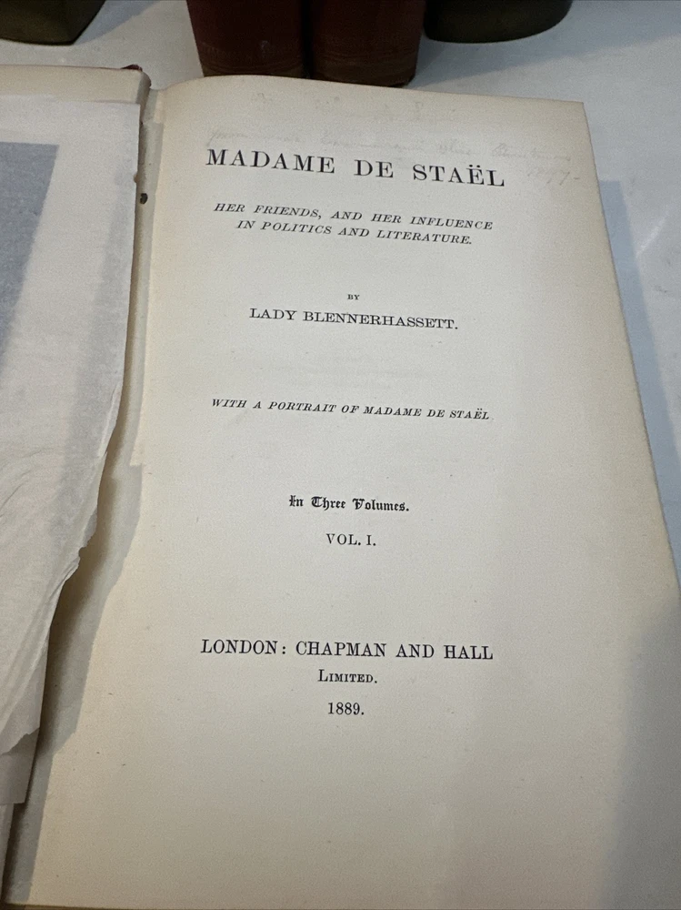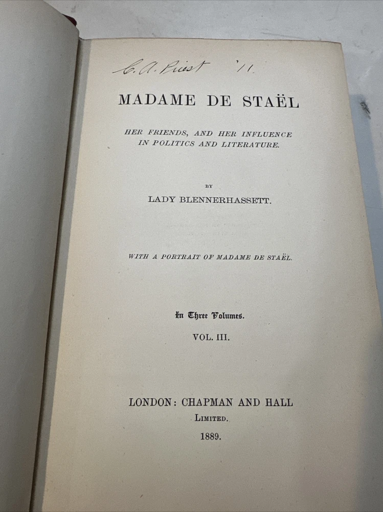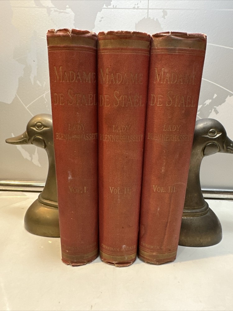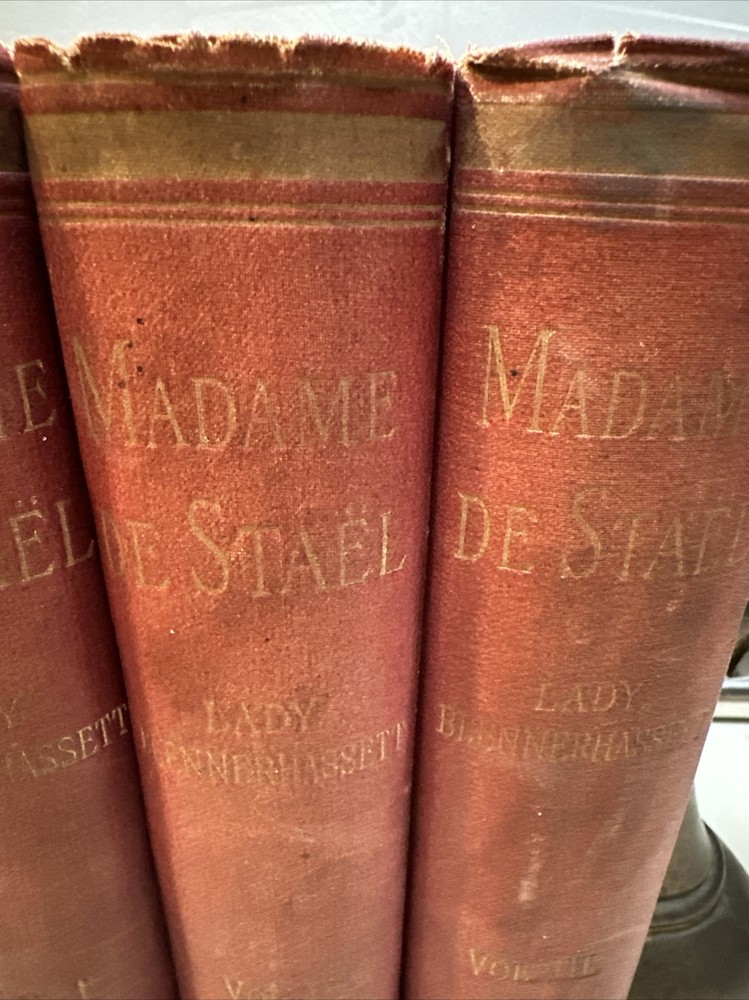 This three-volume set from 1889 explores the life of Madame de Stael and her circle of friends, including the political influence she held. The books are bound in leather and were published by Chapman and Hall in London. The author, Lady Blennerhassett, provides a firsthand account of true stories and events, all in English. The set is an original print from 1889 and contains no special attributes or illustrations. This antique is a must-have for any collector of rare and valuable books. Madame de Staël was an important figure during the French Revolution and the birth of democracy. Books are in good condition to very good. Some pages remain un cut. There are some inscriptions on front pages. Some bindings are beginning to separate but still holding.