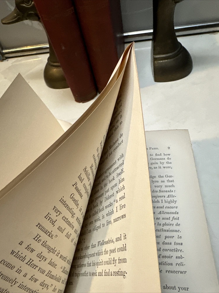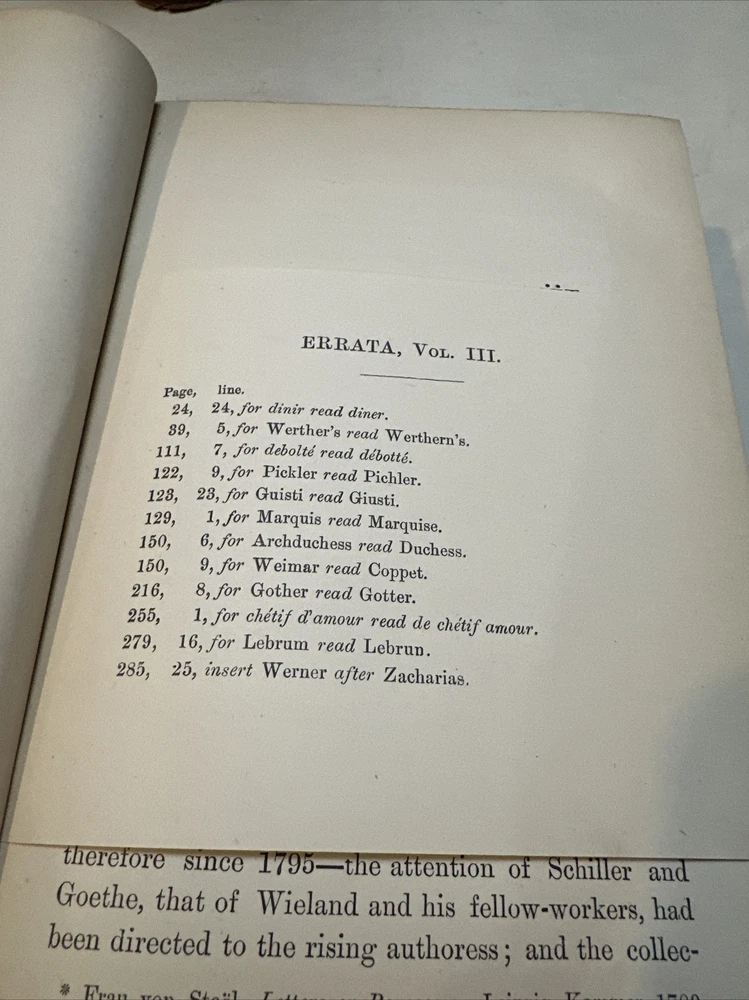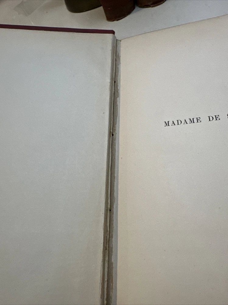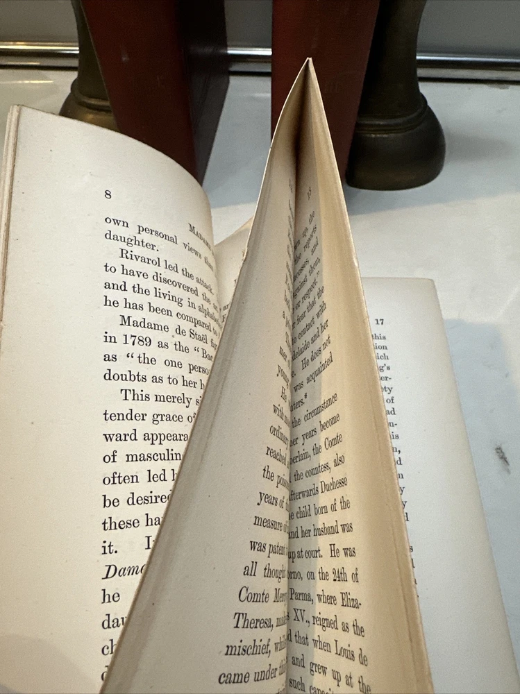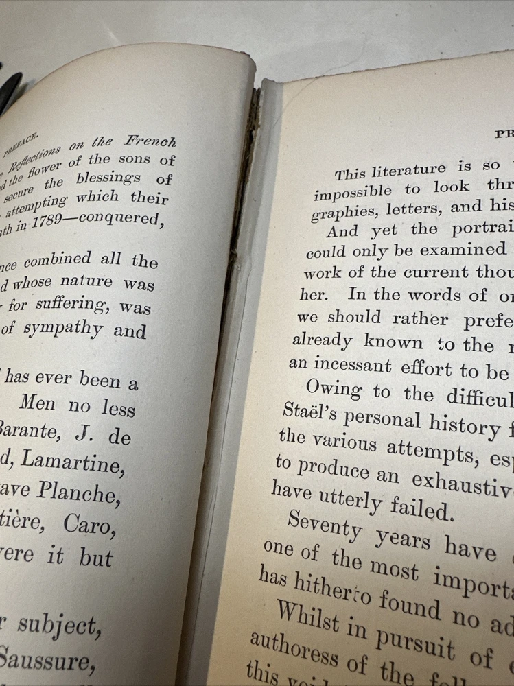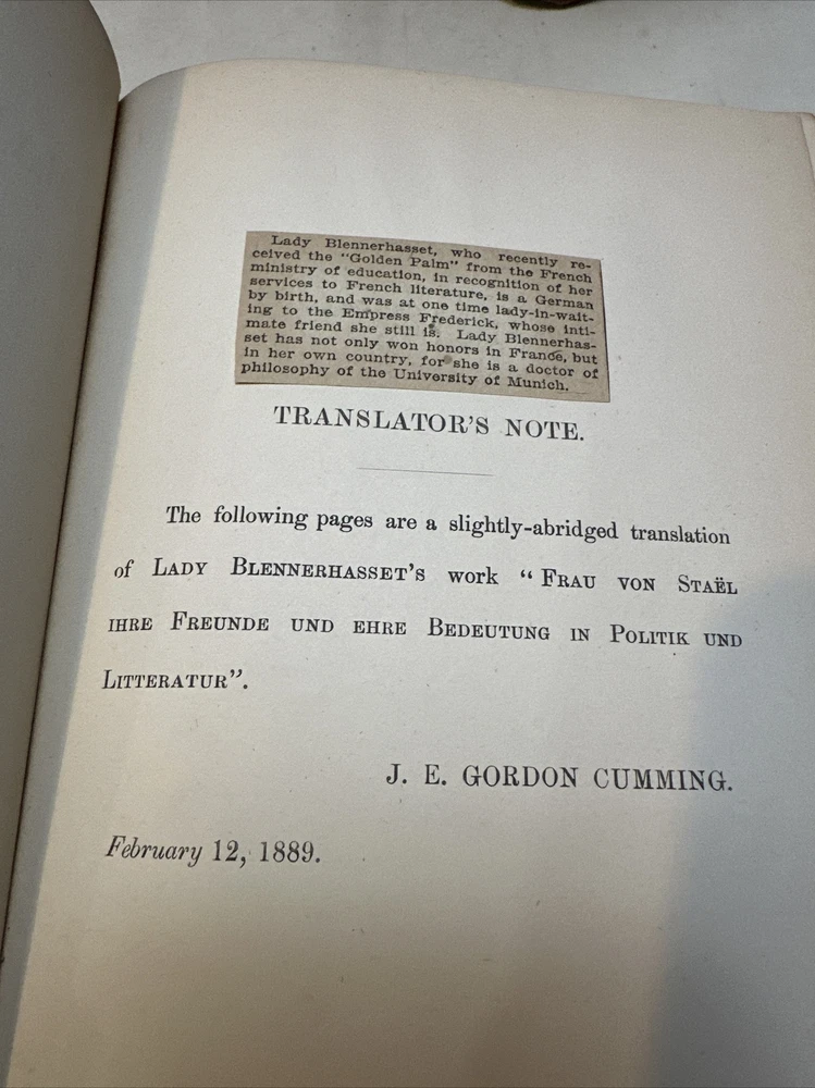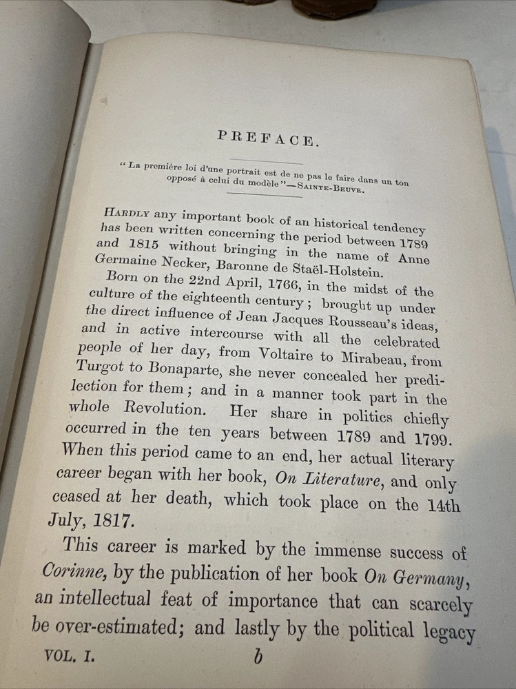 This three-volume set from 1889 explores the life of Madame de Stael and her circle of friends, including the political influence she held. The books are bound in leather and were published by Chapman and Hall in London. The author, Lady Blennerhassett, provides a firsthand account of true stories and events, all in English. The set is an original print from 1889 and contains no special attributes or illustrations. This antique is a must-have for any collector of rare and valuable books. Madame de Staël was an important figure during the French Revolution and the birth of democracy. Books are in good condition to very good. Some pages remain un cut. There are some inscriptions on front pages. Some bindings are beginning to separate but still holding.