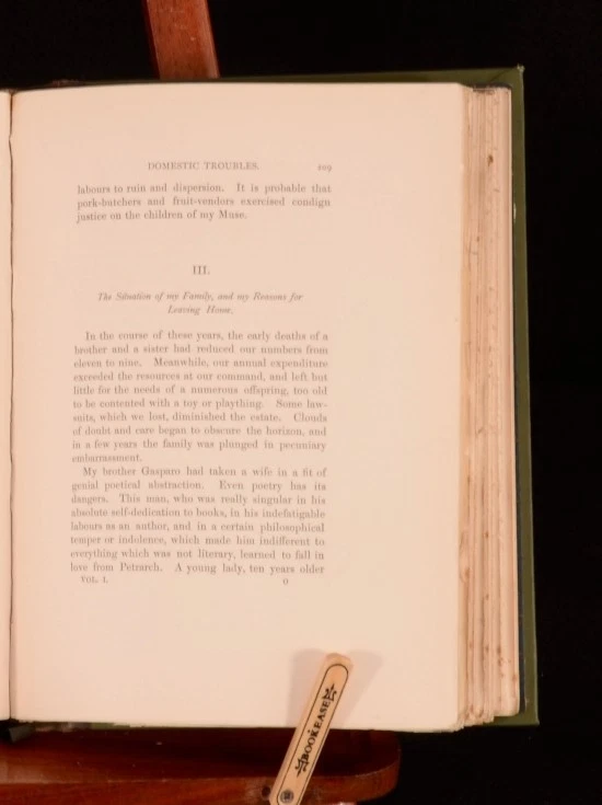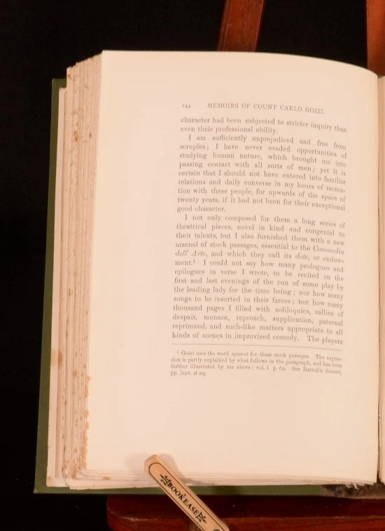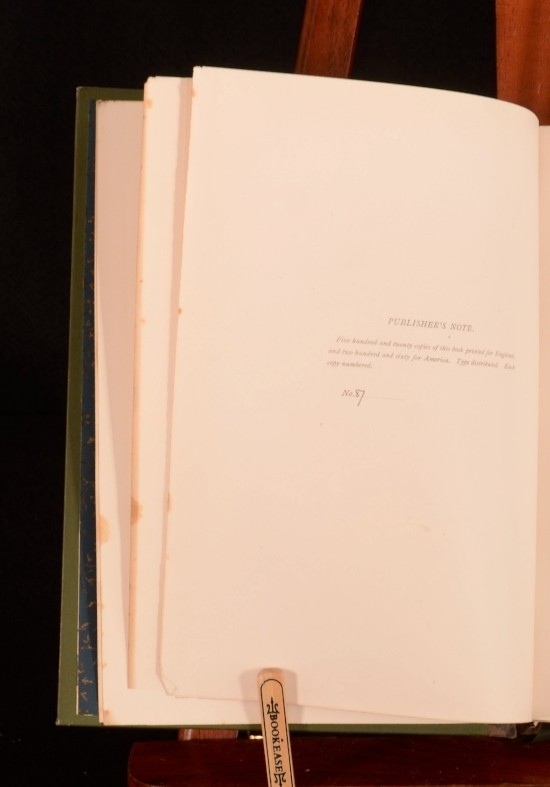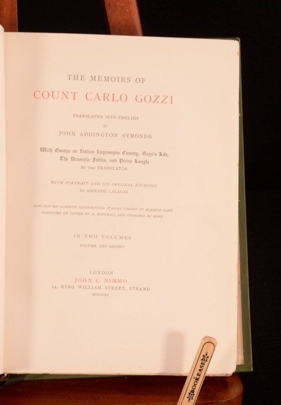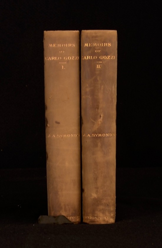 Click here to see our other books! The Memoirs of Count Carlo Gozzi John Addington Symonds (Trans.) 1890 John C. Nimmo : London 9.5" by 7.5" xiv, 371, 379pp SUMMARY The limited illustrated edition of John Addington Symonds' translation of the memoirs of the Italian playwright Count Gozzi. Illustrated,Leather Binding,Limited Edition Overall Condition: Very Good Indeed This book weighs 3 KG when packed UK Postage: £ 3.99 US Postage: £ 36.99 EU Postage : £ 25.99 European Postage: £ 27.99 Asia Postage: £ 47.99 Worldwide Postage: £ 69.99 DESCRIPTION Number 87 of 210 copies with hand coloured plates. Symonds wrote a number of biographies of writers and artists, and these often reflected his interest in the Renaissance, as in this case. He was also an early advocate of homosexuality, and despite being married to a woman, he wrote poetry inspired by his homosexual affairs. Count Gozzi was born in Venice in 1720. He had to support himself due to his father's debts, so he joined the army in Dalmatia at the age of sixteen. On his return to Venice he gained a reputation as the wittiest member of the Granelleschi Society, to which he had gained entry through the publication of a number of satirical pieces. Through the 1750s and 60s he published works in the Traditional Tuscan style, which satirised the French inspired Pietro Chiari and Carlo Goldoni. His work has been much praised by Goethe, among many other critics. In later years he produced tragedies, but did not find the same success as for his early work. This edition was limited to 780 copies: 520 for England and 260 for America. This is number 87. It is illustrated with the subject's portrait and six etchings by Adolphe Lalauze, and eleven illustrations of Italian Comedy by Maurice Sand. Direct from the library of the late Hugh Selbourne MD (1906-1973) a noted book collector and diarist. Collated, complete. CONDITION In quarter calf with printed cloth boards. The boards show the armorial crest of Count Gozzi. Externally smart, though the spines are somewhat rubbed. The text blocks are untrimmed, though the edges are still reasonably clean if a little spotted. Internally clean and bright, and firmly bound. Overall Condition: Very Good Indeed GLOSSARY OF TERMS Overall Condition (Dustwrapper condition rating is shown after that for the book itself, where a dustwrapper is present) Fine - Very well preserved copy showing very little wear Very Good Indeed - Only one or two minor faults, really a very attractive copy Very Good - Quite a wide term meaning no major faults but probably several smaller ones often expected given the age of the book, but still a respectable copy Good - Meaning not very good. Some more serious faults as will be described in the condition report under 'condition' Good Only - Meaning one or more faults that could really do with repair Fair - As with good only above but with other faults leaving a compromised copy even after repair Poor - Really bad and possibly seriously incomplete. We only sell books in this condition where their rarity or value makes them attractive none the less. Major defects will be described. GUARANTEE We offer a full money back guarantee on our descriptions. Please ask for details and conditions. We prefer PAYPAL. If you pay via PAYPAL we will post the item off the same or the next working day with the postage you have selected. Please note we cannot accept USD cheques