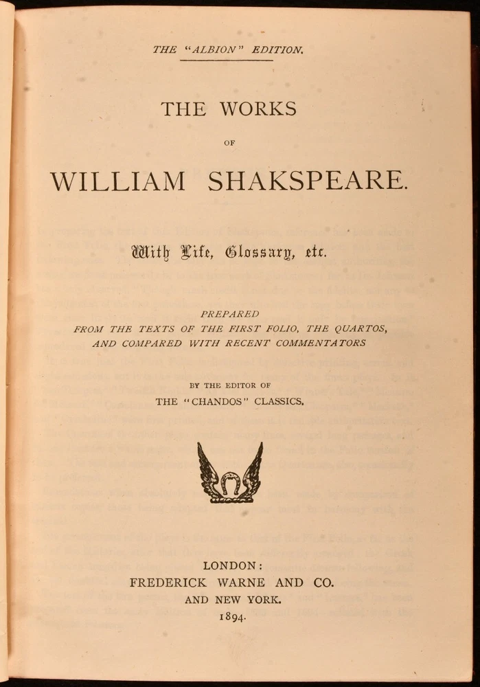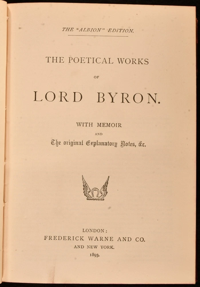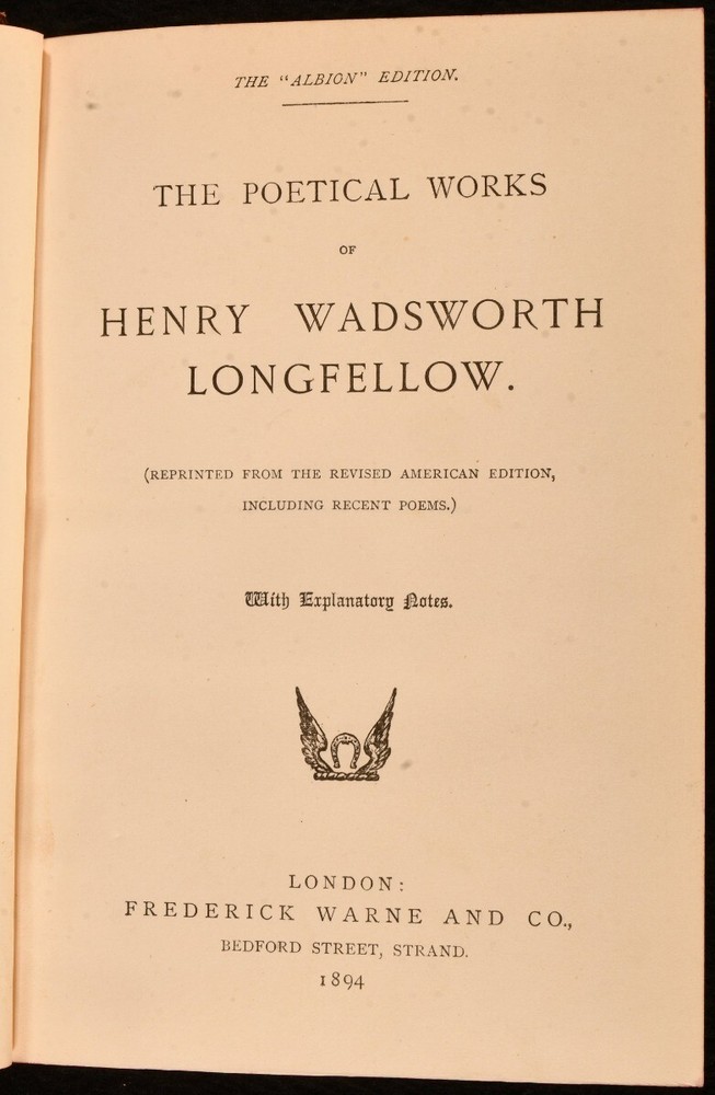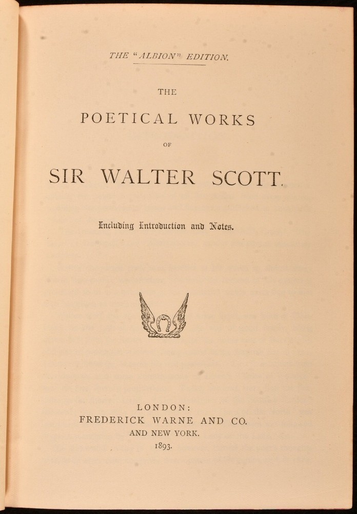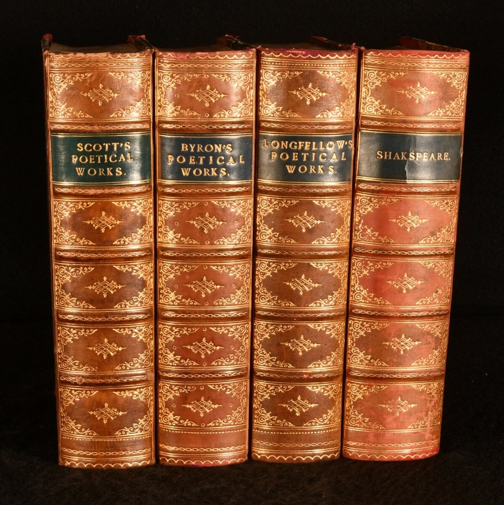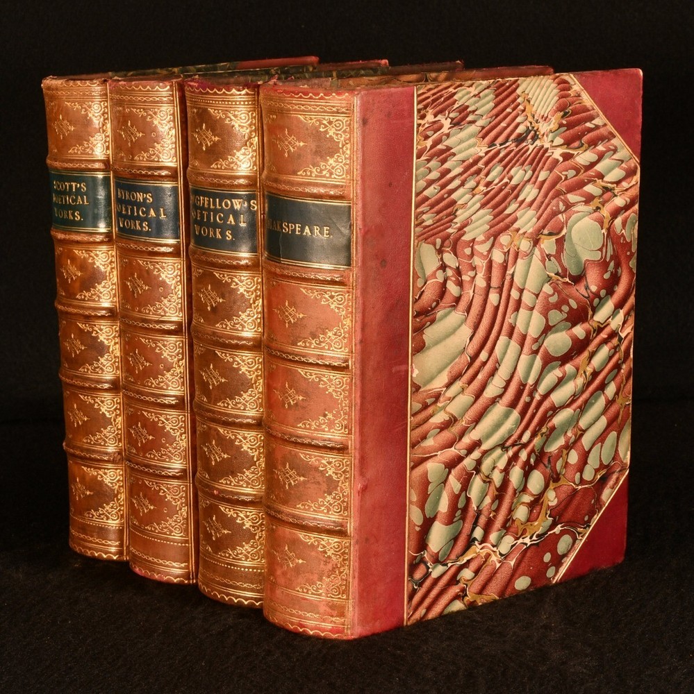 Click here to see our other books! 1893 The Poetical Works of Lord Byron. With Memoir and The original Explanatory Notes, &c. 1893 The Poetical Works of Sir Walter Scott: Including Introduction and Notes 1894 The Poetical Works of Henry Wadsworth Longfellow (Reprinted from the Revised American Edition, including Recent Poems.) 1894 The Works of Shakespeare. With Life, Glossary, etc. Prepared from the Texts of the First Folio, the Quartos, and Compared with Recent Commentators. Sir Walter Scott 1893 Frederick Warne and Co. : London 7.5" by 5.5" xvi, 720pp; viii, 758pp; x, 630pp; xvi, 1136pp SUMMARY A half leather bound collection of poetical works from Longfellow, Scott and Byron, as well as classic plays from William Shakespeare. Leather Binding Overall Condition: Very Good Indeed This book weighs 4 KG when packed UK Postage: £ 4.49 US Postage: £ 39.99 EU Postage : £ 26.99 European Postage: £ 36.99 Asia Postage: £ 65.99 Worldwide Postage: £ 99.99 DESCRIPTION This set of four volumes contains the "Albion" editions of these works. All in half calf binding with marbled boards and gilt detailing. This set of works include: 1893 The Poetical Works of Lord Byron. With Memoir and The original Explanatory Notes, &c. Including works such as 'Hours of Idleness' and 'Childe Harold's Pilgrimage'. 1893 The Poetical Works of Sir Walter Scott: Including Introduction and Notes Includes 'The Lady of the Lake', 'The Lay of the Last Minstrel' and a series of miscellaneous poems. 1894 The Poetical Works of Henry Wadsworth Longfellow (Reprinted from the revised American Edition, including recent poems). Includes early works such as 'An April Day', his sonnets and an array of miscellaneous poems. 1894 The Works of Shakespeare. With Life, Glossary, etc. Contains a memoir of the playwright as well as his will. Features classic works such as 'The Tempest' and 'Romeo and Juliet'. CONDITION In half calf binding with marbled boards and gilt detailing. Externally, with rubbing to the extremities, heaviest to the spines. Small losses of leather to 'Walter Scott' and 'Longfellow'. Fading to the spine. Marks to the boards. Internally, firmly bound. Pages are generally bright and clean. Contemporary ink inscription to the front endpaper of 'Walter Scott'. Overall Condition: Very Good Indeed GLOSSARY OF TERMS Overall Condition (Dustwrapper condition rating is shown after that for the book itself, where a dustwrapper is present) Fine - Very well preserved copy showing very little wear Very Good Indeed - Only one or two minor faults, really a very attractive copy Very Good - Quite a wide term meaning no major faults but probably several smaller ones often expected given the age of the book, but still a respectable copy Good - Meaning not very good. Some more serious faults as will be described in the condition report under 'condition' Good Only - Meaning one or more faults that could really do with repair Fair - As with good only above but with other faults leaving a compromised copy even after repair Poor - Really bad and possibly seriously incomplete. We only sell books in this condition where their rarity or value makes them attractive none the less. Major defects will be described. GUARANTEE We offer a full money back guarantee on our descriptions. Please ask for details and conditions. We prefer PAYPAL. If you pay via PAYPAL we will post the item off the same or the next working day with the postage you have selected. Please note we cannot accept USD cheques