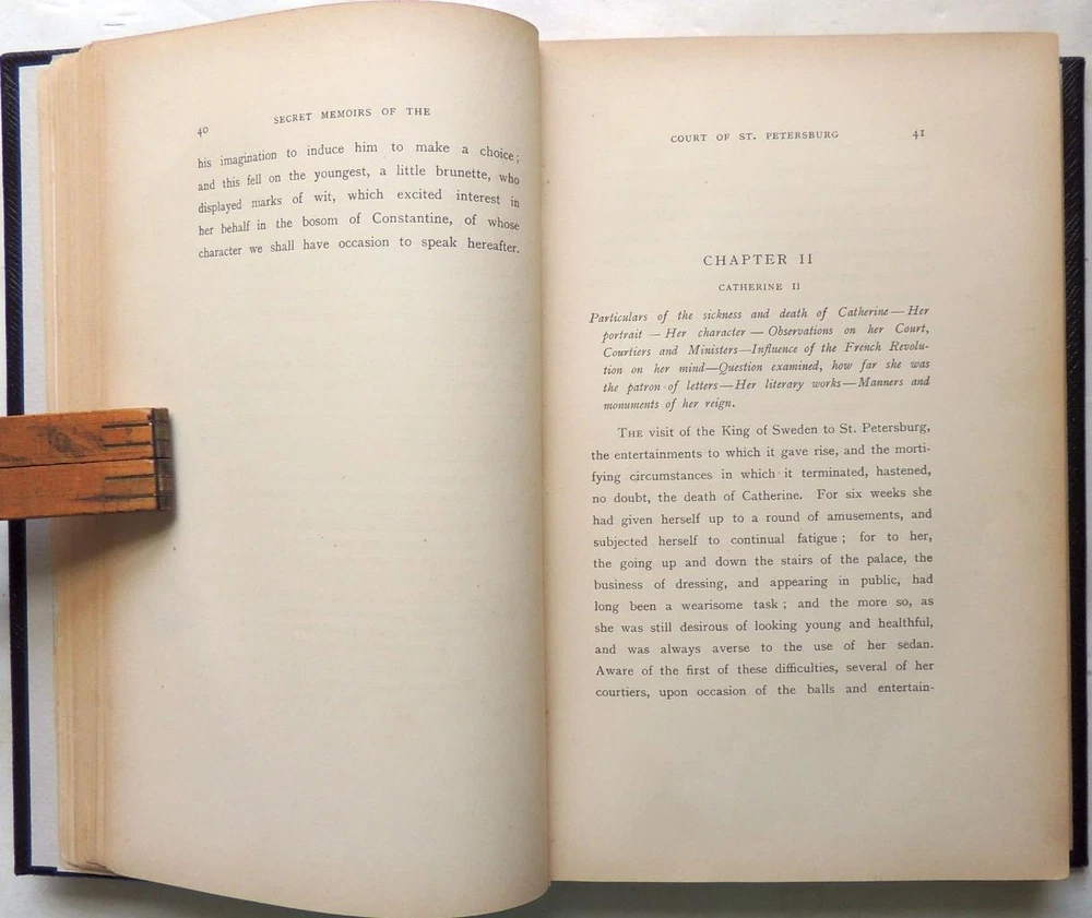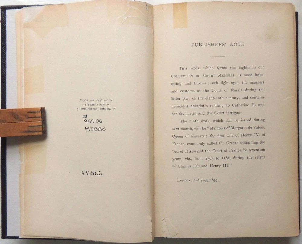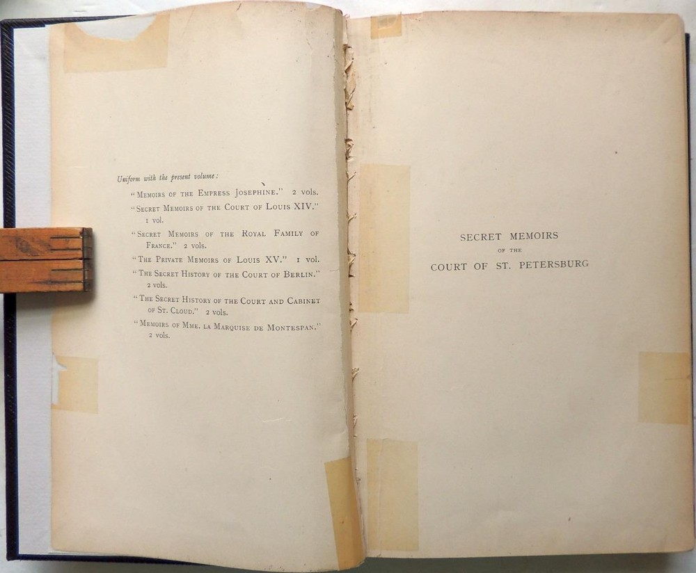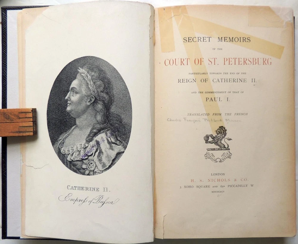 Secret Memoirs of the Court of St. Petersburg Particularly Towards the End of the Reign of Catherine II and the Commencement of That of Paul I Translated from the French LONDON: H. S. NICHOLS & CO. 1895. 1st Edition. Limited to 500 copies. 6 x 8 ¾ inches. Full leather. Raised bands; tooling. Xvi, 1-390, [2] pp. Frontispiece. Appendix. Ex-library beautifully rebound in full leather. Limited to 500 copies. Edge chipping/tape repairs; occasional corner chipping. Still very nice attractive. Absolutely beautiful binding. Secret Memoirs of the Court of St. Petersburg Particularly Towards the End of the Reign of Catherine II and the Commencement of That of Paul I Translated from the French LONDON: H. S. NICHOLS & CO. 1895. 1 st Edition. Limited to 500 copies. 6 x 8 ¾ inches. Full leather. Raised bands; tooling. Xvi, 1-390, [2] pp. Frontispiece. Appendix. Ex-library beautifully rebound in full leather. Limited to 500 copies. Edge chipping/tape repairs; occasional corner chipping. Still very nice attractive. Absolutely beautiful binding. Images sell! Get Supersized Images & Free Image Hosting Attention Sellers - Get Templates Image Hosting, Scheduling at Auctiva.com. Track Page Views With Auctiva's Counter
