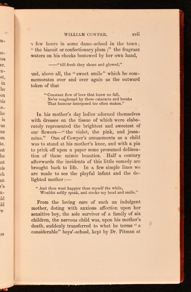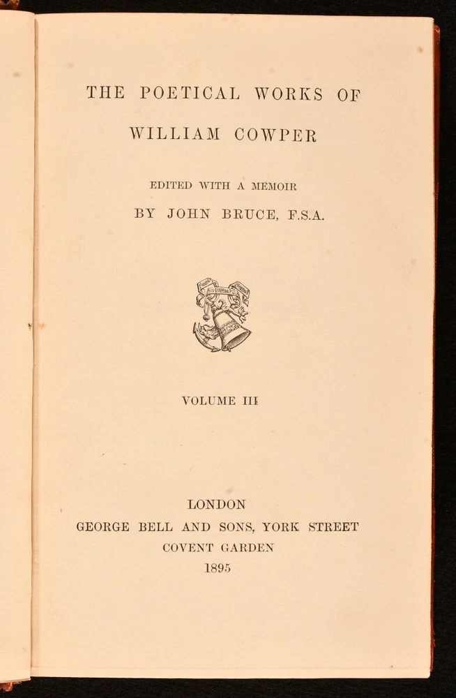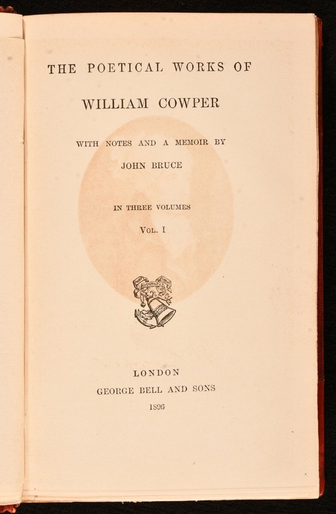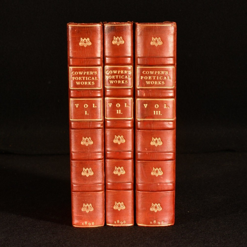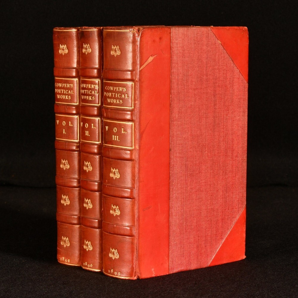 Click here to see our other books! The Poetical Works of William Cowper William Cowper; John Bruce 1895-96 George Bell & Sons : London 7" by 4.5" clxxx, 267; 366; xiii, 426pp. SUMMARY A smart complete set of the poetical works of William Cowper, with a memoir of the author from John Bruce. Leather Binding Overall Condition: Very Good This book weighs 1.5 KG when packed UK Postage: £ 3.99 US Postage: £ 23.99 EU Postage : £ 18.99 European Postage: £ 19.99 Asia Postage: £ 31.99 Worldwide Postage: £ 32.99 DESCRIPTION Complete in three volumes. Reprinted from stereotype plates. With portrait frontispiece to volume one. A collection of the poetical works of Anglican hymnwriter and poet, William Cowper, considered one of the most popular poets of his time. Cowper is considered to have developed early Romantic poetry by writing about everyday life and scenes of the English countryside. With notes and a memoir of the author by John Bruce, a British scholar. Previously held in the library of Sir Malcolm Donald MacEacharn, a British-born Australian shipping magnate in the early twentieth century. He was appointed the Mayor of Melbourne from 1897 to 1900 and successfully stood for the Division of Melbourne at the inaugural federal election, held in 1901. CONDITION Bound in half red calf with red cloth boards. Externally, smart with light shelf wear and rubbing to the extremities. Fading to the spine and the odd mark to the board. Internally, firmly bound. Pages are very bright and clean with the odd spot. Previous owner's bookplate to the front pastedown. Overall Condition: Very Good GLOSSARY OF TERMS Overall Condition (Dustwrapper condition rating is shown after that for the book itself, where a dustwrapper is present) Fine - Very well preserved copy showing very little wear Very Good Indeed - Only one or two minor faults, really a very attractive copy Very Good - Quite a wide term meaning no major faults but probably several smaller ones often expected given the age of the book, but still a respectable copy Good - Meaning not very good. Some more serious faults as will be described in the condition report under 'condition' Good Only - Meaning one or more faults that could really do with repair Fair - As with good only above but with other faults leaving a compromised copy even after repair Poor - Really bad and possibly seriously incomplete. We only sell books in this condition where their rarity or value makes them attractive none the less. Major defects will be described. GUARANTEE We offer a full money back guarantee on our descriptions. Please ask for details and conditions. We prefer PAYPAL. If you pay via PAYPAL we will post the item off the same or the next working day with the postage you have selected. Please note we cannot accept USD cheques