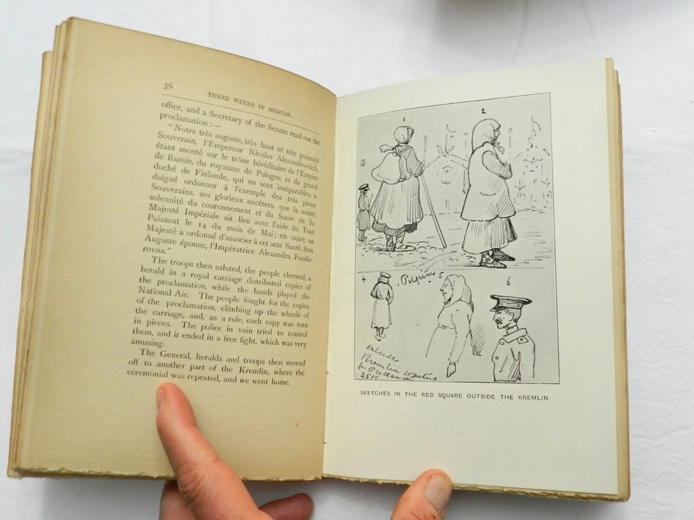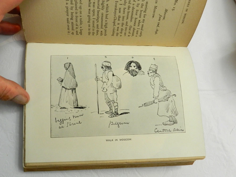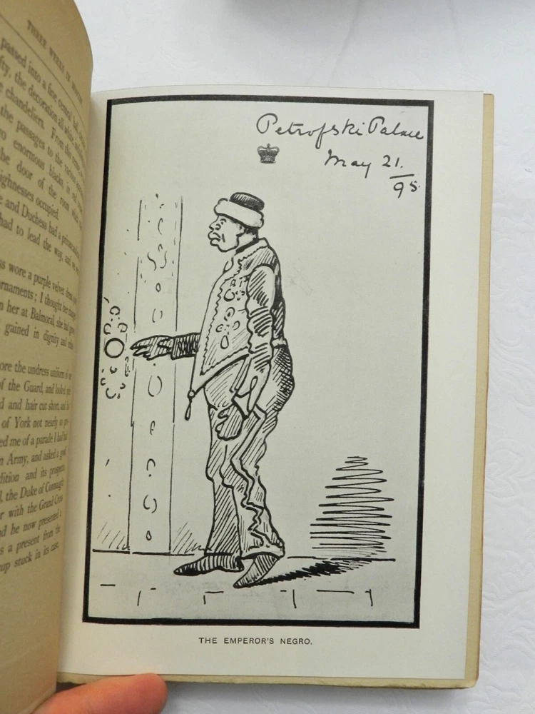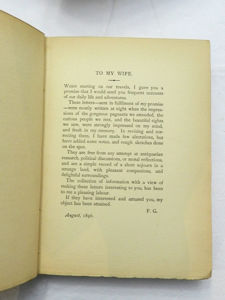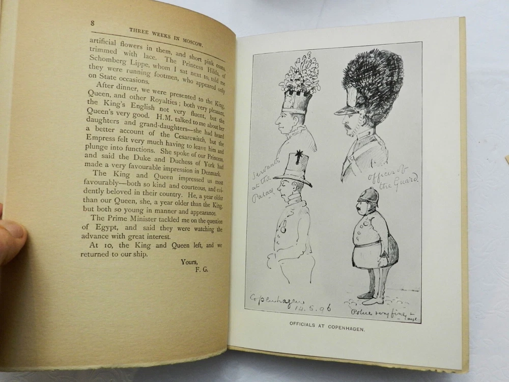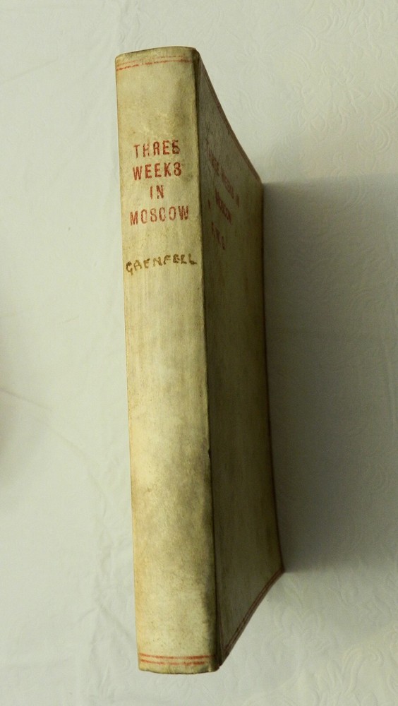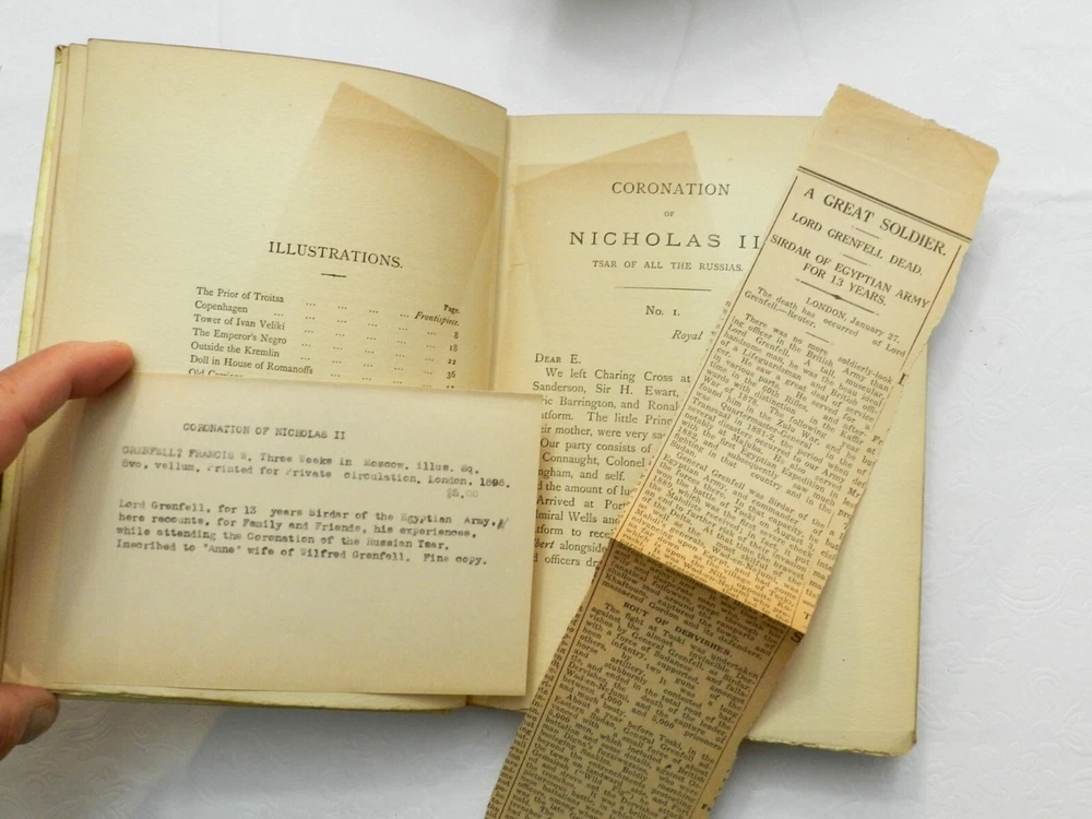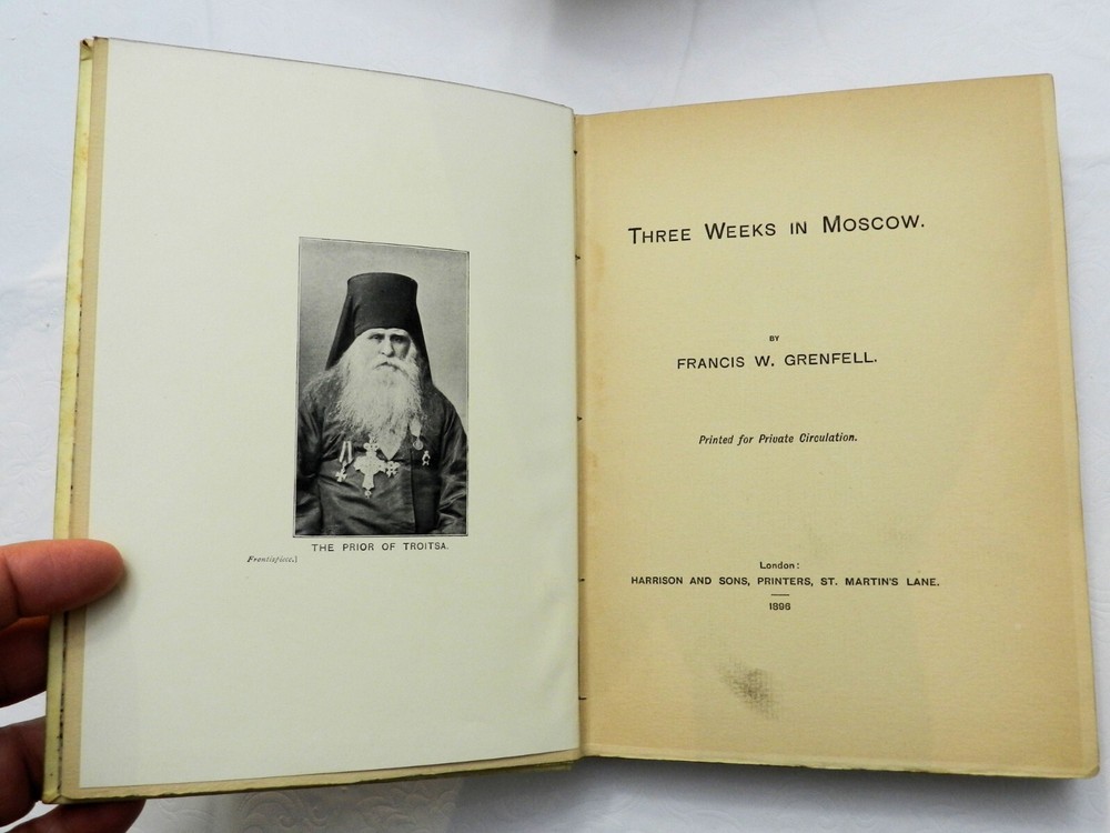 ULTRA RARE AND VERY INTERESTING, AND NICELY INSCRIBED BY THE AUTHOR FRANCIS W. GRENFELL TO HIS COUSIN ANNE E. GRENFELL, WHOSE BOOKPLATE ADORNS THE BOOK!! Privately published by the author in what I presume was a limited copy. There are no other copies available for sale online. 8vo. 152pp + 11 B&w plates. Vellum-covered boards with faded red titles. The boards show light edge and corner wear, have light soiling, and are slightly bowed outward. The book will be stored pressed against stiff cardboard using shrink wrap. Beautiful marble endpapers with, as noted, there is an attractive bookplate of Wilfred T. Grenfell and Anne E. Grenfell, and a second bookplate of the previous owner, a Gordon W. Thomas, M.D. Frontis plate is photograph of the Prior of Troitsa, subsequent plates are line drawings by the author (all present). Binding is very solid, pages are clean, with one small exception. There is a newspaper article on the death of the Grenfell, and a second piece of ephemera, found near the beginning of the book. It left a small stain - see listing photo. Both items are conveyed with the book. This is an account in letters to his wife of a voyage to Russia with the Duke and Duchess of Connaught and other military dignitaries and their entourage for the coronation of Tsar Nicholas II, including Grenfell's secondhand account of the Khodynka Tragedy. On the author from Wikipedia: "Field Marshal Francis Wallace Grenfell, 1st Baron Grenfell, GCB, GCMG, PC (Ire) (29 April 1841 – 27 January 1925) was a British Army officer. After serving as aide-de-camp to the Commander-in-Chief, South Africa, he fought in the 9th Xhosa War, the Anglo-Zulu War and then the Anglo-Egyptian War. He went on to become Sirdar (Commander-in-Chief) of the Egyptian Army and commanded the forces at the Battle of Suakin in December 1888 and at the Battle of Toski in August 1889 during the Mahdist War. After that he became Governor of Malta and then Commander-in-Chief, Ireland before retiring in 1908." The autograph has not been authenticated, but a few can be found online. One is available for sale on Abebooks as a cut autograph from a letter - it is shown in the last listing photo. As seen, the autographs and handwriting are very consistent. B130