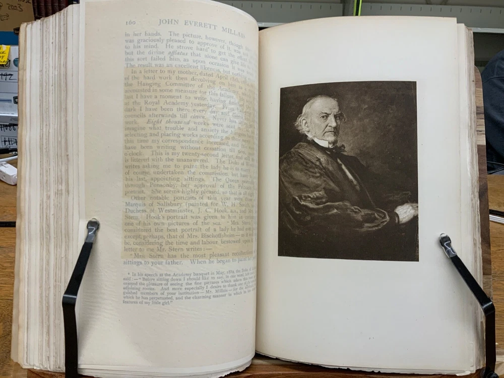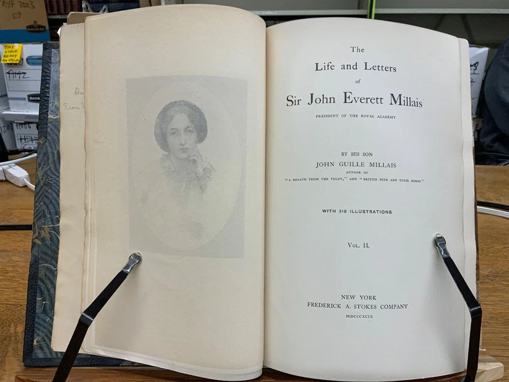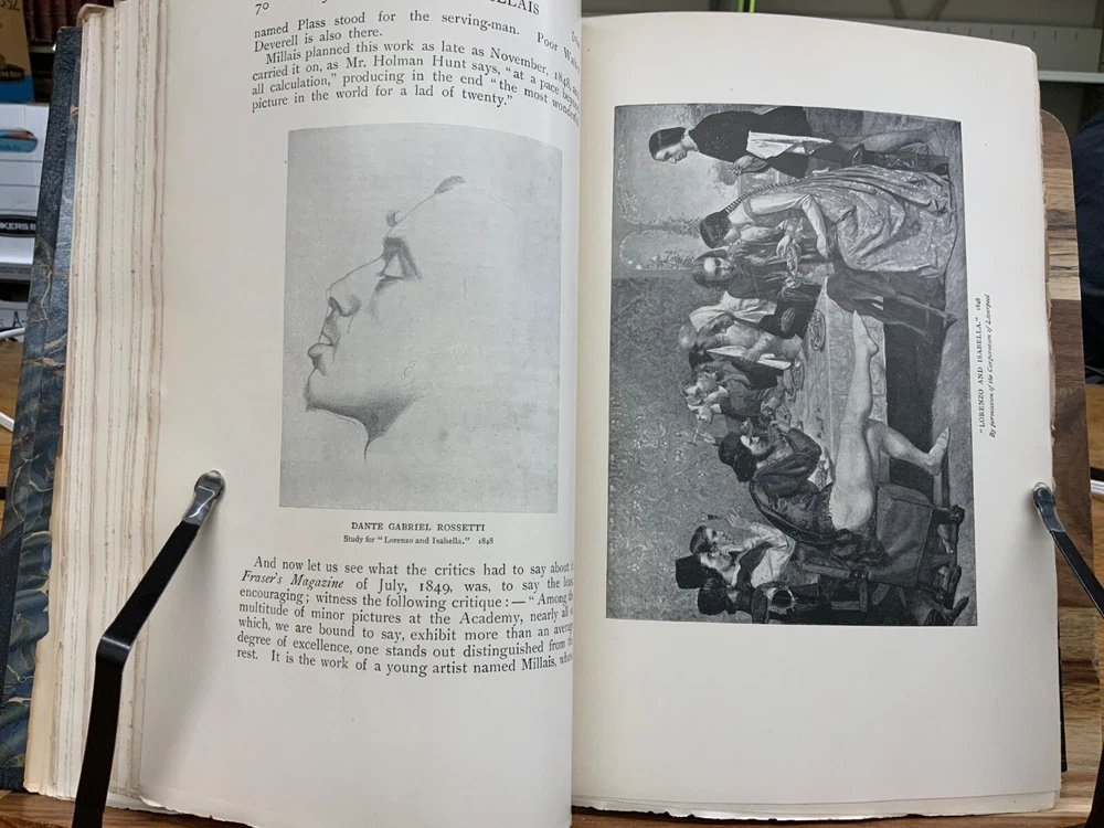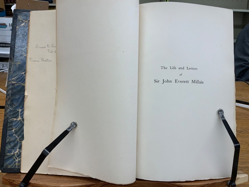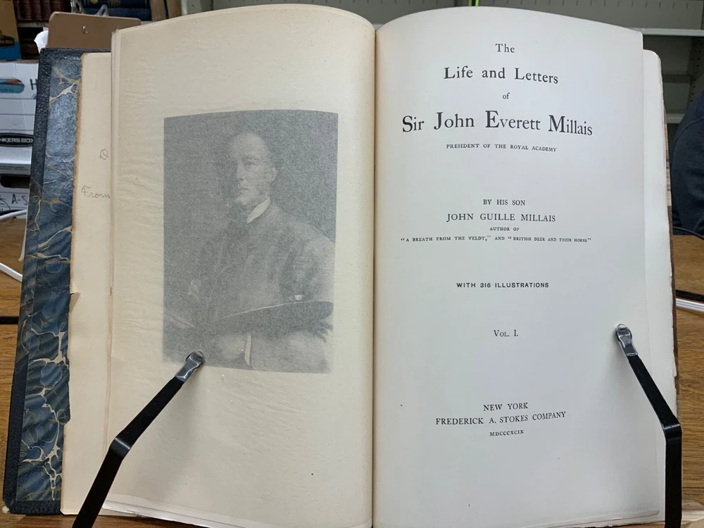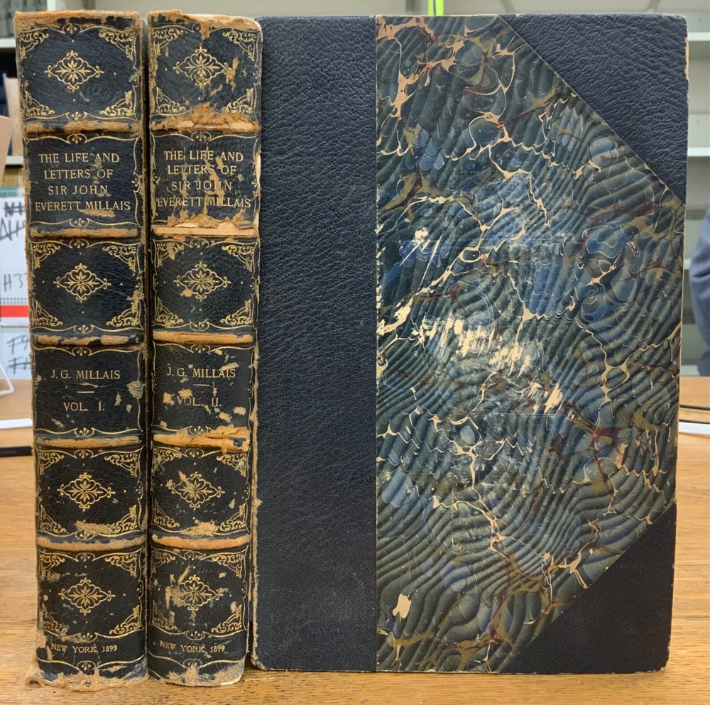 The Life and Letters of Sir John Everett Millais. President of the Royal Academy. By his son, John Guille Millais. New York: Frederick A. Stokes Company, 1899. First Edition. Vol. I: 446 p. Vol. II: 510 p. Half-leather marbled binding 10.25 x 7.5", large 8vos. In fair condition. Both boards of Vol. I detached, front board of Vol. II detached. Boards are scuffed at edges and worn at leather corners. Rear hinge of Vol. II rubbed; raised bands rubbed. Heads and tail of spines scuffed with light chipping. Top edges gilt; fore and bottom edges deckled. Gilt deco and lettering overall bright and clean. Previous ownership bookplates found on front paste-downs: "From Among the Books of David Dargler." Normal toning throughout text-blocks, mostly at edges of leaves. Tissue guards exhibit light off-setting from plates. Boards need repair (i.e. reattached). Please see photos. Sir John Everett Millais, 1st Baronet (1829 – 1896) was an English painter and illustrator who was one of the founders of the Pre-Raphaelite Brotherhood. He was a child prodigy who, aged eleven, became the youngest student to enter the Royal Academy Schools. The Pre-Raphaelite Brotherhood was founded at his family home in London, at 83 Gower Street (now number 7). Millais became the most famous exponent of the style, his painting Christ in the House of His Parents (1849–50) generating considerable controversy, and he produced a picture that could serve as the embodiment of the historical and naturalist focus of the group, Ophelia , in 1851–52. RAREA1899CKLA - 11/18 FORN-TUB-0065-BB-2502-HKREV455