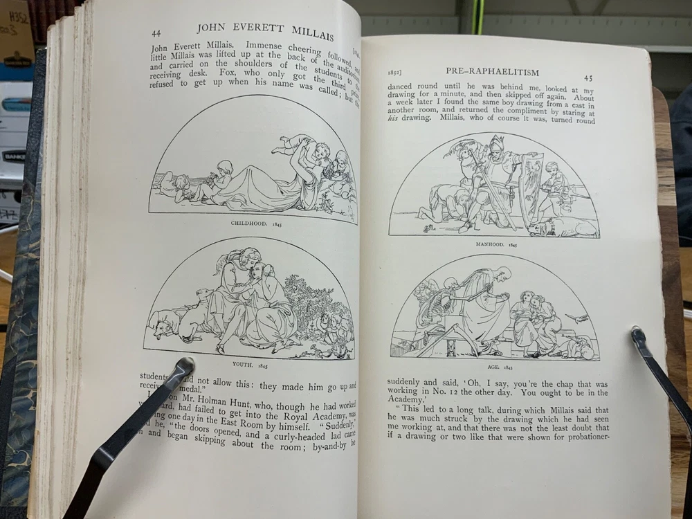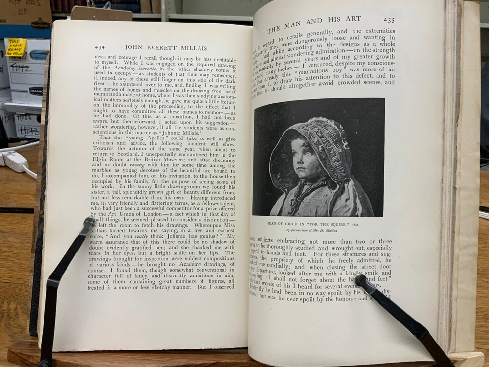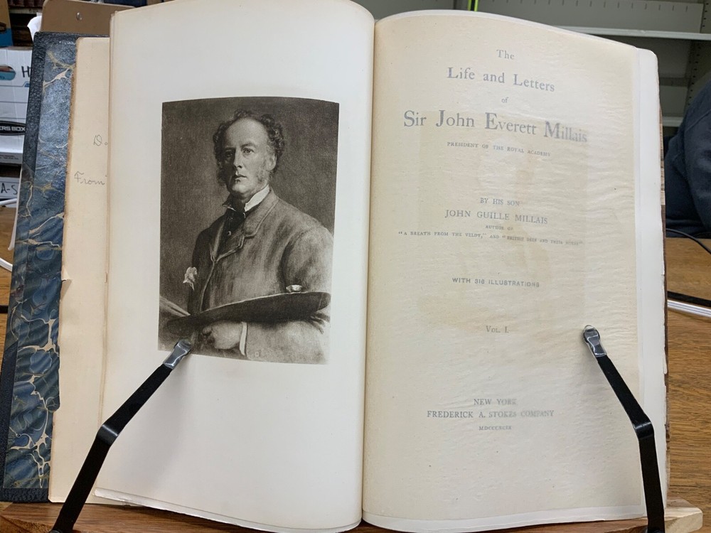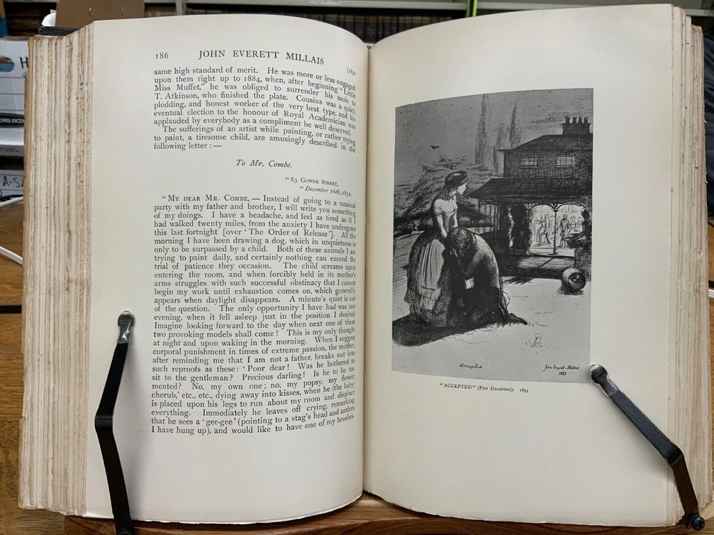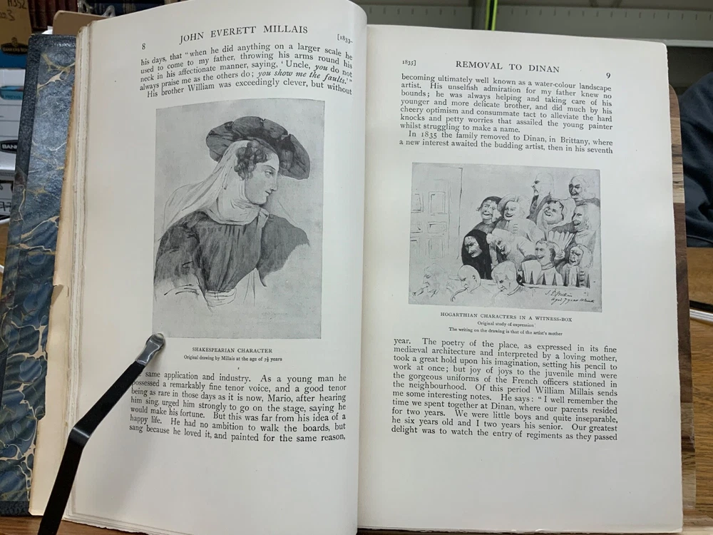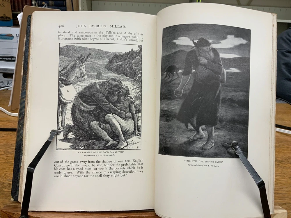 The Life and Letters of Sir John Everett Millais. President of the Royal Academy. By his son, John Guille Millais. New York: Frederick A. Stokes Company, 1899. First Edition. Vol. I: 446 p. Vol. II: 510 p. Half-leather marbled binding 10.25 x 7.5", large 8vos. In fair condition. Both boards of Vol. I detached, front board of Vol. II detached. Boards are scuffed at edges and worn at leather corners. Rear hinge of Vol. II rubbed; raised bands rubbed. Heads and tail of spines scuffed with light chipping. Top edges gilt; fore and bottom edges deckled. Gilt deco and lettering overall bright and clean. Previous ownership bookplates found on front paste-downs: "From Among the Books of David Dargler." Normal toning throughout text-blocks, mostly at edges of leaves. Tissue guards exhibit light off-setting from plates. Boards need repair (i.e. reattached). Please see photos. Sir John Everett Millais, 1st Baronet (1829 – 1896) was an English painter and illustrator who was one of the founders of the Pre-Raphaelite Brotherhood. He was a child prodigy who, aged eleven, became the youngest student to enter the Royal Academy Schools. The Pre-Raphaelite Brotherhood was founded at his family home in London, at 83 Gower Street (now number 7). Millais became the most famous exponent of the style, his painting Christ in the House of His Parents (1849–50) generating considerable controversy, and he produced a picture that could serve as the embodiment of the historical and naturalist focus of the group, Ophelia , in 1851–52. RAREA1899CKLA - 11/18 FORN-TUB-0065-BB-2502-HKREV455