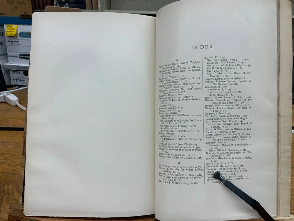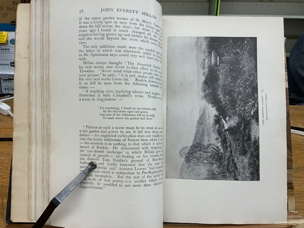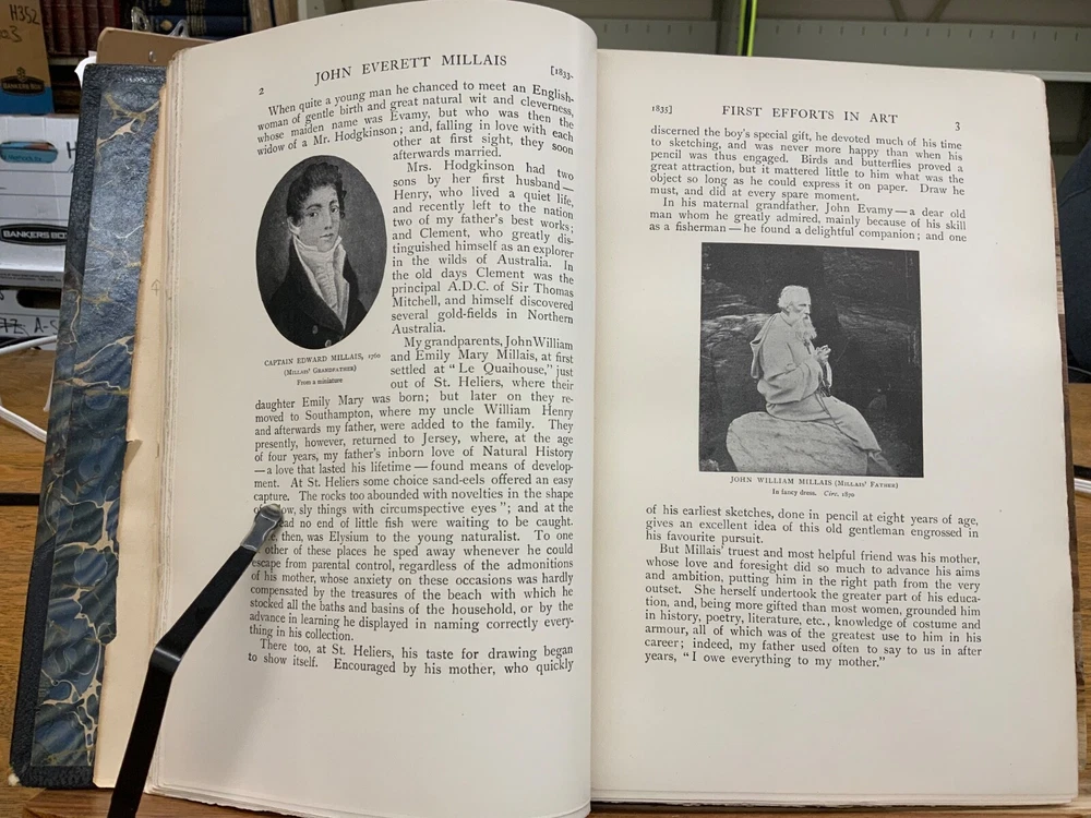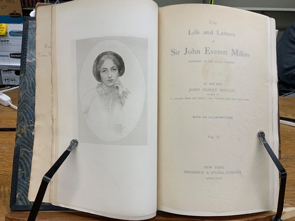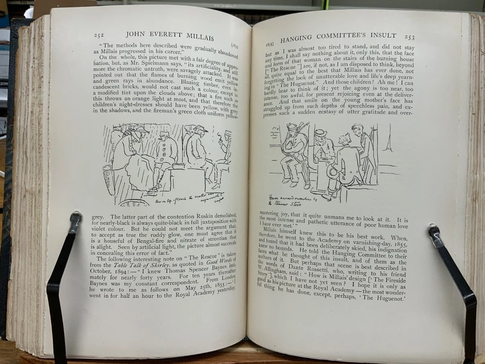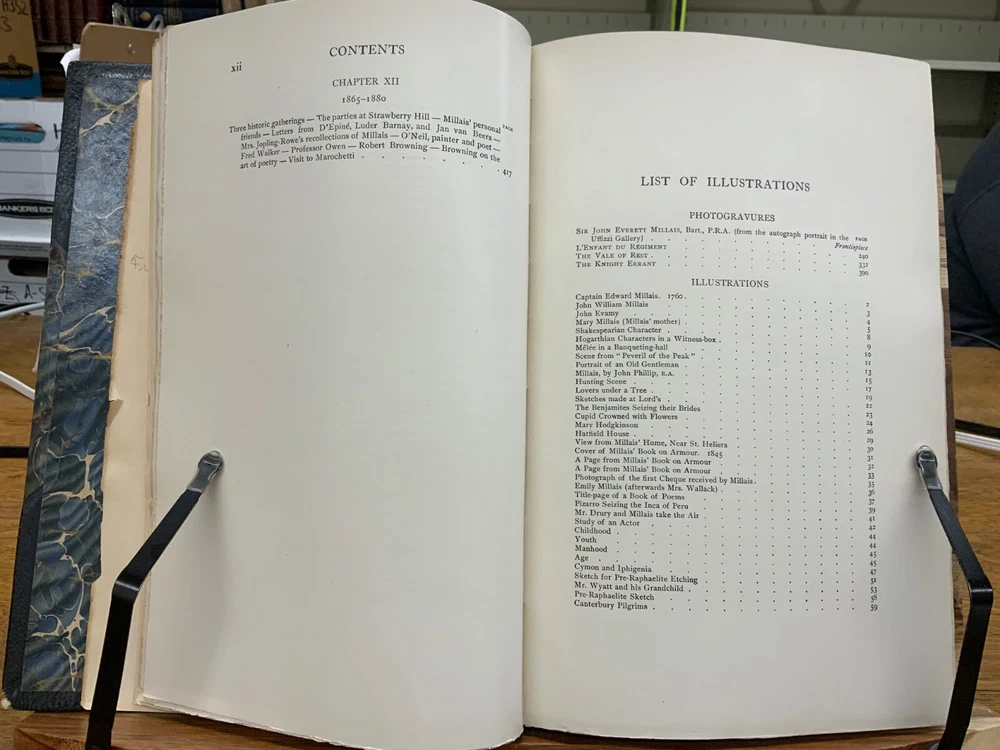 The Life and Letters of Sir John Everett Millais. President of the Royal Academy. By his son, John Guille Millais. New York: Frederick A. Stokes Company, 1899. First Edition. Vol. I: 446 p. Vol. II: 510 p. Half-leather marbled binding 10.25 x 7.5", large 8vos. In fair condition. Both boards of Vol. I detached, front board of Vol. II detached. Boards are scuffed at edges and worn at leather corners. Rear hinge of Vol. II rubbed; raised bands rubbed. Heads and tail of spines scuffed with light chipping. Top edges gilt; fore and bottom edges deckled. Gilt deco and lettering overall bright and clean. Previous ownership bookplates found on front paste-downs: "From Among the Books of David Dargler." Normal toning throughout text-blocks, mostly at edges of leaves. Tissue guards exhibit light off-setting from plates. Boards need repair (i.e. reattached). Please see photos. Sir John Everett Millais, 1st Baronet (1829 – 1896) was an English painter and illustrator who was one of the founders of the Pre-Raphaelite Brotherhood. He was a child prodigy who, aged eleven, became the youngest student to enter the Royal Academy Schools. The Pre-Raphaelite Brotherhood was founded at his family home in London, at 83 Gower Street (now number 7). Millais became the most famous exponent of the style, his painting Christ in the House of His Parents (1849–50) generating considerable controversy, and he produced a picture that could serve as the embodiment of the historical and naturalist focus of the group, Ophelia , in 1851–52. RAREA1899CKLA - 11/18 FORN-TUB-0065-BB-2502-HKREV455