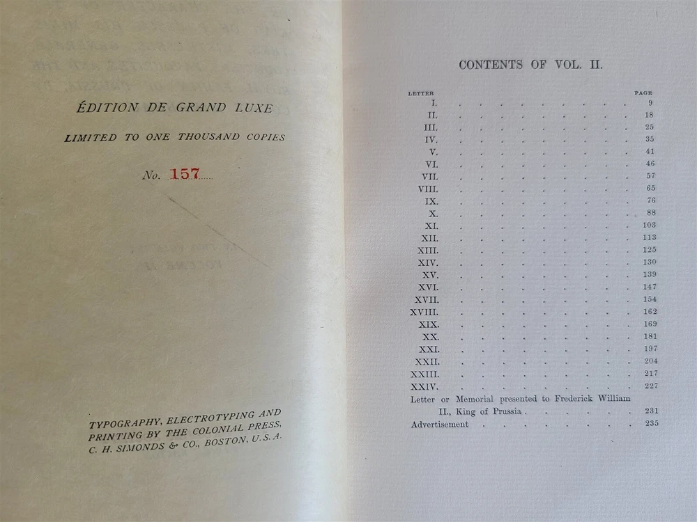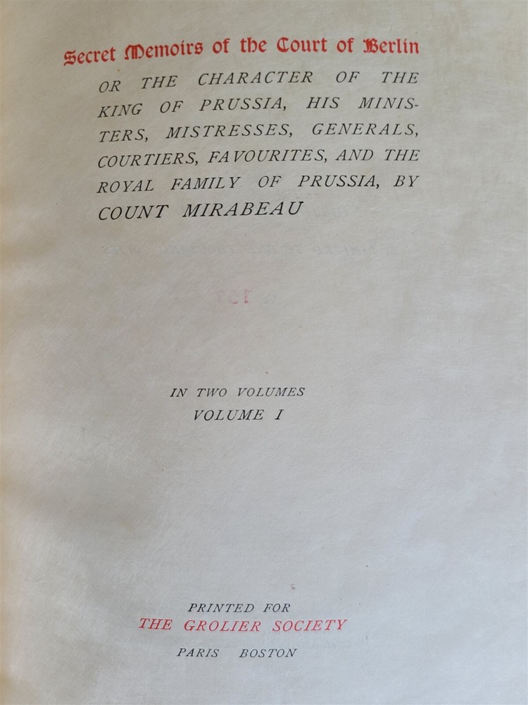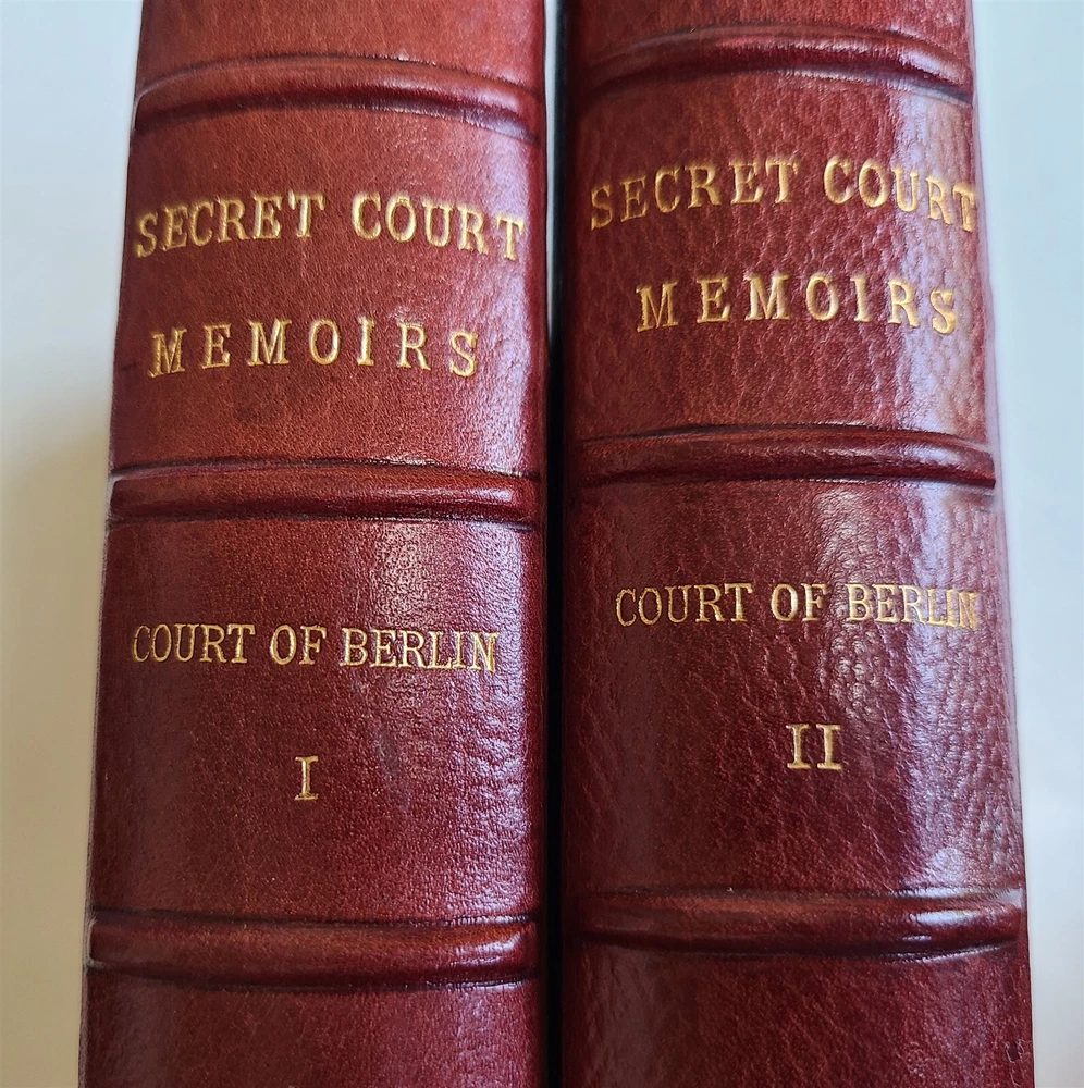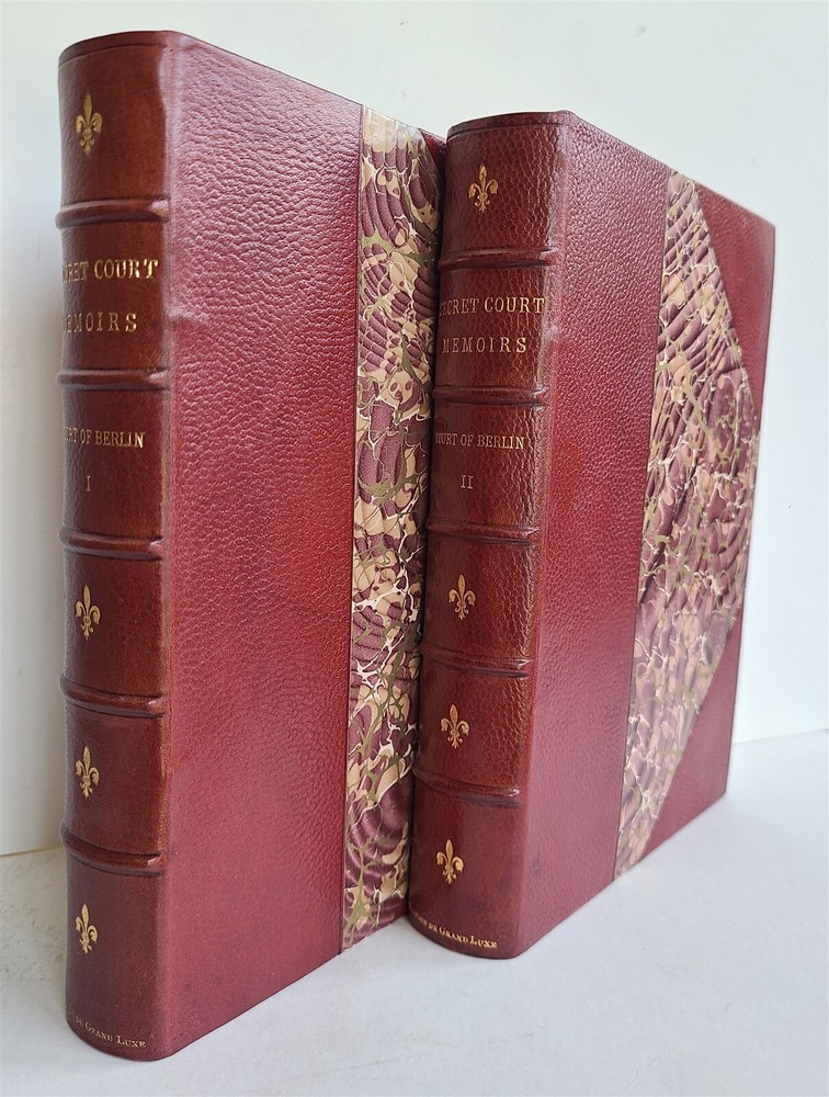 SECRET MEMOIRS of COURT of BERLIN 2 volumes GROLIER SOCIETY, Not dated (c. 1900) EDITION DE GRAND LUXE LIMITED TO 1000 COPIES No. 157 Size 6 3/4 by 9 1/4" 3/4 red morocco over marbled boards Gilt upper edge, uncut other edges Illustrated Excellent condition Text in English Refund Policy: We will issue a FULL REFUND, 100% money back if you are not satisfied with your purchase. Items must be returned to us within 20 days in order to receive a refund or replacement. Buyer is responsible for the shipping costs. Powered by SixBit's eCommerce Solution