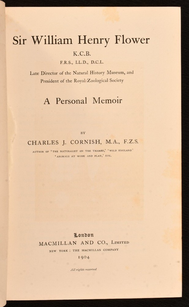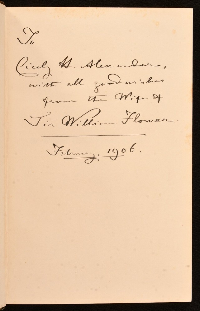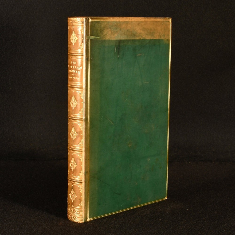 Click here to see our other books! Sir William Henry Flower: A Personal Memoir Charles J. Cornish 1904 Macmillan and Co., Limited : London 9" by 6" xi, 274pp. SUMMARY A smartly bound first edition of this memoir of English surgeon Sir William Henry Flower, signed and inscribed by his wife. First Edition,Illustrated,Leather Binding,Original Binding,Publishers' Original Binding,Signed Overall Condition: Very Good This book weighs 0.75 KG when packed UK Postage: £ 3.99 US Postage: £ 19.99 EU Postage : £ 15.99 European Postage: £ 16.99 Asia Postage: £ 21.99 Worldwide Postage: £ 25.99 DESCRIPTION First edition. Signed by Georgiana Rosetta Smyth, the wife of Sir William Henry Flower who in later life modelled herself closely on Queen Victoria due to their similar size and matriarchal tendencies. With an inscription dated February 1906. Illustrated with a portrait frontispiece and four plates. Collated complete. The personal memoirs of Sir William Henry Flower, an English surgeon, museum curator and comparative anatomist, who became a leading authority on mammals and especially on the primate brain. He went on to become Director of the Natural History Museum in London. Written by Charles John Cornish, an English naturalist and writer. CONDITION Bound in full green calf. Externally, smart with light wear to the extremities and fading to the spine. Light fading to the top of the front board with the odd small mark to the boards. Internally, firmly bound. Pages are very bright with the odd spot or handling mark. Light spotting to the endpapers with minor residue from a bookplate removed from the front pastedown. Overall Condition: Very Good GLOSSARY OF TERMS Overall Condition (Dustwrapper condition rating is shown after that for the book itself, where a dustwrapper is present) Fine - Very well preserved copy showing very little wear Very Good Indeed - Only one or two minor faults, really a very attractive copy Very Good - Quite a wide term meaning no major faults but probably several smaller ones often expected given the age of the book, but still a respectable copy Good - Meaning not very good. Some more serious faults as will be described in the condition report under 'condition' Good Only - Meaning one or more faults that could really do with repair Fair - As with good only above but with other faults leaving a compromised copy even after repair Poor - Really bad and possibly seriously incomplete. We only sell books in this condition where their rarity or value makes them attractive none the less. Major defects will be described. GUARANTEE We offer a full money back guarantee on our descriptions. Please ask for details and conditions. We prefer PAYPAL. If you pay via PAYPAL we will post the item off the same or the next working day with the postage you have selected. Please note we cannot accept USD cheques