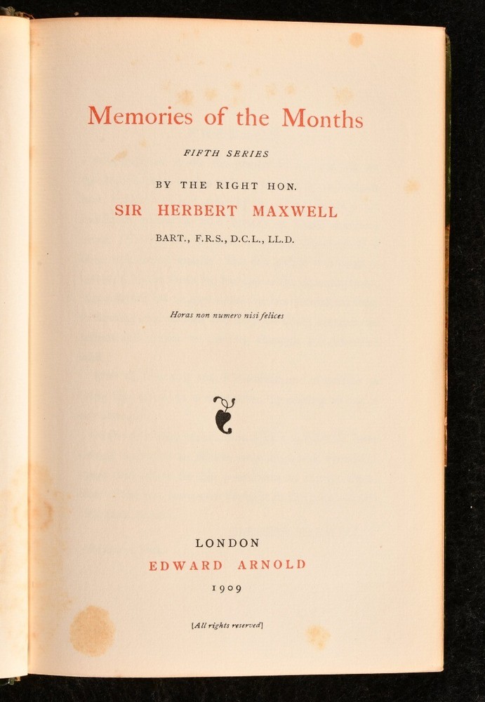Click here to see our other books! Memories of the Months Sir Herbert Maxwell 1909-1910 Edward Arnold : London 8" by 5" SUMMARY A smartly bound collection of Sir Herbert Maxwell's memoirs. First Edition,Leather Binding Overall Condition: Very Good Indeed This book weighs 5 KG when packed UK Postage: £ 4.49 US Postage: £ 42.99 EU Postage : £ 27.99 European Postage: £ 45.99 Asia Postage: £ 74.99 Worldwide Postage: £ 129.99 DESCRIPTION Comprising the first five series of this work which was eventually seven series total. At the time of publication these five series were all published. With the bookplate of one Ethel Beatrice Edgar to the front pastedown of all volumes. The first volume is a seventh impression, second volume is a third impression, third volume is a second impression, fourth volume is a first edition and the fifth volume is also a first edition. With illustrated frontispieces to all volumes. Sir Herbert Maxwell was a conservative politician who was known for his novels, essays, art, and angling. He had many antiquarian interests and was the President of the Society of Antiquaries, Scotland. He led a fascinating life, some of which is documented in these memoirs. CONDITION In uniform half calf bindings, with paper covered boards. Externally, smart. Minor fading and several marks to the spines. Bookplate to the front pastedown of all volumes. Internally, all volumes are firmly bound. Pages are bright. Scattered spotting to the first and last few pages in addition to the occasional plate. Overall Condition: Very Good Indeed GLOSSARY OF TERMS Overall Condition (Dustwrapper condition rating is shown after that for the book itself, where a dustwrapper is present) Fine - Very well preserved copy showing very little wear Very Good Indeed - Only one or two minor faults, really a very attractive copy Very Good - Quite a wide term meaning no major faults but probably several smaller ones often expected given the age of the book, but still a respectable copy Good - Meaning not very good. Some more serious faults as will be described in the condition report under 'condition' Good Only - Meaning one or more faults that could really do with repair Fair - As with good only above but with other faults leaving a compromised copy even after repair Poor - Really bad and possibly seriously incomplete. We only sell books in this condition where their rarity or value makes them attractive none the less. Major defects will be described. GUARANTEE We offer a full money back guarantee on our descriptions. Please ask for details and conditions. We prefer PAYPAL. If you pay via PAYPAL we will post the item off the same or the next working day with the postage you have selected. Please note we cannot accept USD cheques