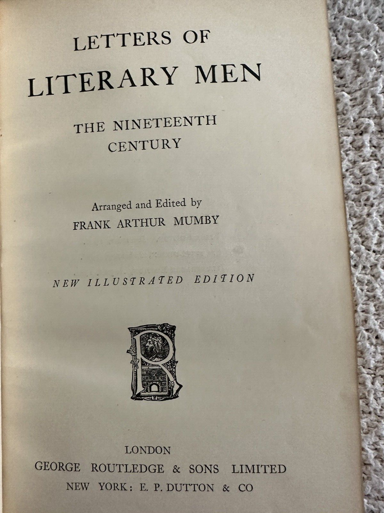 1911 Illustrated Edition Letters of Literary Men The Nineteenth Century Arranged & Edited by Frank Arthur Mumby Very good condition (see photos) Binding is tight (see photos) Brown Leather boards with gold gilt trim (see photo) Illustrations (see photos) Bookplate on paste down end paper (see photo) Marbled end papers (see photos) All block pages edges are gold No other writing pp. 632 Sir Thomas More to Robert Burns, Wadsworth, Tennyson, Keats, Scott, Bryan and Bronte as well as others. A beautiful addition to your library