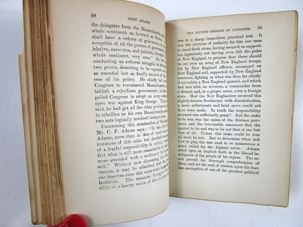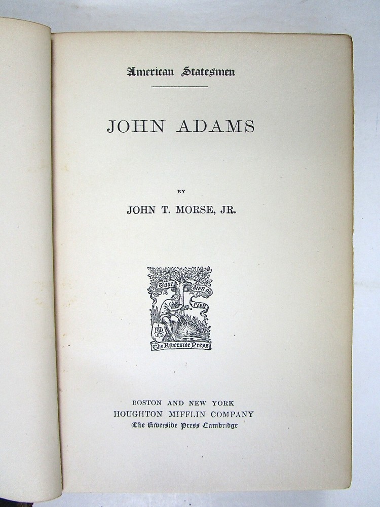 Book Description: John T[orrey] Morse, American Statesmen, John Adams. Boston and New York: Houghton, Mifflin—The Riverside Press, 1912, 337 indexed pages. Cover in full leather with one portion of marbleized leather. Index banded. Front cover detached, owner’s label on inside front cover, and small portion of front endpaper torn. Otherwise in very good condition with tight binding and clean pages. A beautiful copy of this standard biography of one of the early Presidents.