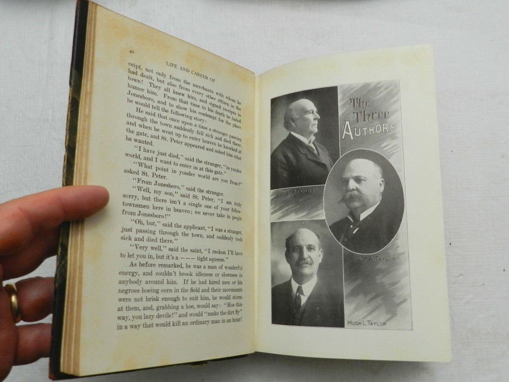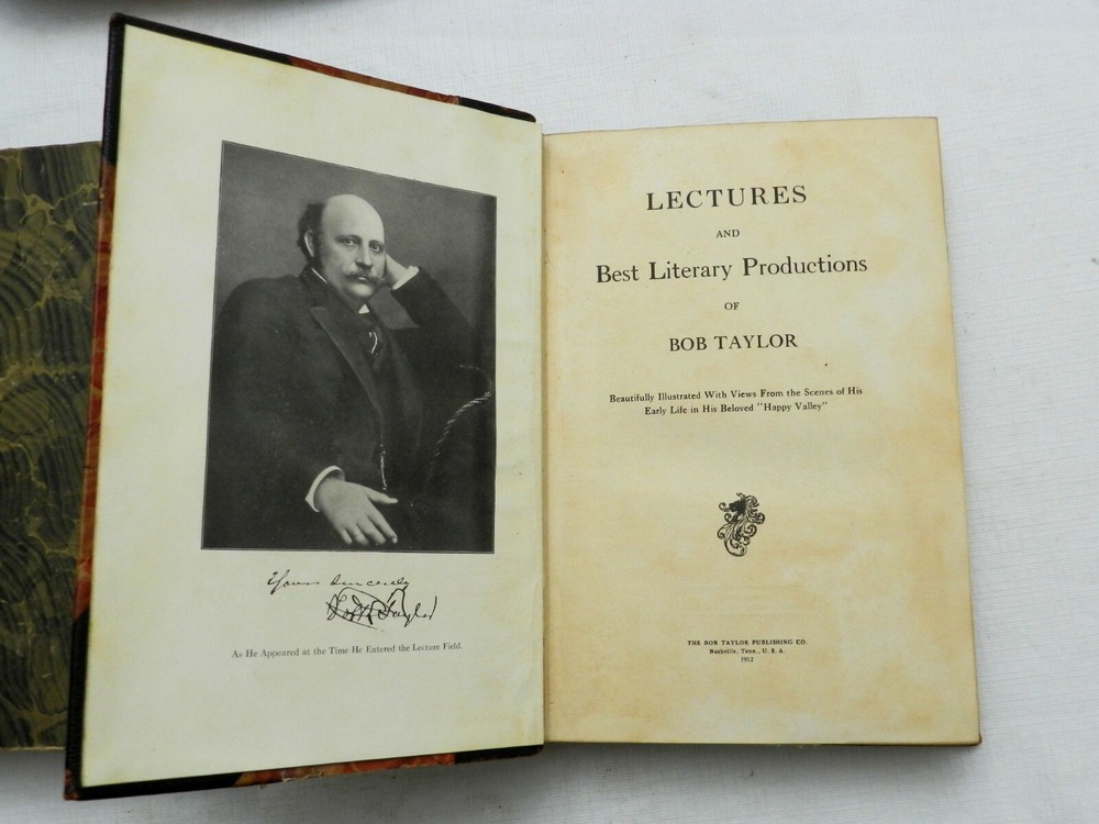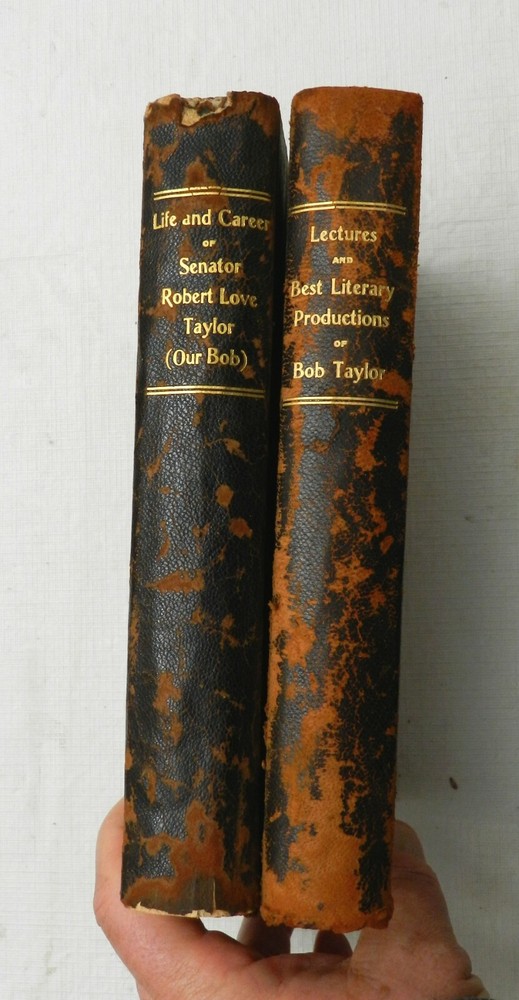 Both books are FIRST EDITIONS published by The Bob Taylor Publishing Company. Both are described similarly: 3/4 Leather with notable wear to leather on the spines although gilt letterings still show through, moderate corner wear, light edge wear. Very solidly bound, plain white endpapers, no interior marks or bookplates, MANY B&W PLATES. The two books are: 1912, Lectures and Best Literary Productions of Bob Taylor. Beautifully Illustrated With Views From the Scenes of His Early Life in His Beloved "Happy Valley". No author identified. 354 pages including 10 plates (including frontispiece). 1913, Life and Career of Senator Robert Love Taylor (Our Bob) by His Three Surviving Brothers James P. Taylor, Alf A. Taylor, and Hugh L. Taylor. Illustrated With Many Interesting Pictures of the Great Orator, From the Age of Fifteen to the Age of Sixty Years, Also With Views of "Happy Valley," Made Famous by his Lectures and Speeches. 370 pages, about 10 plates as well - a List of Illustrations not in Table of Contents. On this politician from Wikipedia: "Robert Taylor (April 29, 1763 – July 3, 1845) was a nineteenth-century politician and lawyer from Virginia. Born in Orange Court House, Virginia, Taylor completed preparatory studies, studied law and was admitted to the bar 1783, commencing practice in Orange Court House. He held several local offices before serving in the Virginia Senate from 1804 to 1815 also serving as president pro tempore from 1812-1814. In 1824, Taylor was elected an Adams Republican to the United States House of Representatives, serving from 1825 to 1827 and not running for reelection. Afterwards, Taylor devoted his attention to the management of his plantation and his legal practice. Taylor drafted the will of former President James Madison (a relative), whom he persuaded not to emancipate slaves, but leave instructions and allow Dolley Madison to do so in her will (which she failed to do)." SLL