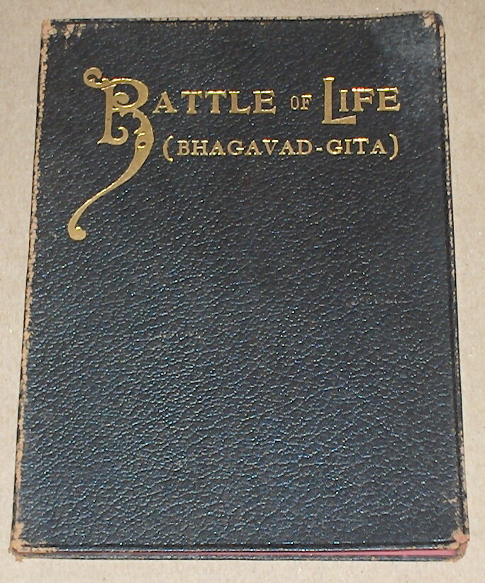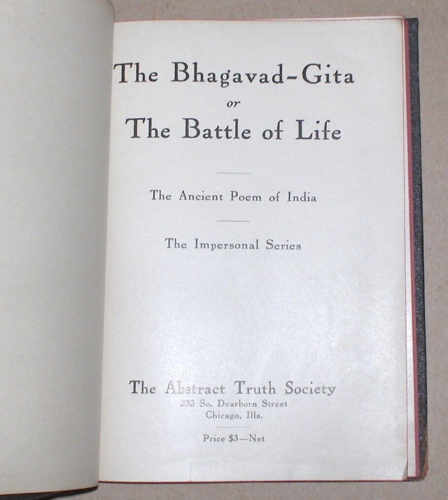 1918 The Abstract Truth Society "Battle of Life (Bhagavad-Gita)" Leather Bound Book. The cover of the book has the title as, "Battle of Life (Bhagavad-Gita)". The cover page has it listed as, "The Bhagavad-Gita or The Battle of Life." The Ancient Poem of India. In the introduction it states, "In the translation, the general scheme has been preserved, but many long names have been omitted, especially where they were obviously inserted in the first place only for the purpose of helping out the meter and supplying the desired length of syllable, verse and stanza. Also such mechanical contrivances as the remarks of Sanjaya have been found unnecessary." Leather bound book with 128 pages. Pages 115 - 128 are an introduction and sampling of their next book, "Love Supreme". The size is approx. 5" x 7". There is rubbing / wear to the leather at all edges, particularly at the corners and spine. The cover page, bottom center, has a small tear. The cover page also has a tiny corner fold at the bottom right side. No handwritten names or notes. Please see pictures. The Impersonal Series. 1918, The Abstract Truth Society. Chicago, Ills.