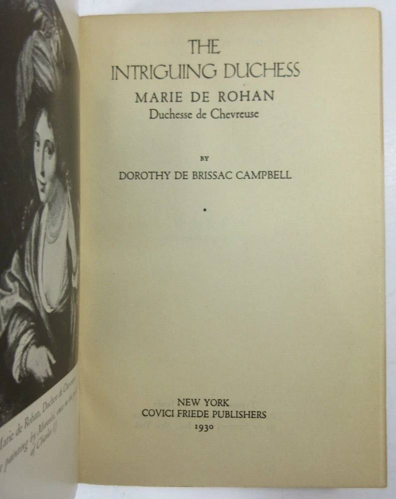 For sale is a Very Good+ condition, 1/2 leather-bound hardcover copy of The Intriguing Duchess: Marie De Rohan Duchess de Chevreuse by Dorothy De Brissac Campbell. 1st Edition, published in 1930 by Convici Friede Publishers. Book features 1/2 crimson leather fine binding, with gold foil decoration and lettering to banded spine. Binding is sound and pages are unmarked, with the exception of the previous owner's bookplate affixed to the inside front cover. Boards are clean and square, with light shelf wear around the edges. Please see photos for condition detail. shelf reference #L -1573