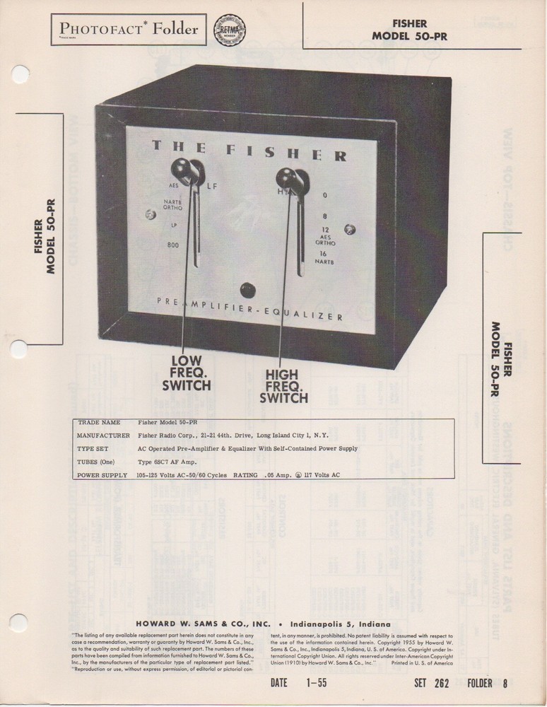 PRE-AMPLIFIER EQULIZER SERVICE MANUAL 1955 FISHER 50-PR This listing is for an original Photofact service folder that fits the make and model listed above. This item includes information such as alignment instructions, schematics, line drawings, exploded views of the interior, parts listings and more. This manual is 4 pages long. US customers receive FREE SHIPPING on all radio and TV service manuals. Outside the US? We mail up to FIVE manuals for the single manual shipping cost! If you are purchasing more than one item, PLEASE WAIT for a combined shipping invoice. If you are purchasing multiple items, PLEASE WAIT for a combined shipping invoice. _gsrx_vers_856 (GS 7.0.20 (856))