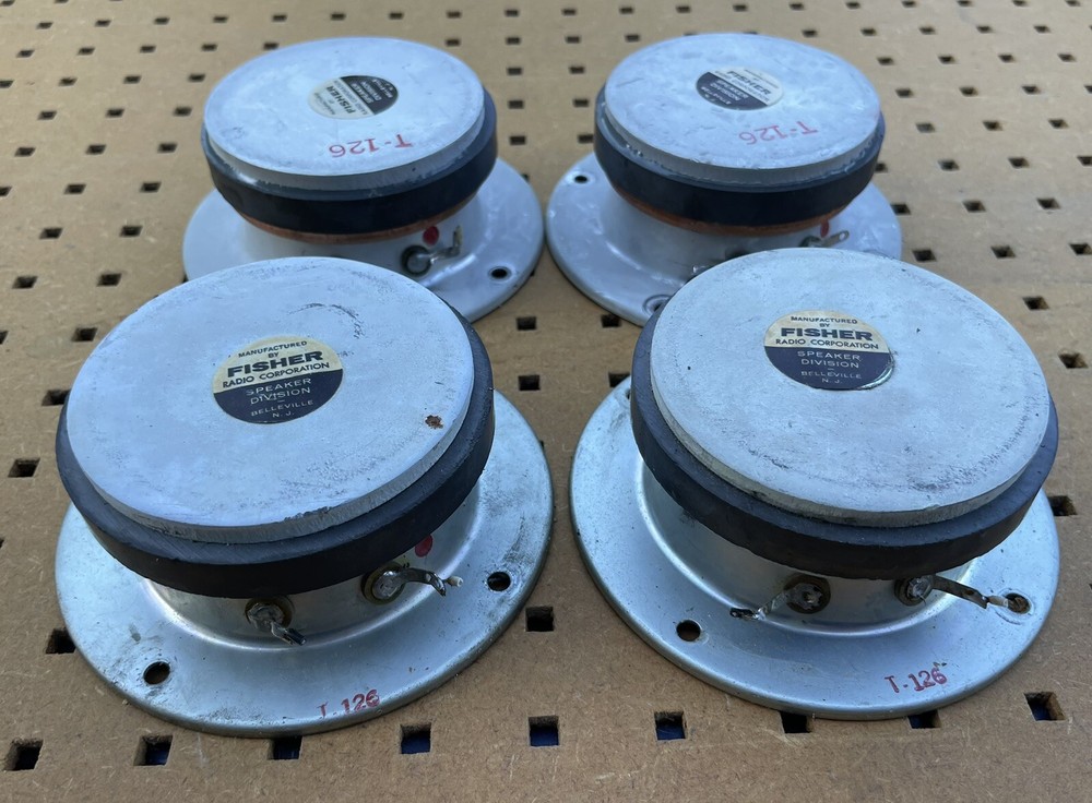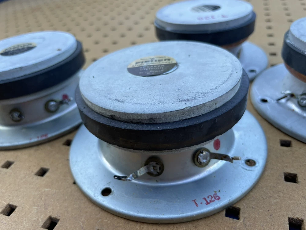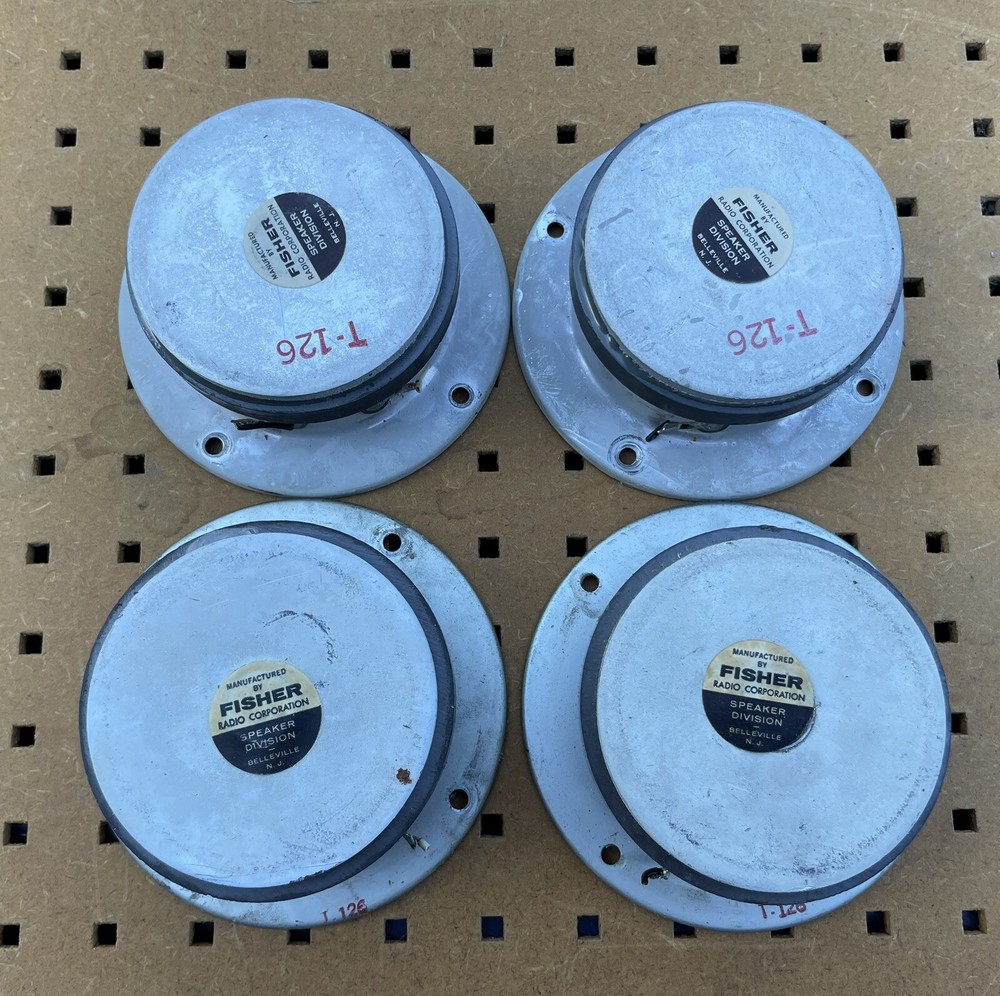 1964 THE FISHER 4.5” T-126 Tweeters Speakers KS-2 / Buy Only What You Need I've been selling on eBay since January 1999. My feedback speaks for itself with over 25 years of helping buyers fulfill their quest to find just the right item. Bid with total confidence. Product Description: These 4.5" tweeter drivers worked great within the sets of The Fisher KS-2 speakers. They have closely matching DCR readings of 7.9 / 8.0 / 8.1 / and 8.2. The condition is very good and performance is excellent and they are ready for your next audio project. These would work with a variety of vintage The Fisher speakers of the 1960's era. I'll pack securely to assure safe delivery! Shipping: I ship FedEx Ground and take great care in assuring your item arrives safe and sound. The shipping fee for this item is $10 mainland USA and includes full insurance. Guarantee : I offer a full refund if this item does not meet your expectations UPON initial receipt. I guarantee the item to be as described. Please contact me directly with any questions. Questions?: Feel free to call through eBay's message system.
