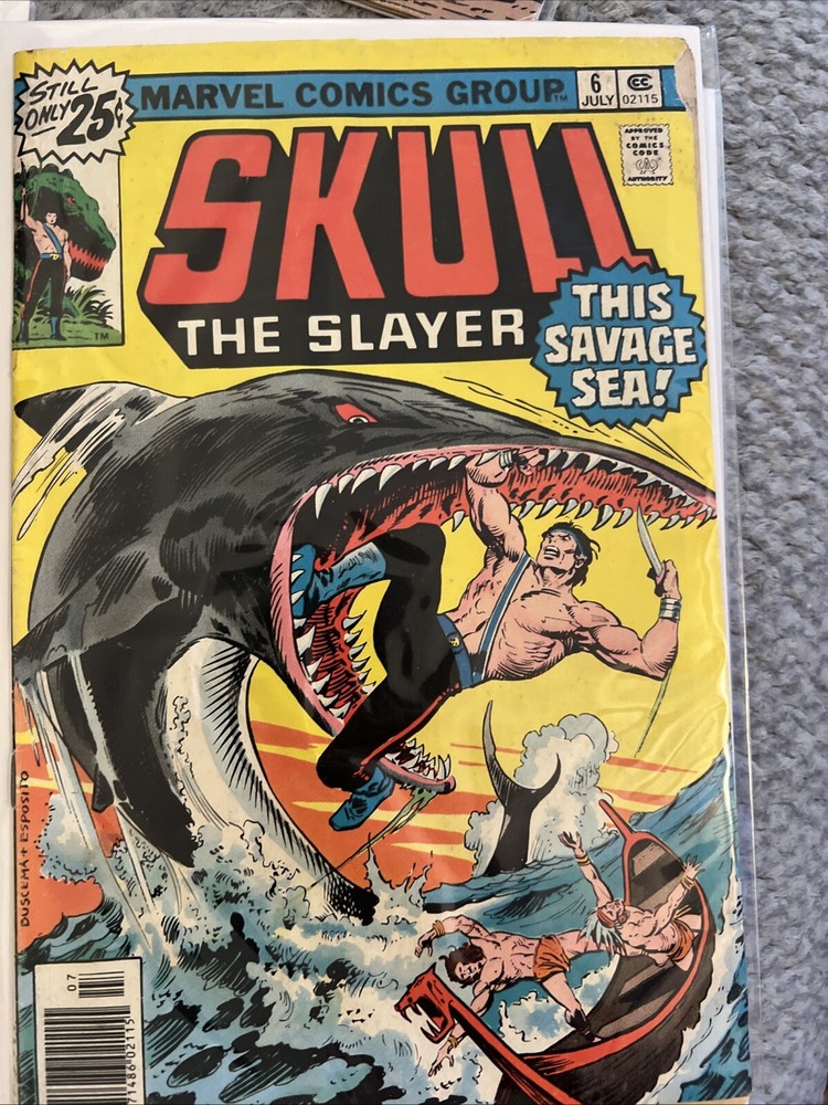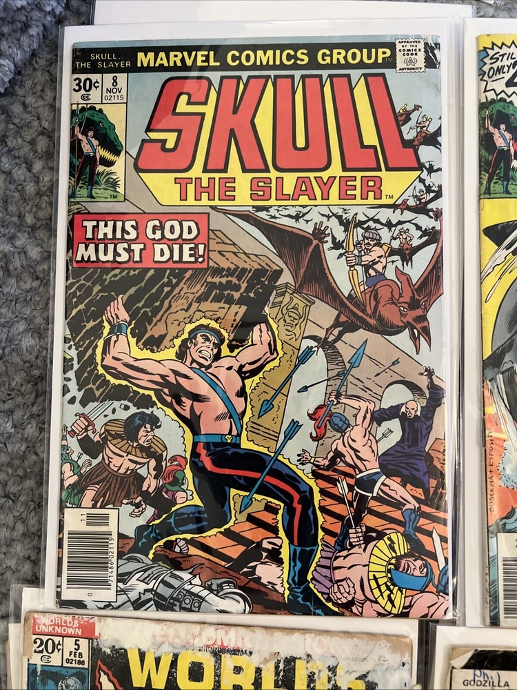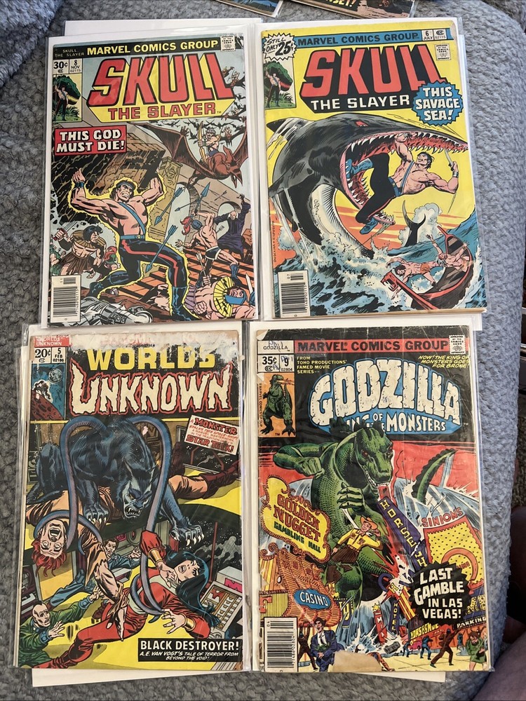 This 1970's Marvel Comics lot includes "Godzilla King of the Monsters" issue #9, reader copy, along with other titles like "Skull # 6 and #8." Written by Doug Moench and illustrated by Herb Trimpe, this comic book features the iconic character Godzilla in the Marvel Universe. Published in 1978 during the Bronze Age of comics, this single issue is a must-have for fans of monster and science fiction genres. The set comes boarded and bagged for preservation. Also a poor reader copy of the classic “Worlds Unknown “ issue 5.