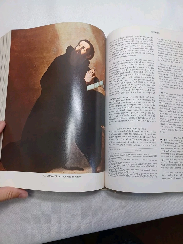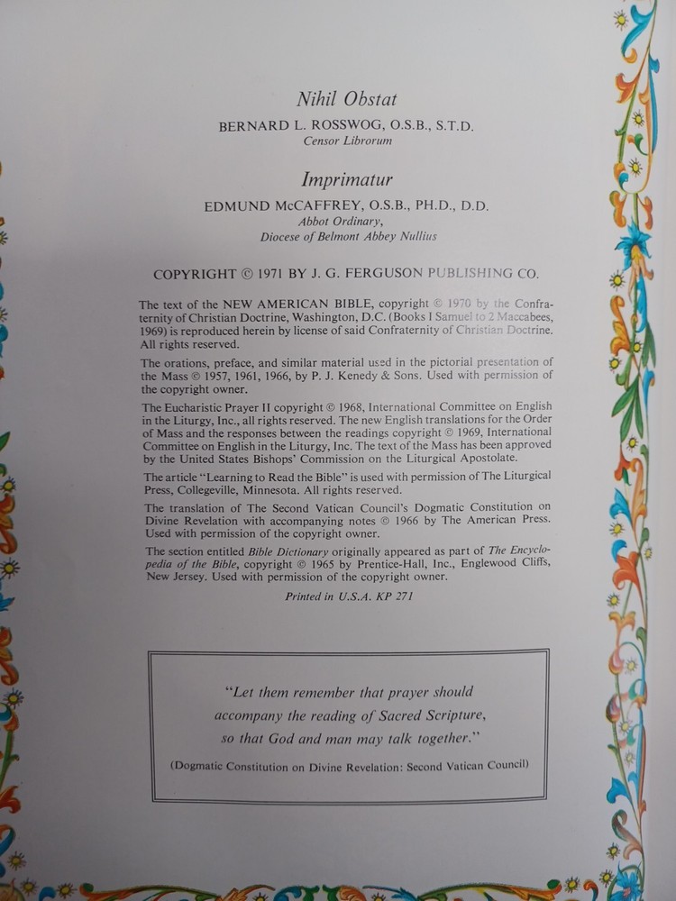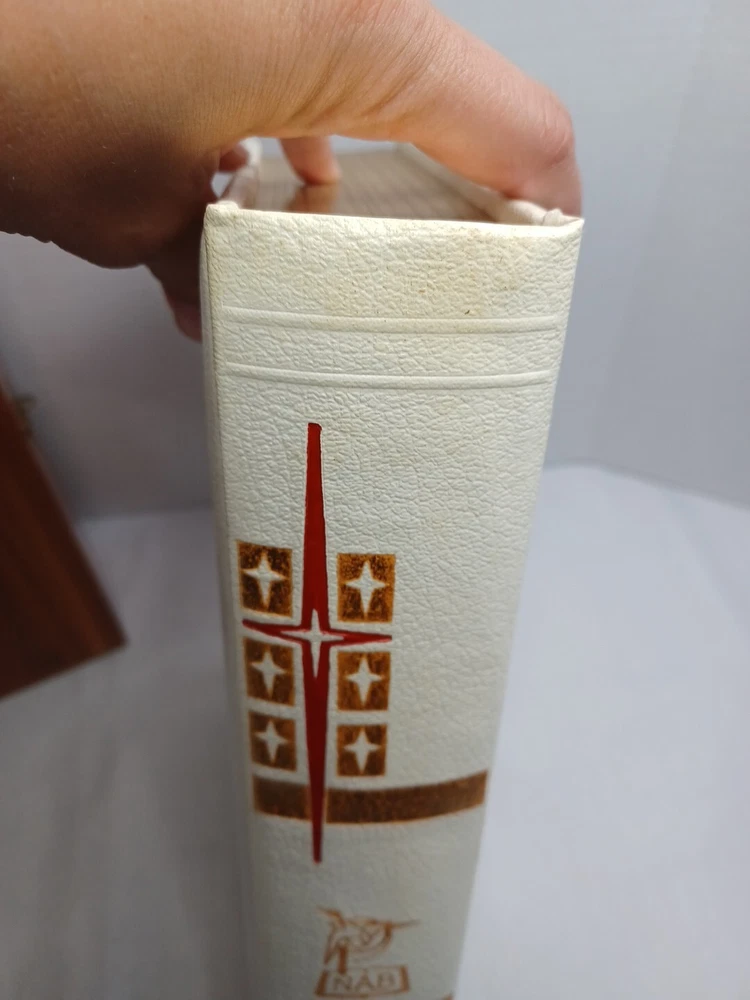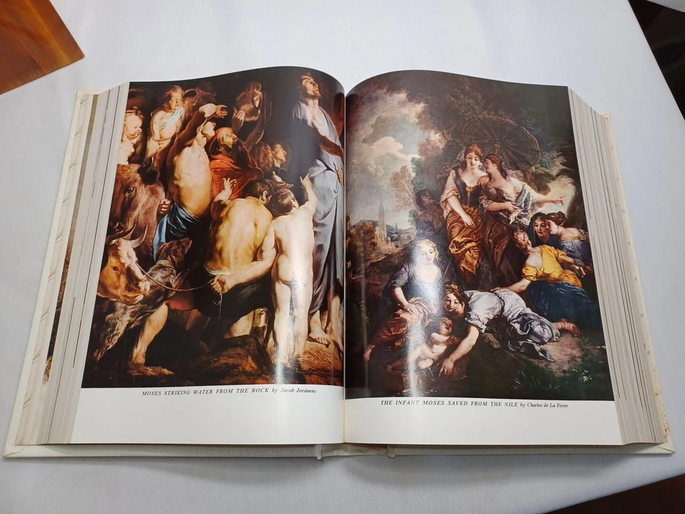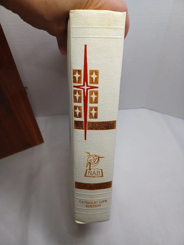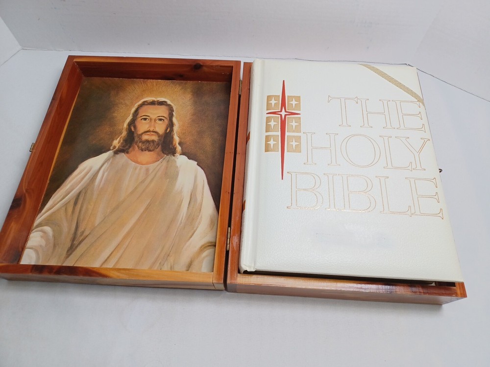 This beautifully illustrated book is a must-have for anyone interested in religious and spiritual topics. The book, titled "The Bible" and published by Catholic Publishers Inc. in 1971, is a part of the Historical book series. It is intended for young adults, ages 9-12, and adults, with its original English language and vintage appeal. This non-fiction book is a great find for anyone interested in spirituality and religion, and it comes in its original wooden box. Illustrated beautifully. ** Previous owner covered engraved name on front. ** See pics please. Empty presentation page however. Some age spots / yellowing on bind and back.