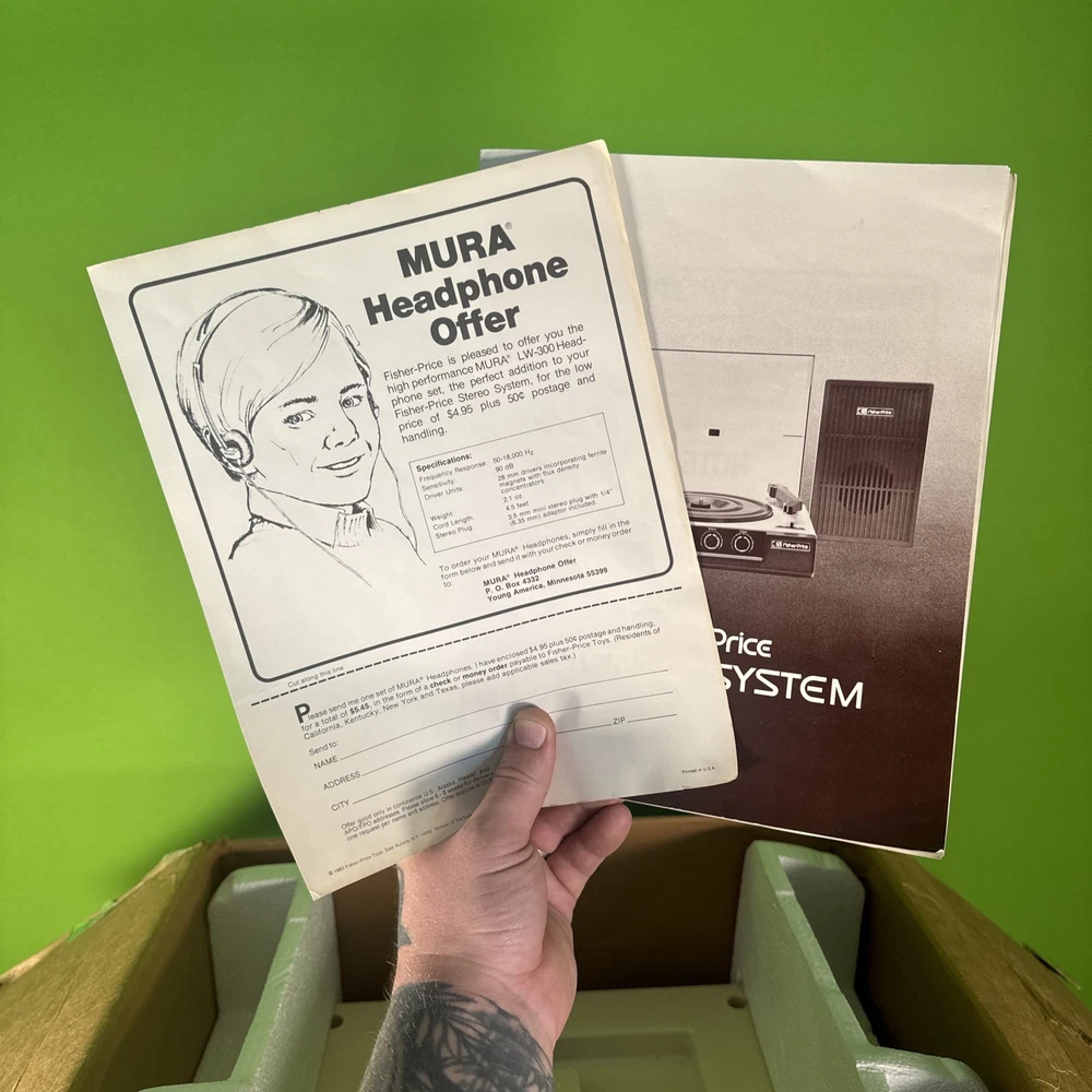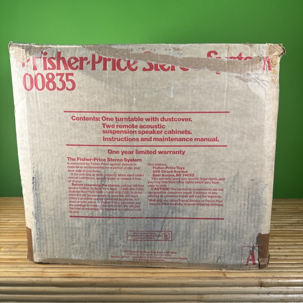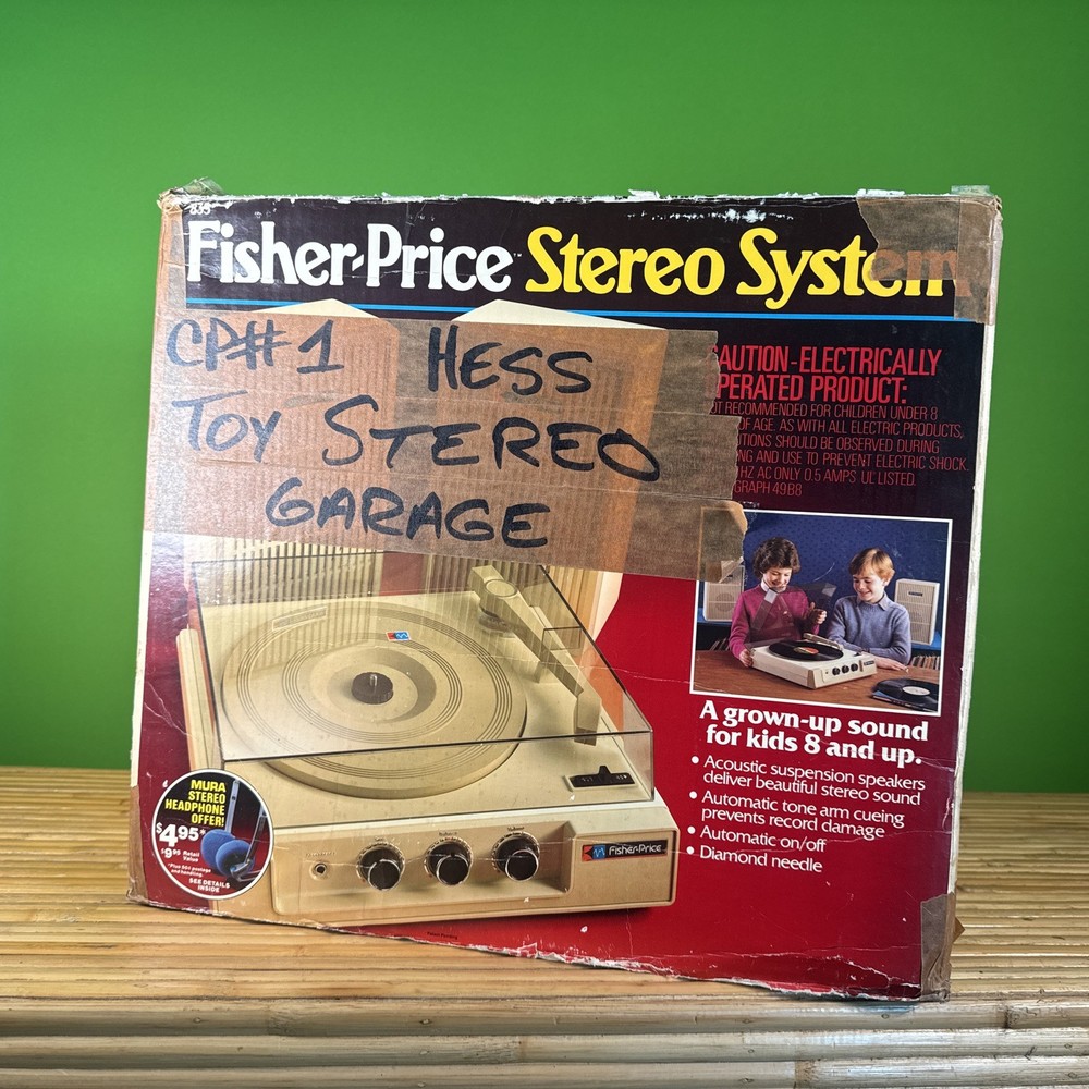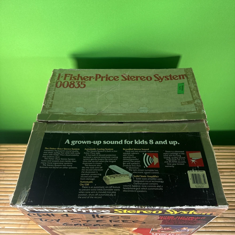 Vintage Fisher-Price Stereo System Model 835 - Retro Turntable Record Player - Complete in Box (CIB) Boxed It is untested but based on the condition it has been very well cared for. Includes all packaging materials, instruction manuals and advertisements! Step back in time with this vintage Fisher-Price Stereo System Model 835, a charming and functional piece of 1980s nostalgia! Designed for kids 8 and up, this iconic turntable brings “grown-up” sound in a durable and kid-friendly package. Whether you’re a collector of retro electronics, a vinyl enthusiast, or simply looking to share a blast from the past with a new generation, this classic stereo system is a fantastic find. Item Details: • Brand: Fisher-Price • Model: 835 • Type: Stereo System / Turntable • Original Box Included: Yes • Condition of Box: Fair vintage condition with visible wear, tape, and handwritten labeling (“CD#1 HESS Toy Stereo Garage”) • Age Recommendation: For kids 8 and up • Color: Beige with vintage red packaging accents Features: • Acoustic suspension speakers for clear, stereo sound • Automatic tone arm cueing to help prevent record damage • Automatic on/off switch • Diamond needle • Compatible with standard vinyl records • MURA stereo headphone mail-in offer sticker still present on box (note: offer is expired) Condition Notes: • This item is UNTESTED and being sold as-is. • The box has wear consistent with age, including corner wear, tape, and marker writing. • Please refer to photos for condition and detail. Whether you’re looking to complete a vintage Fisher-Price collection or searching for a display-worthy retro turntable, this Stereo System 835 is a rare gem that captures the fun and style of its era. Ships carefully packed with tracking.