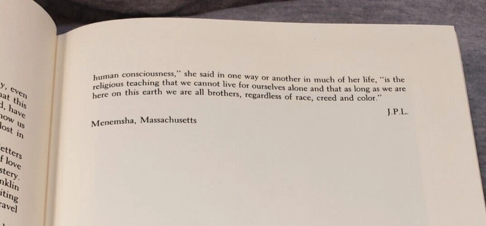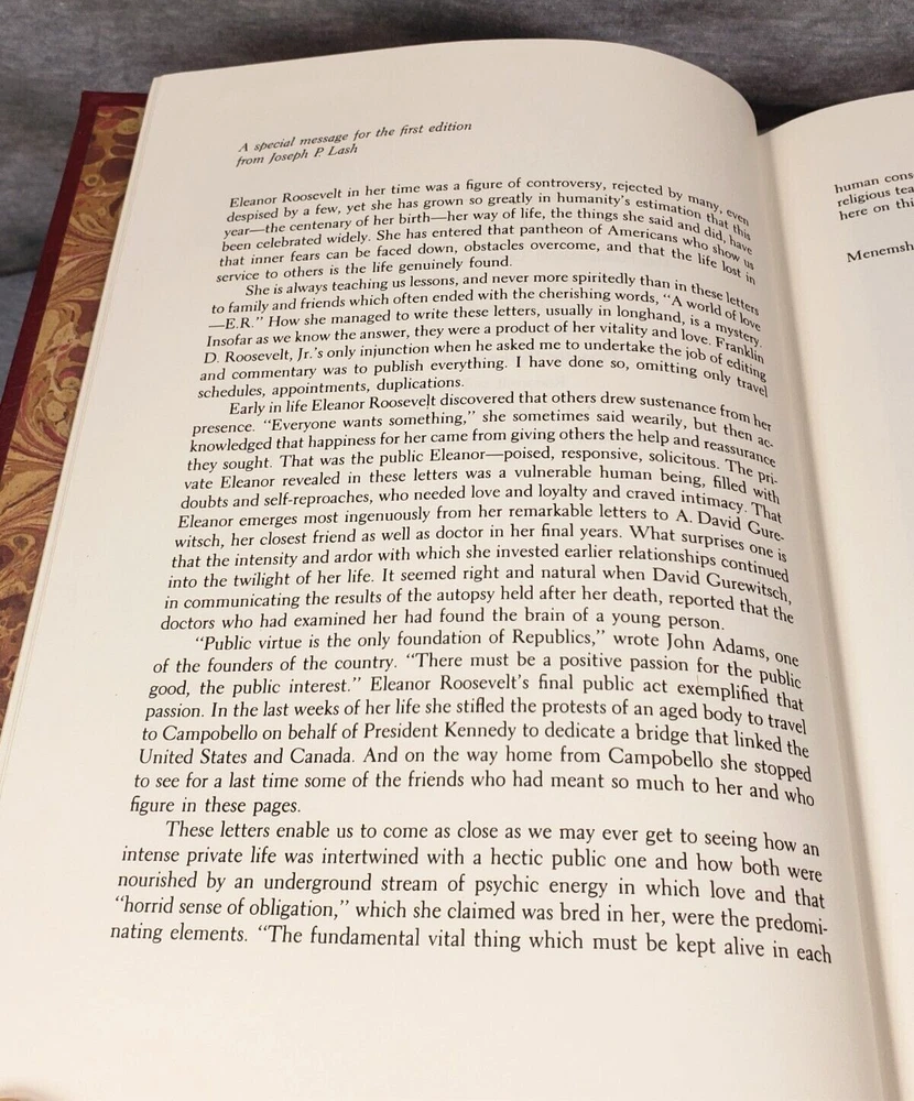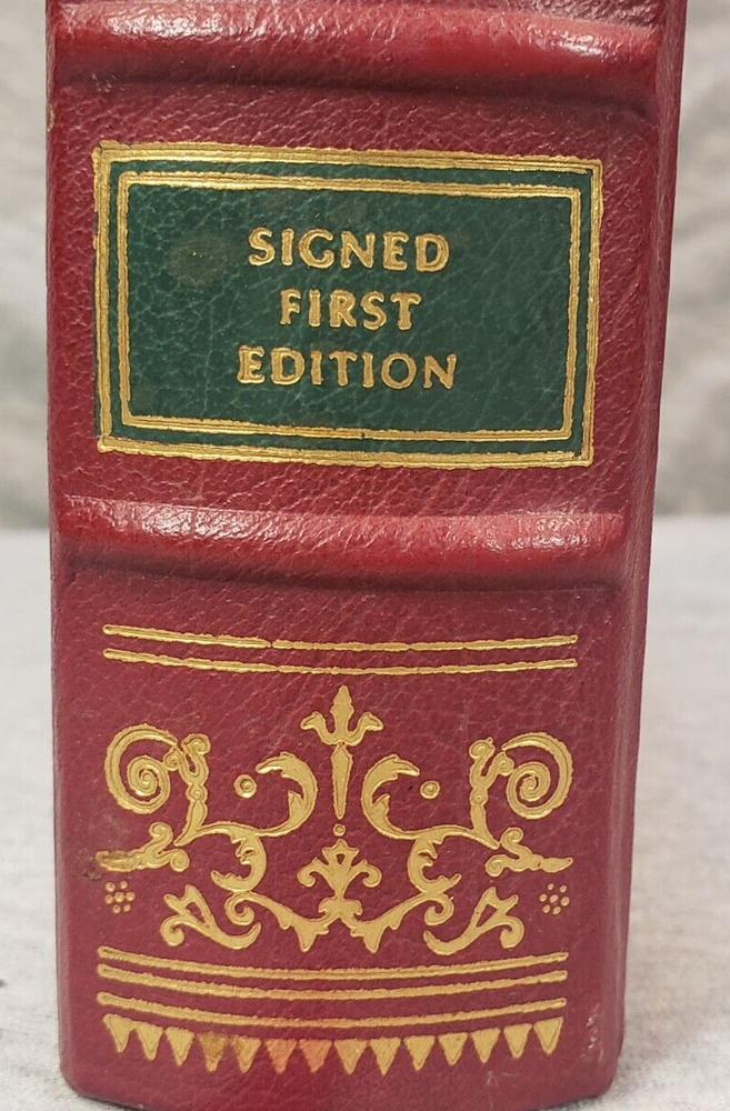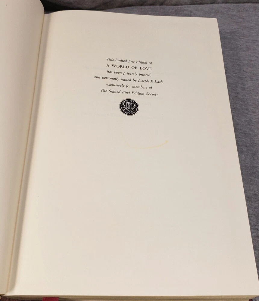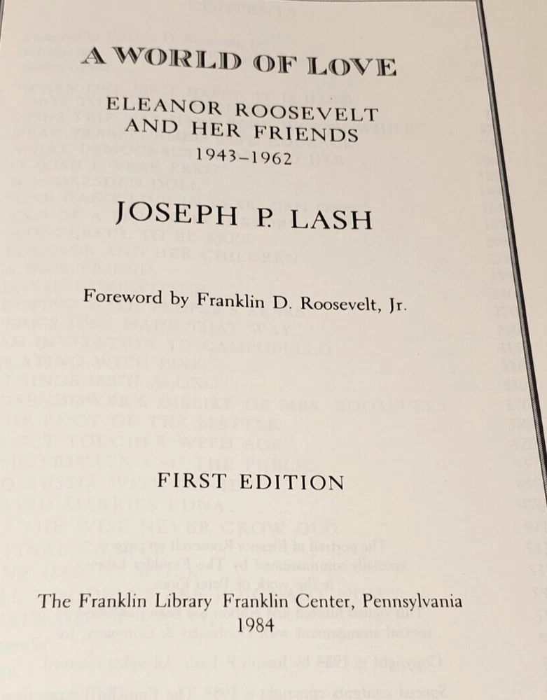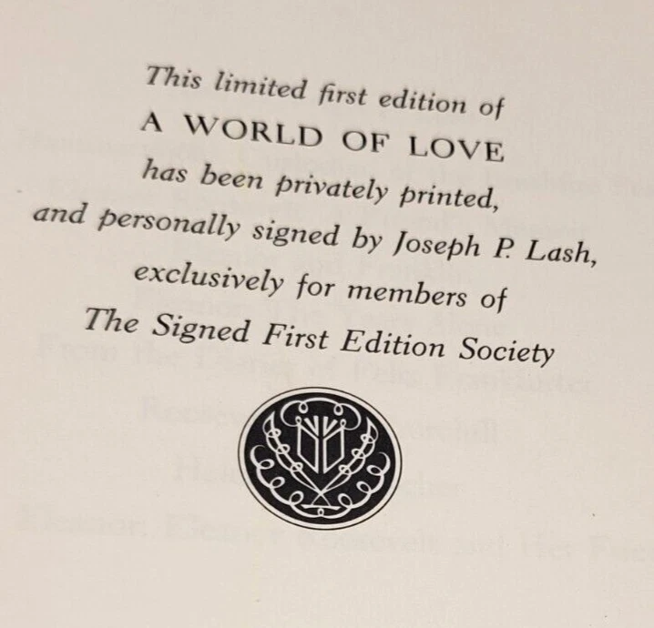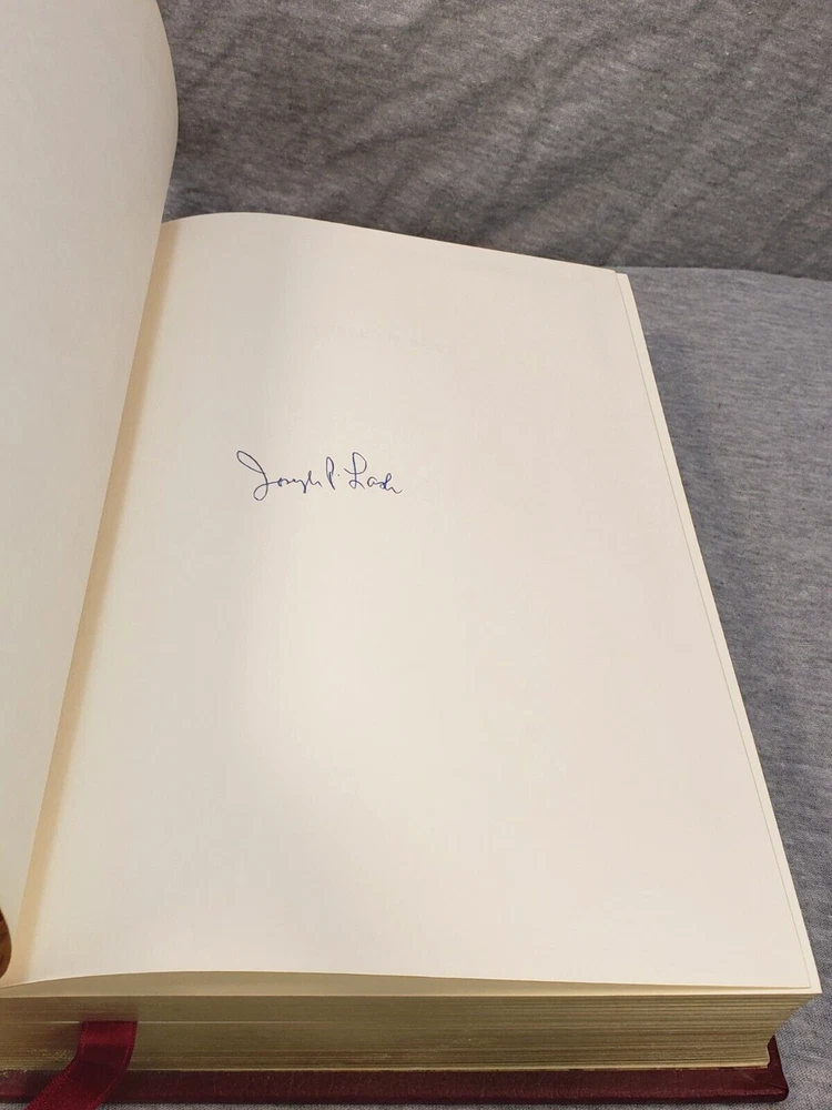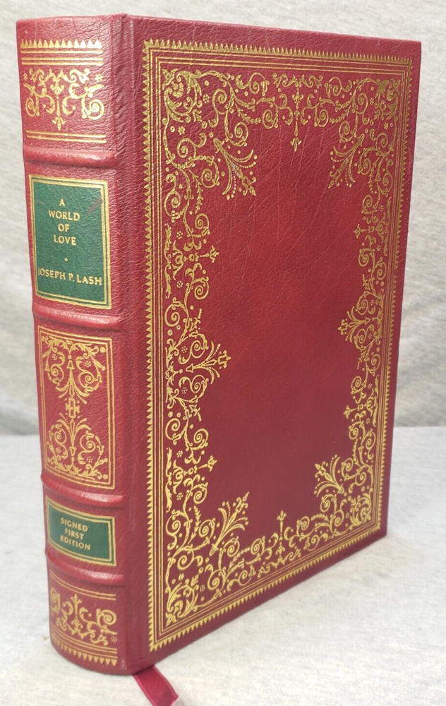 Item up for sale is an incredible signed limited first edition book in leather binding titled "A Word Of Love: Eleanor Roosevelt And Her Friends 1943-1962" by Joseph P. Lash. Book was published in 1984 by Franklin Library as an exclusive for members of the Signed First Edition Society. Book has 610 numbered pages with a tight binding and attached cloth bookmark. Leather covers and spine show gold tone to the lettering and ornamental design. Surfaces of the cover boards show some spots of light soiling and wear. Pages shows a gold tone to the exterior edges. Book is signed by the author on an otherwise blank pre title page. Book measures 9-1/2" top to bottom by 6-5/8" wide by 1-3/4" in depth. Amazing book that comes fresh to the market. If you have any questions please feel free to ask. We are pleased to offer a 14 day, no questions asked return policy. If you don't like an item for any reason just contact us a.s.a.p. and just mail it back to us and you get a full refund of your purchase price. It's as simple as that. We know full well the value of every cent so any item over $50 will be shipped insured to provide you with the greatest protection and leave you with no risk. Due to the rising cost of shipping supplies we have been forced to follow many other professional sellers in charging a handling fee. Fee is estimated based upon costs of previous items we have shipped that are in the size and shape range of this item with consideration given to how fragile the item will be to ship. Payment in full is expected within 7 days of the end of a listing. Items not paid for will result in the item being relisted and being blocked from future bidding or buying. We accept Paypal along with various other forms. Please note that items paid for by personal or business checks will require a mandatory waiting period of 7 business days prior to the item being shipped. We welcome bidders and buyers from all over the world but we cannot and will not lie on customs forms as this leaves all parties involved open to legal trouble. Feedback is left within 3 business days of the item being shipped. We appreciate your feedback and 5 star ratings. If you have a question or concern please be sure to contact us before leaving feedback. 4092