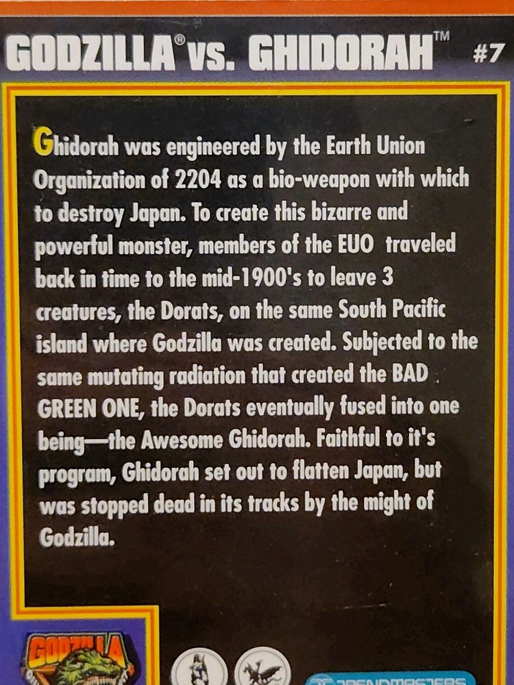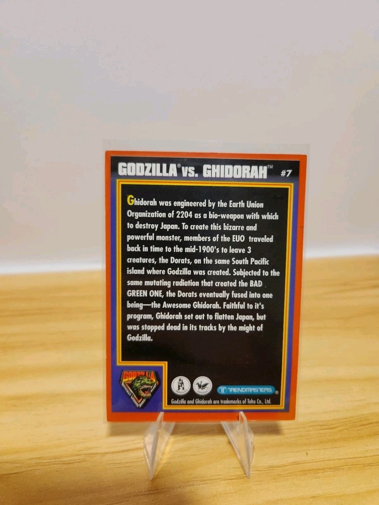 Dive into the world of classic monster collecting with the 1994 Trendmasters Godzilla King of the Monsters card #7, featuring the iconic showdown between Godzilla and Ghidorah. This collectible hails from a beloved franchise and captures the essence of action and horror that has captivated fans for decades. A must-have for enthusiasts of comics and cinematic history, this card is a tribute to the gripping battles that define the Godzilla saga. Crafted with quality card stock, this original piece from the 1994 series remains ungraded, preserving its authenticity and allowing you to appreciate its near-mint state. It's a vintage gem that not only highlights the intricate design of Trendmasters' craftsmanship but also serves as a piece of art for those who cherish the genre. Add this classic card to your collection and own a slice of Godzilla's storied legacy. Near mint does not guarantee PSA 10. Card comes as is, no returns.